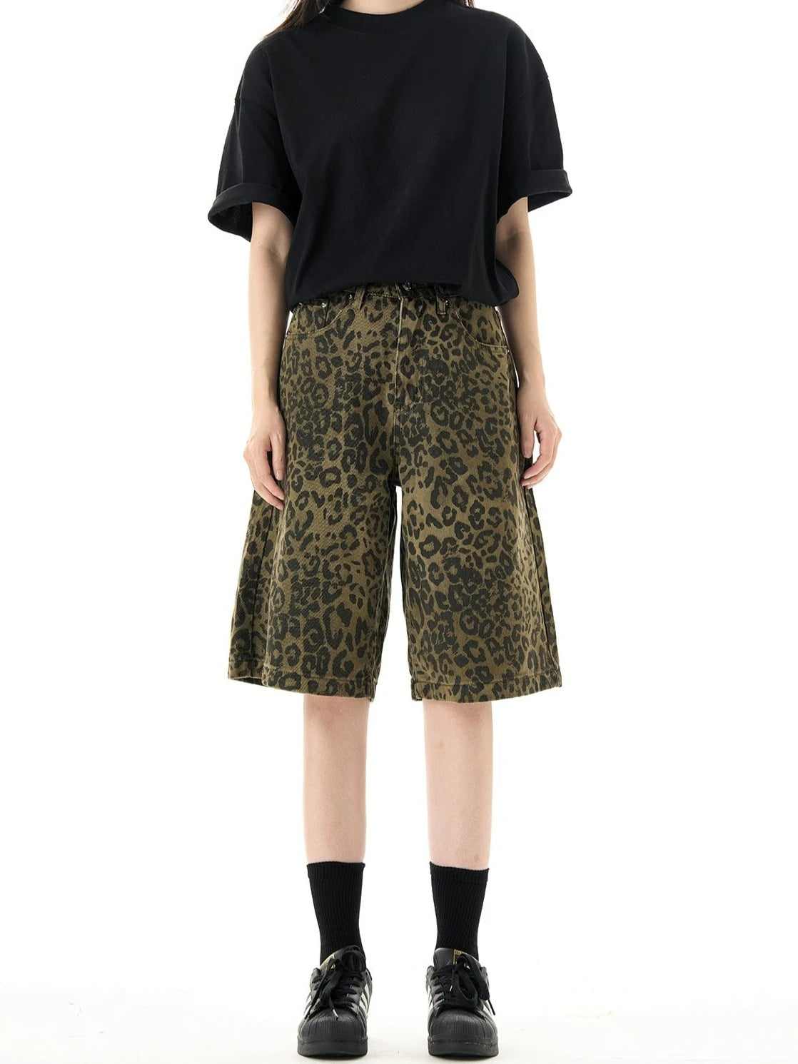 These stylish denim Bermuda shorts offer a high waist and loose straight fit, perfectly blending casual ease with a touch of vintage Americana. The breathable denim fabric is adorned with a striking leopard print, giving your outfit an instant edge while keeping you cool during warm-weather outings. The washed denim finish adds a moody, nonchalant sophistication to this statement piece.