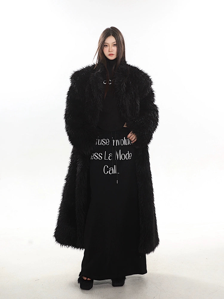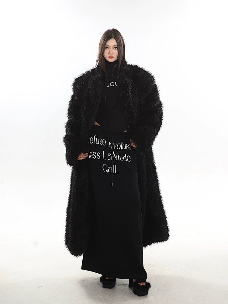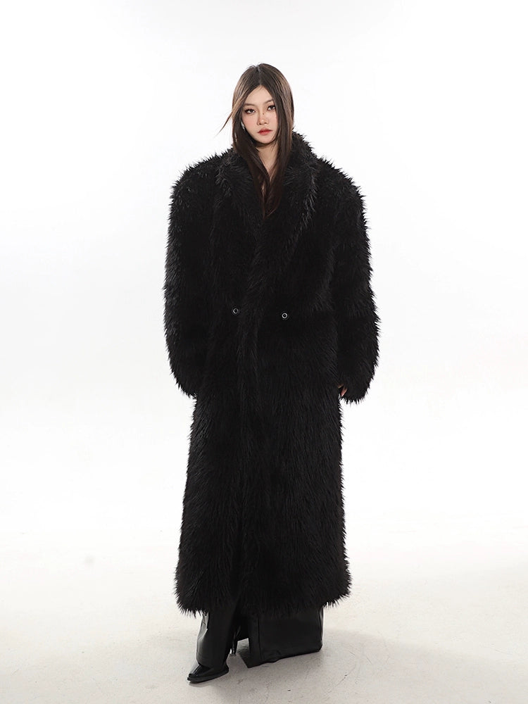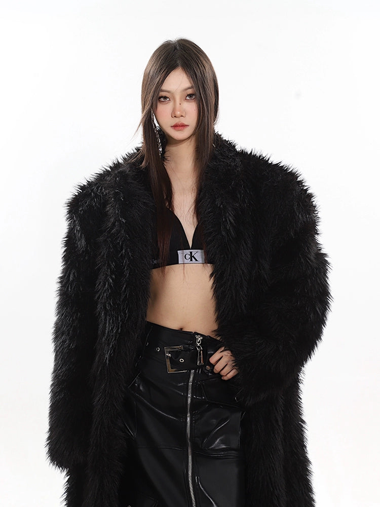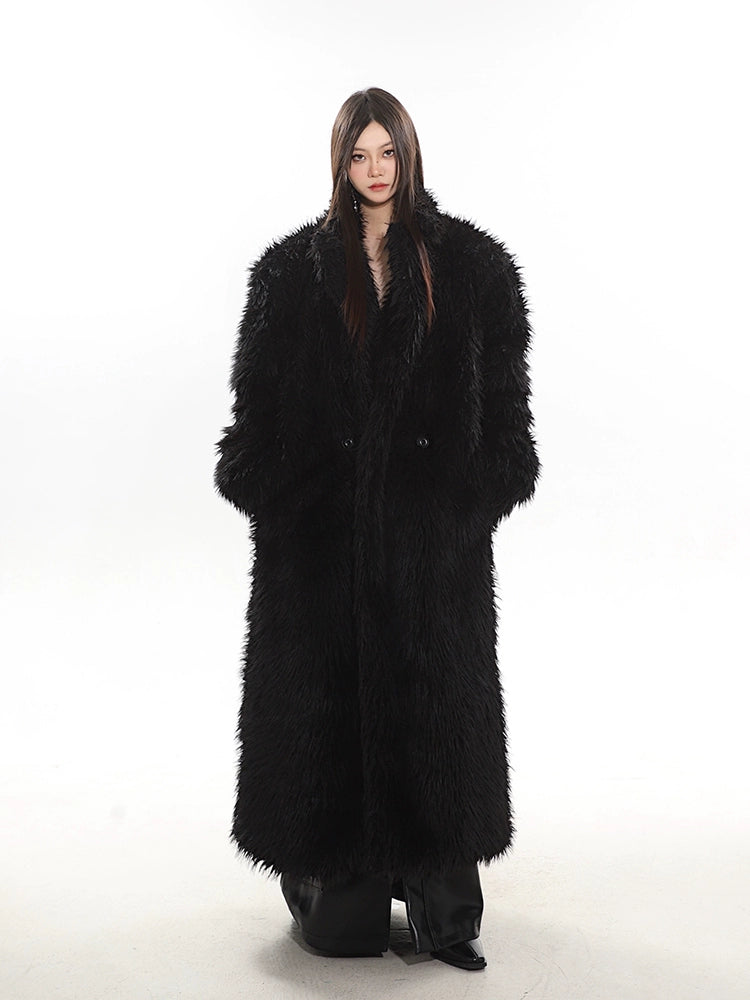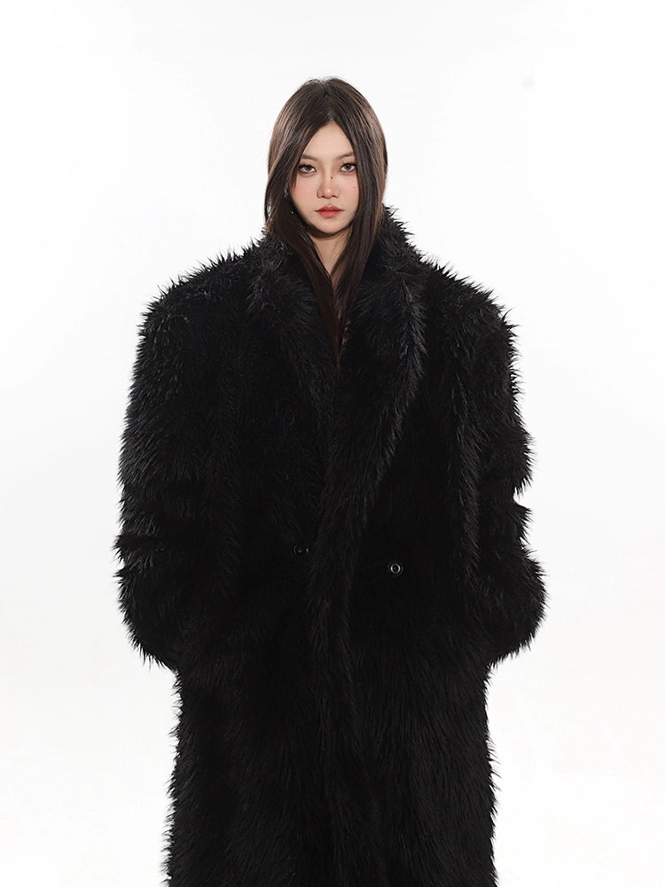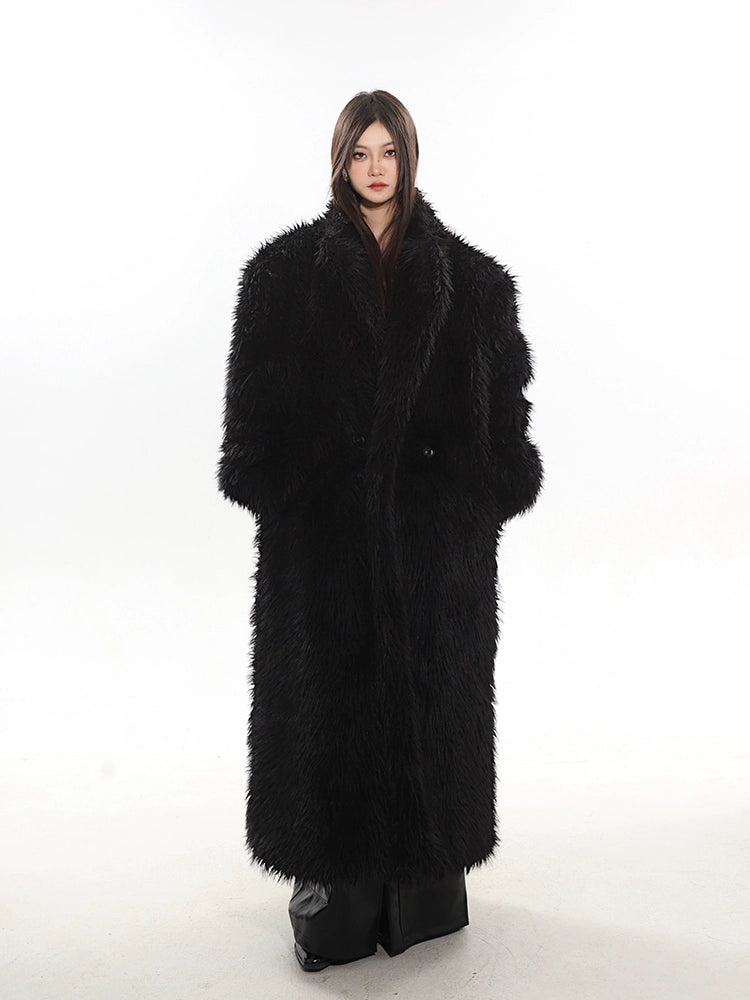 Long Shaggy Faux Fur Coat with Wide Lapels