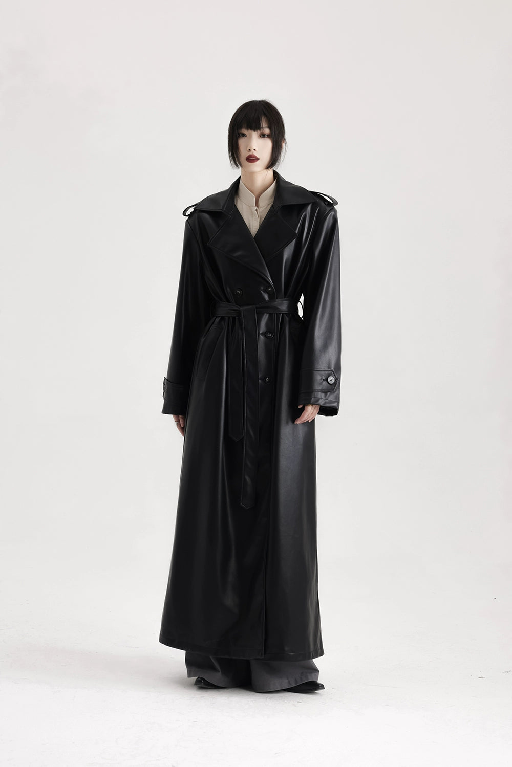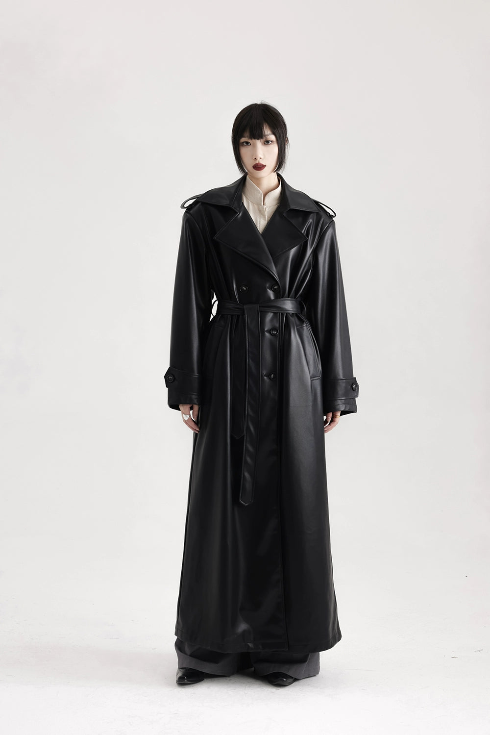 Read full Return PolicySharp lines and a long silhouette set this faux leather trench apart, giving it presence without trying too hard.