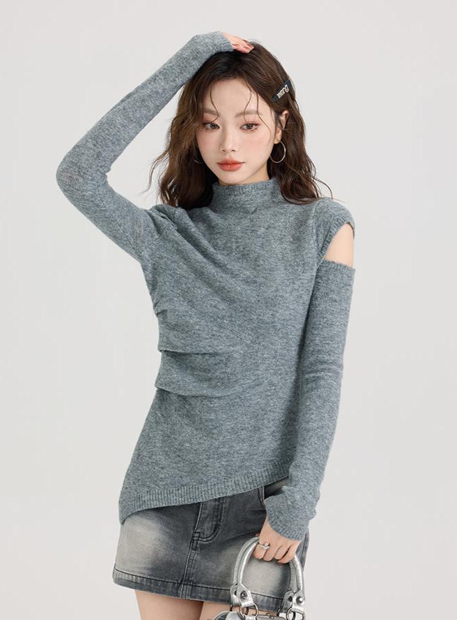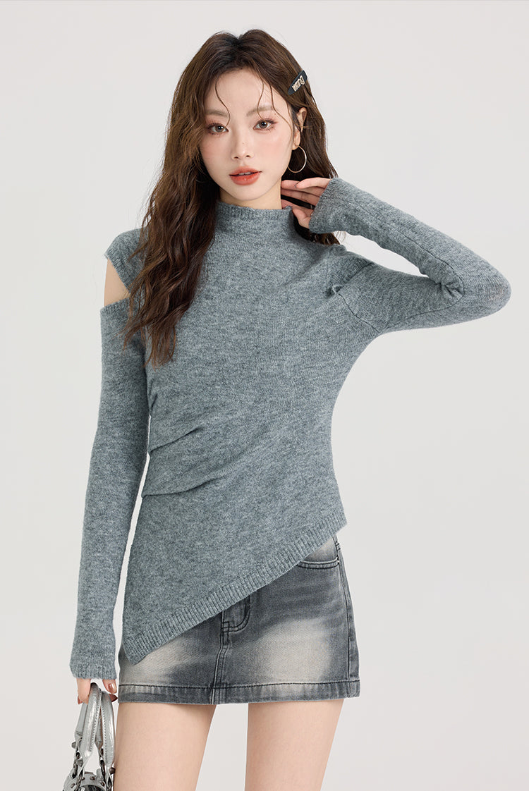 Read full Return PolicyEmbrace asymmetry with the striking Mock Neck Ribbed Hem Asymmetric Cold Shoulder Top.