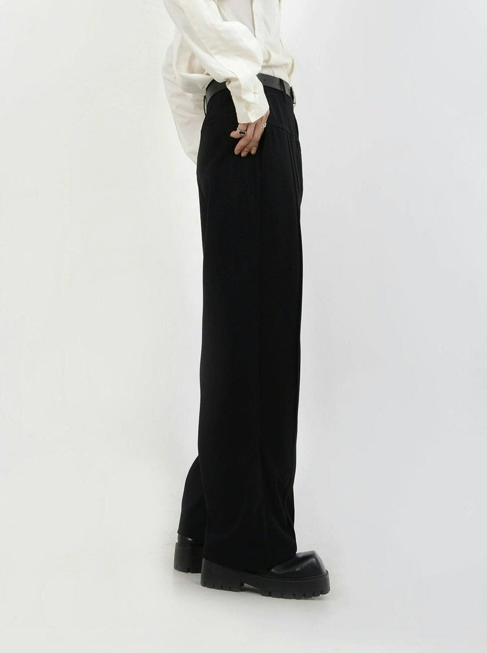 Designed with attention to detail, these trousers feature a high-quality fabric that drapes elegantly, creating a flattering vertical silhouette. The pleated design adds texture and a deconstructed edge, while the included waist detail emphasizes the cinch at the waist, offering both style and functionality.