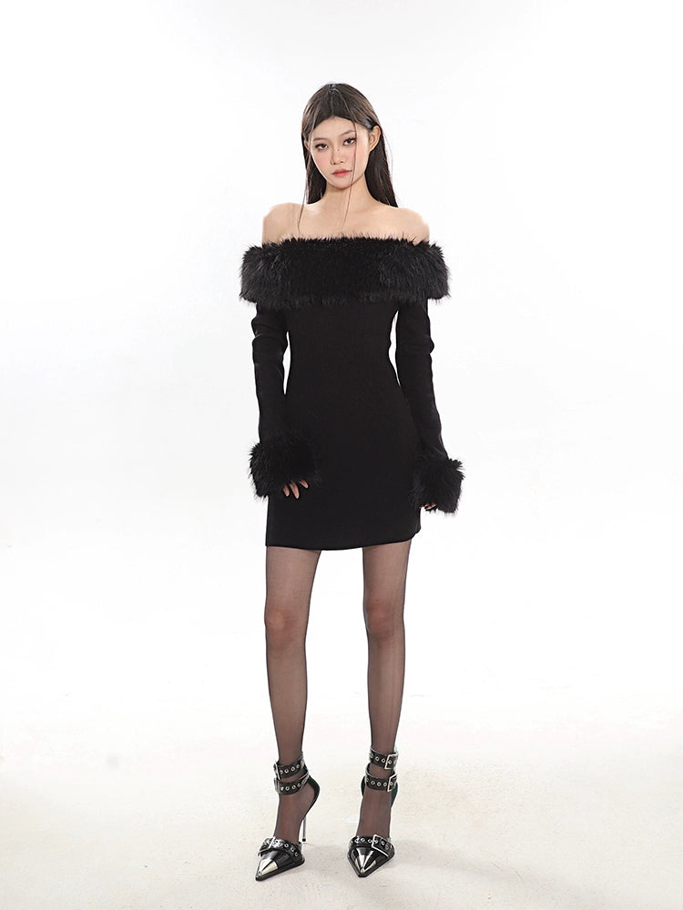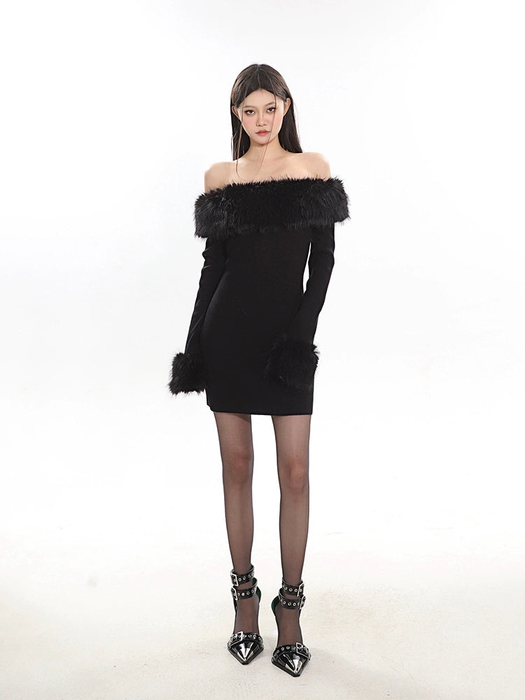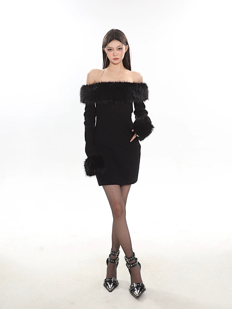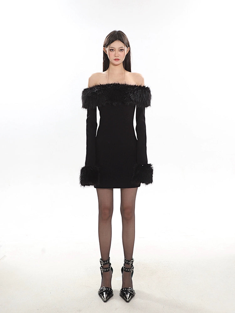 Embrace elegance with a twist in this off-shoulder faux fur trim mini dress, a chic addition to any wardrobe.
