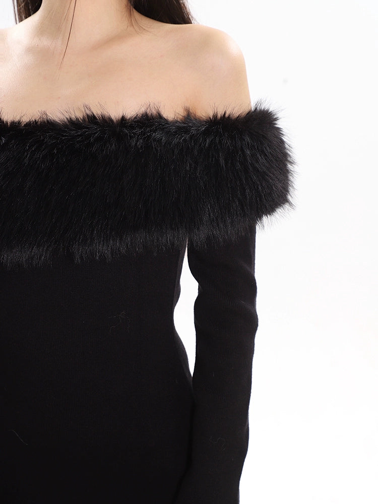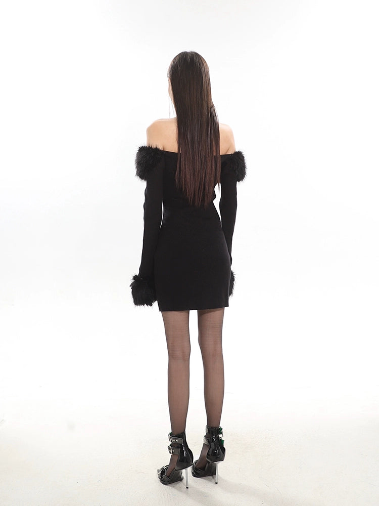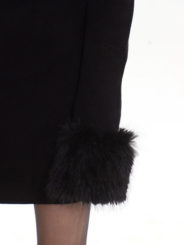 Crafted with attention to detail, this dress features a sleek silhouette, long sleeves, and a playful faux fur trim that graces the shoulders, adding a touch of glamour. The fabric composition prioritizes comfort and style, ensuring a flattering fit for those evenings out or special events.