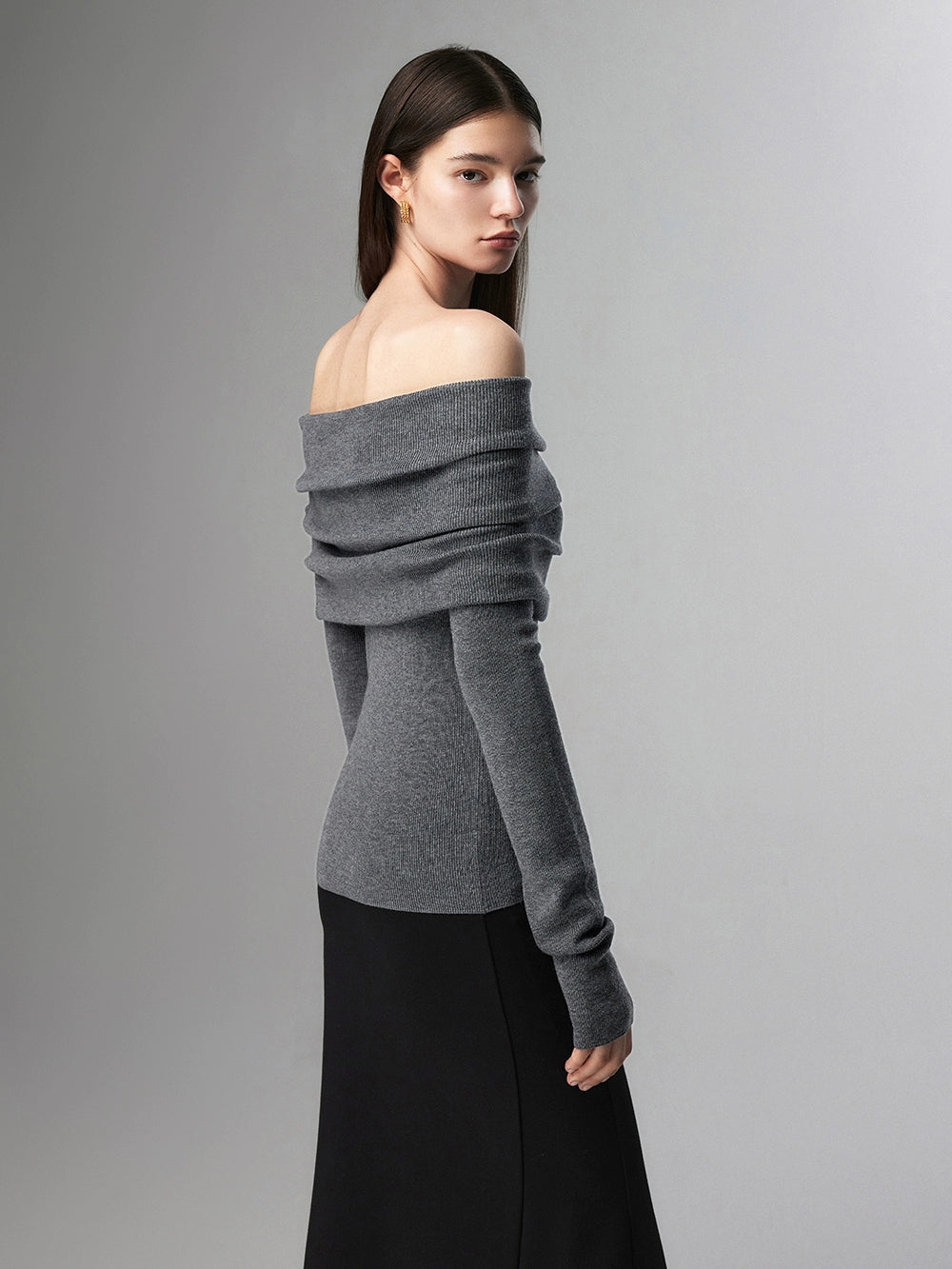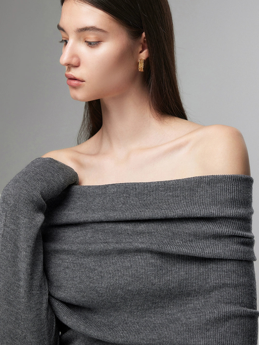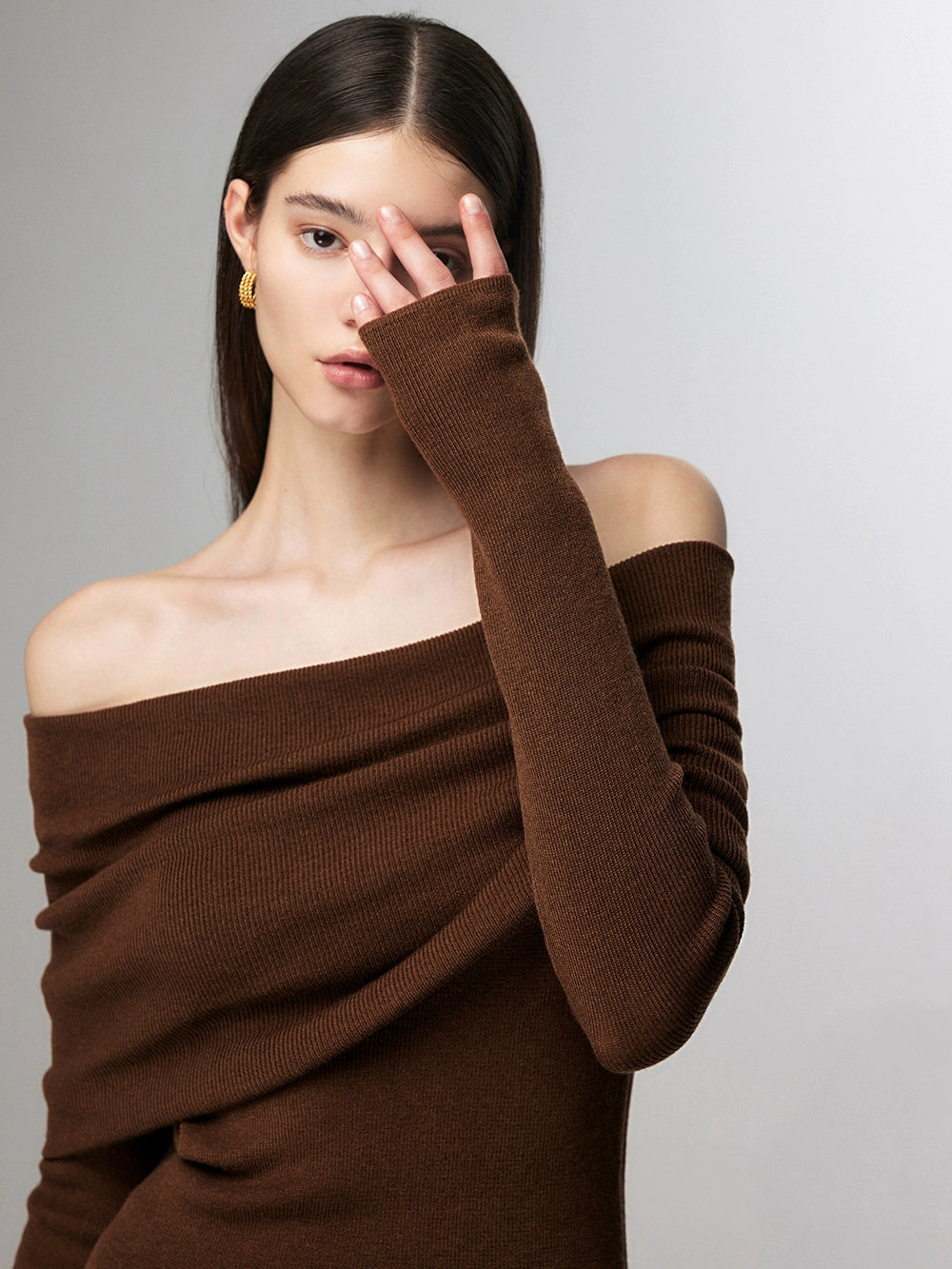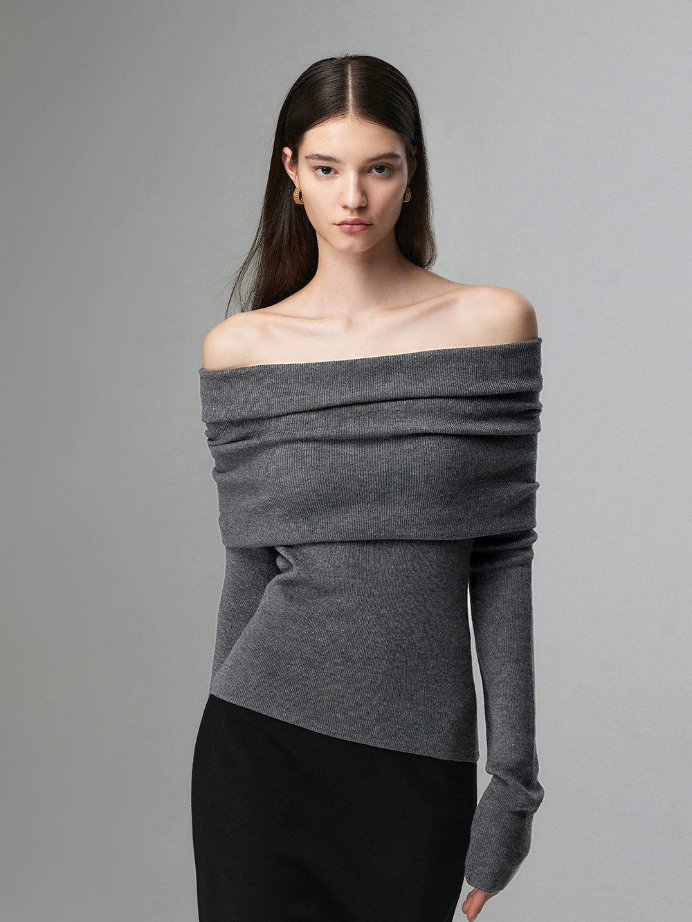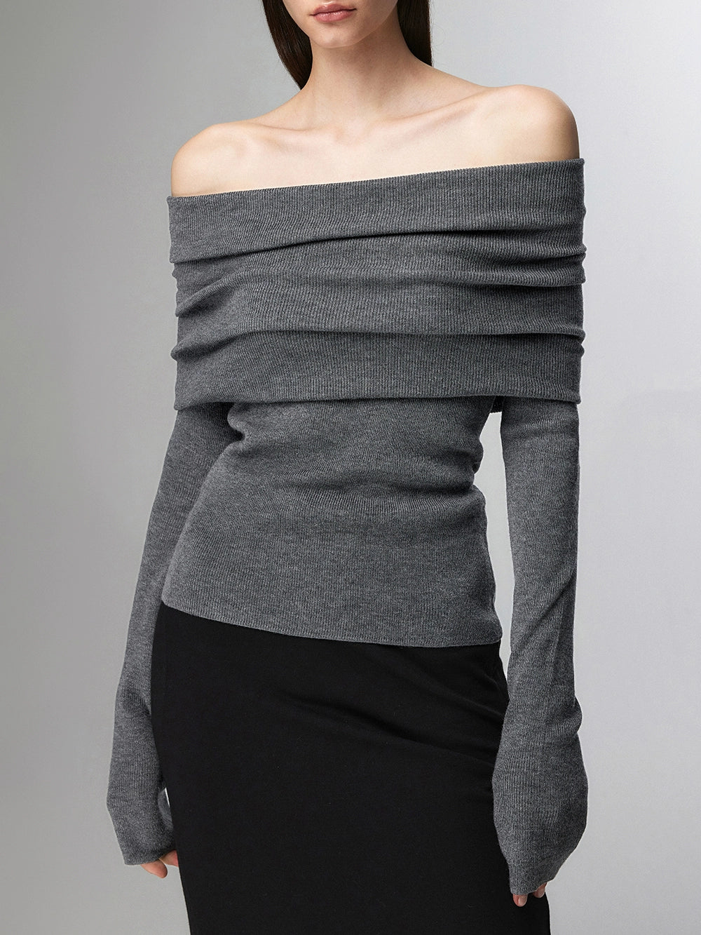 Off-Shoulder Ribbed Knit Layered Long Sleeve Sweater