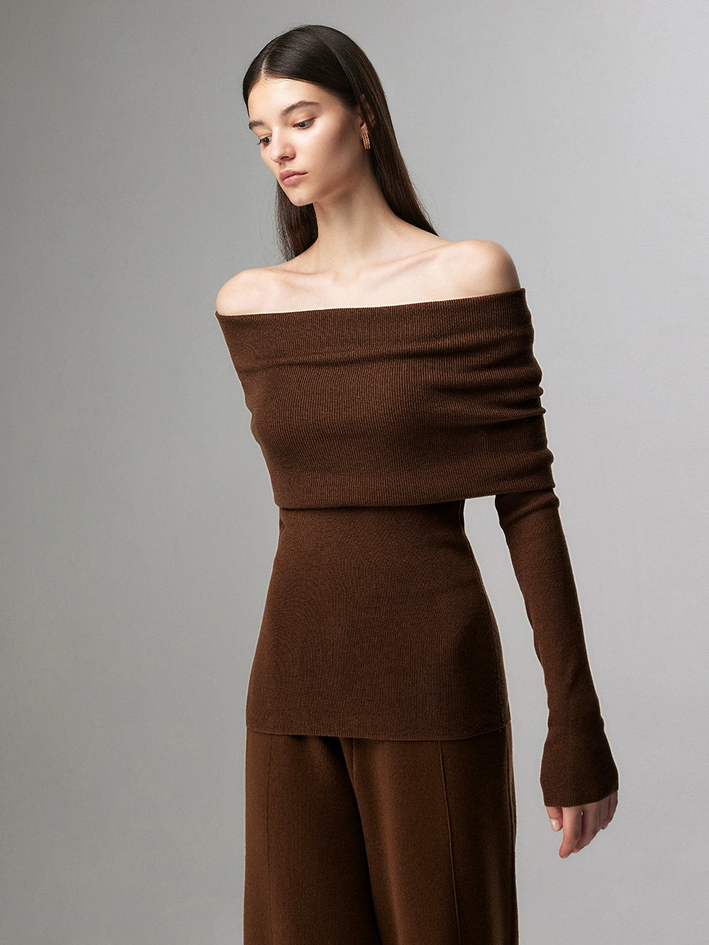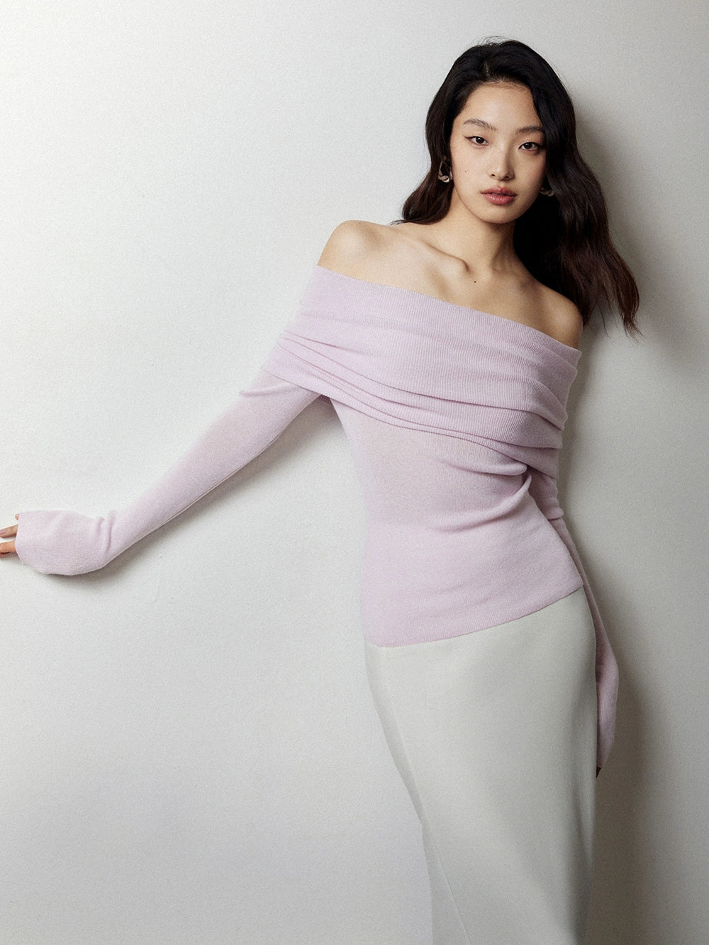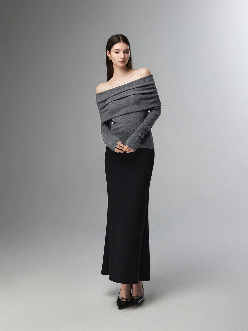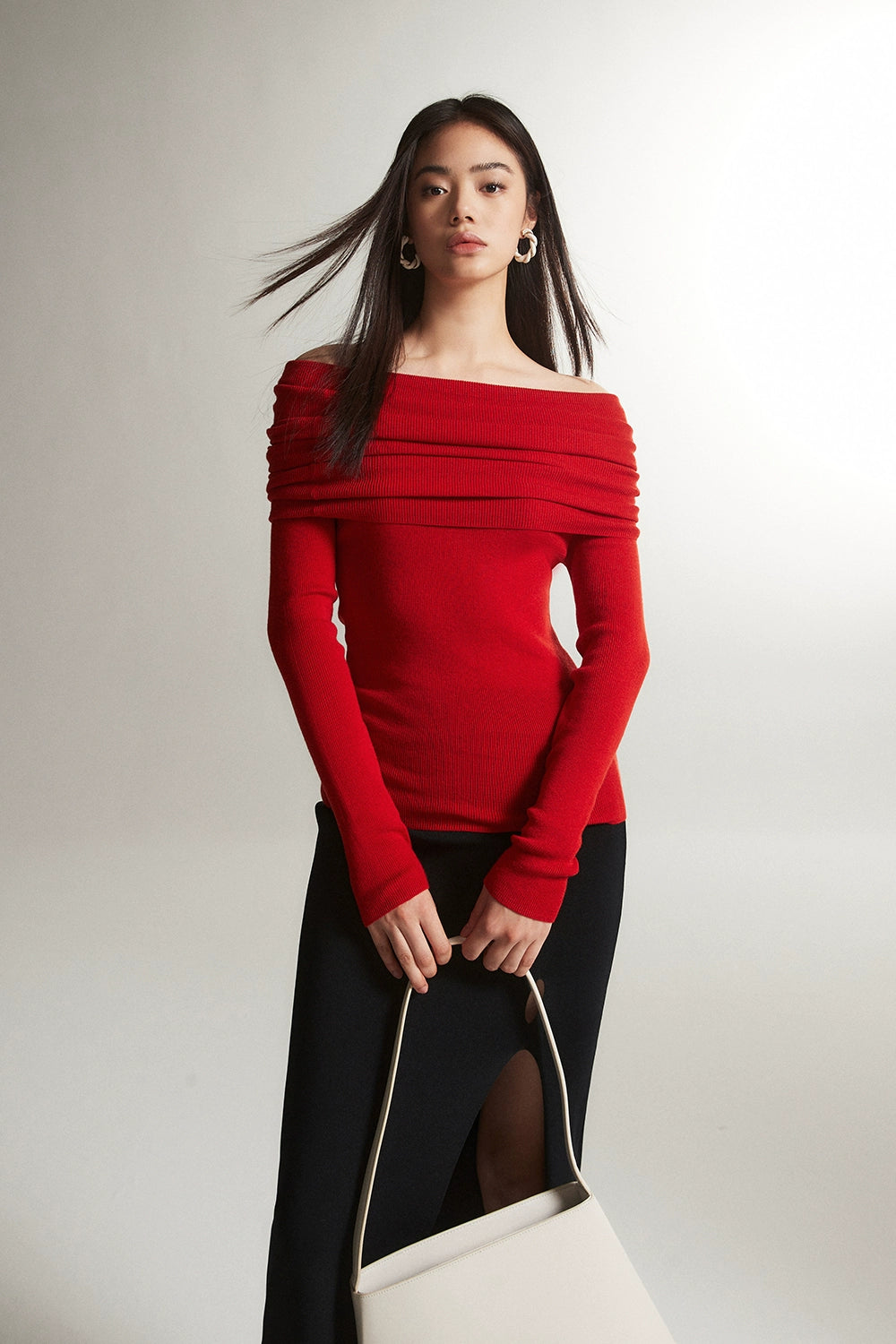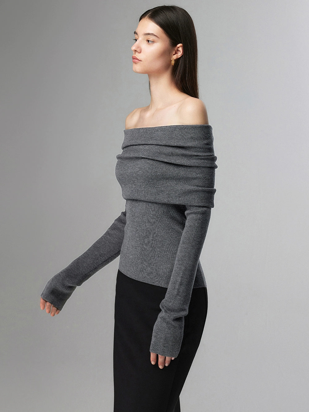 Off-Shoulder Ribbed Knit Layered Long Sleeve Sweater