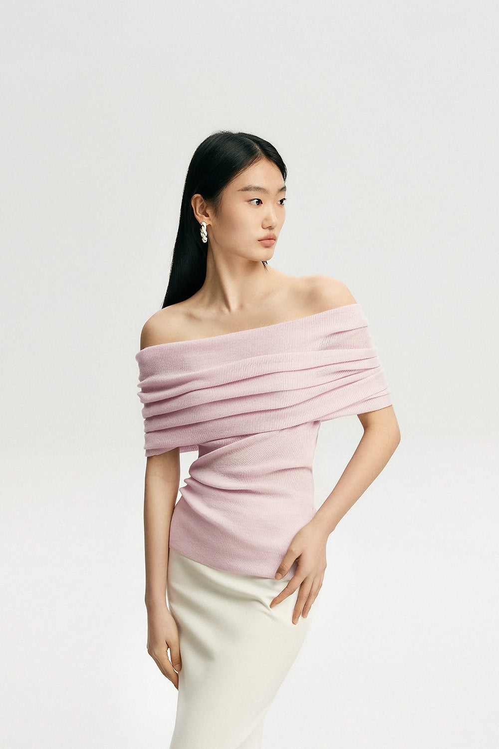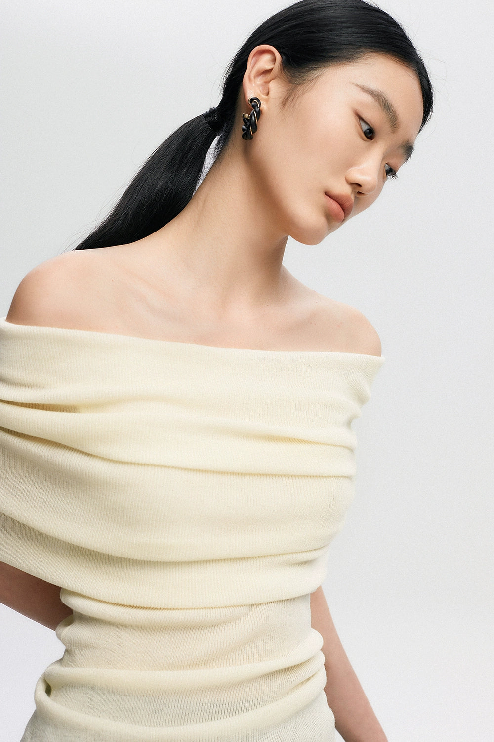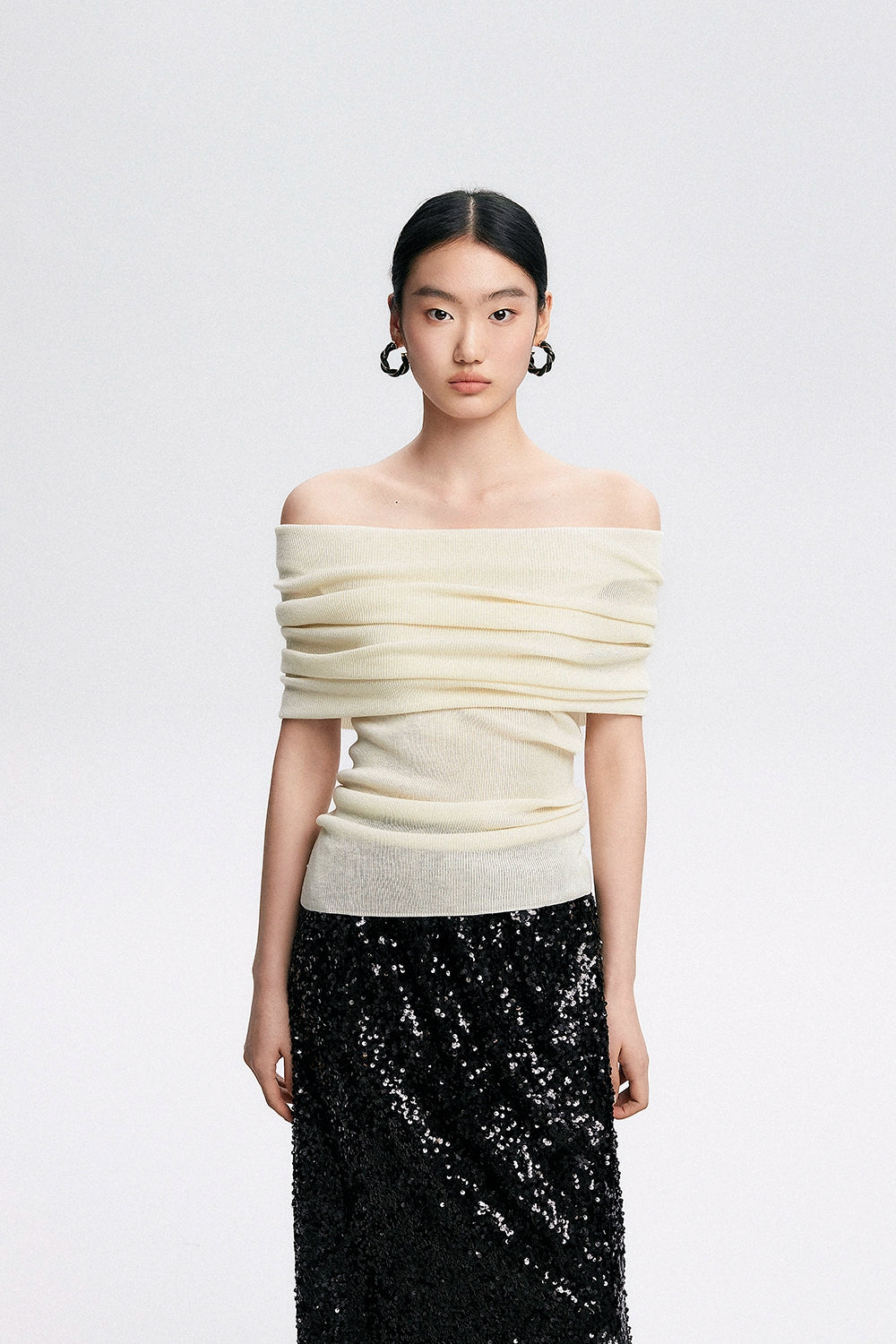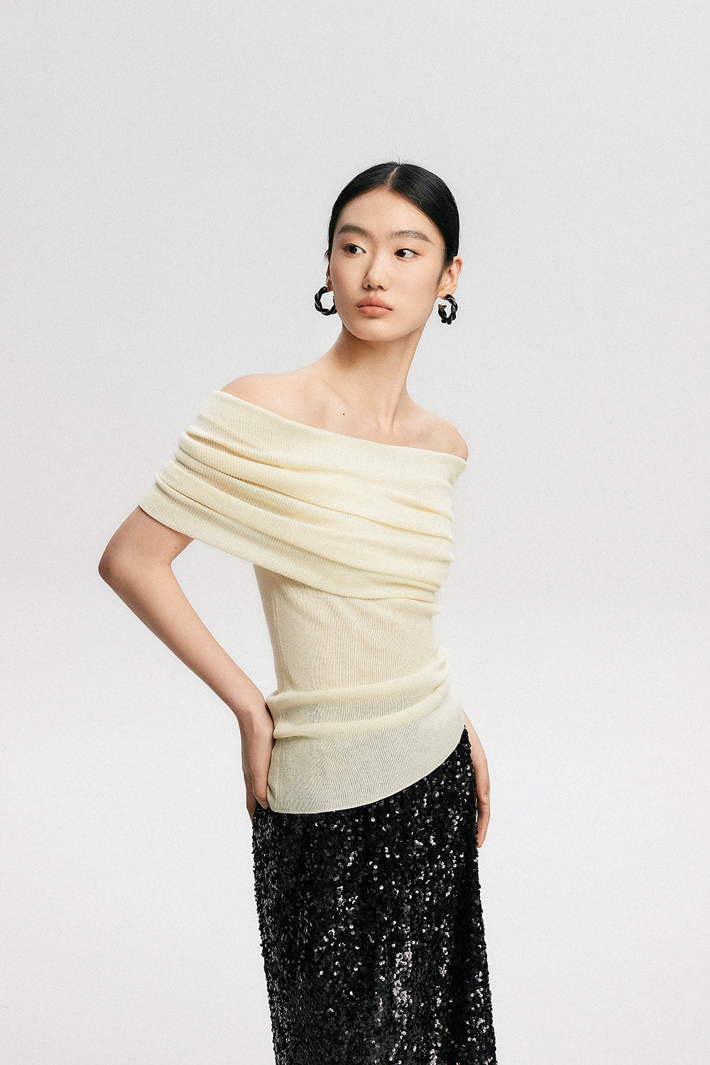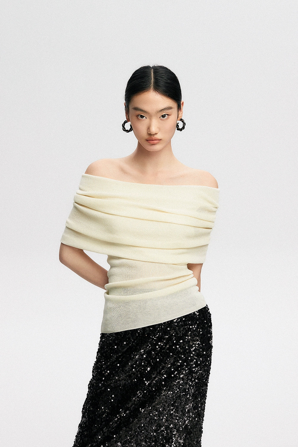 Crafted with a blend of polyester, acrylic, nylon, and a touch of cotton wool, this top features a ribbed knit pattern that accentuates your silhouette softly. Its off-shoulder design can be worn as a subtle hint of allure or adjusted to create a stunning neckline, making it a canvas for self-expression and style.