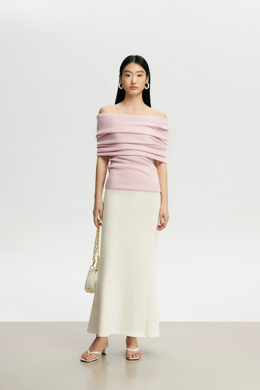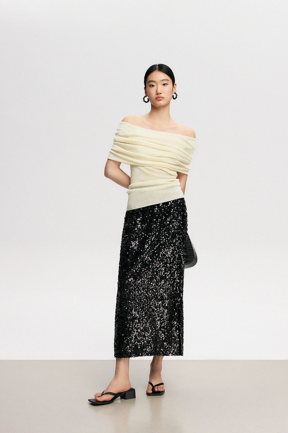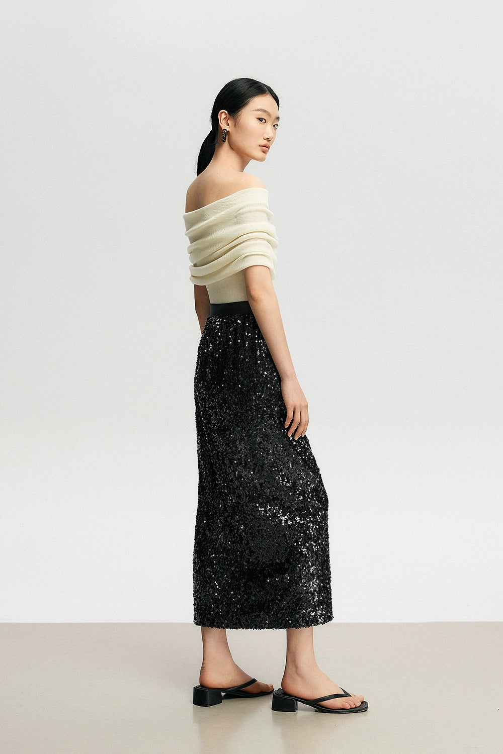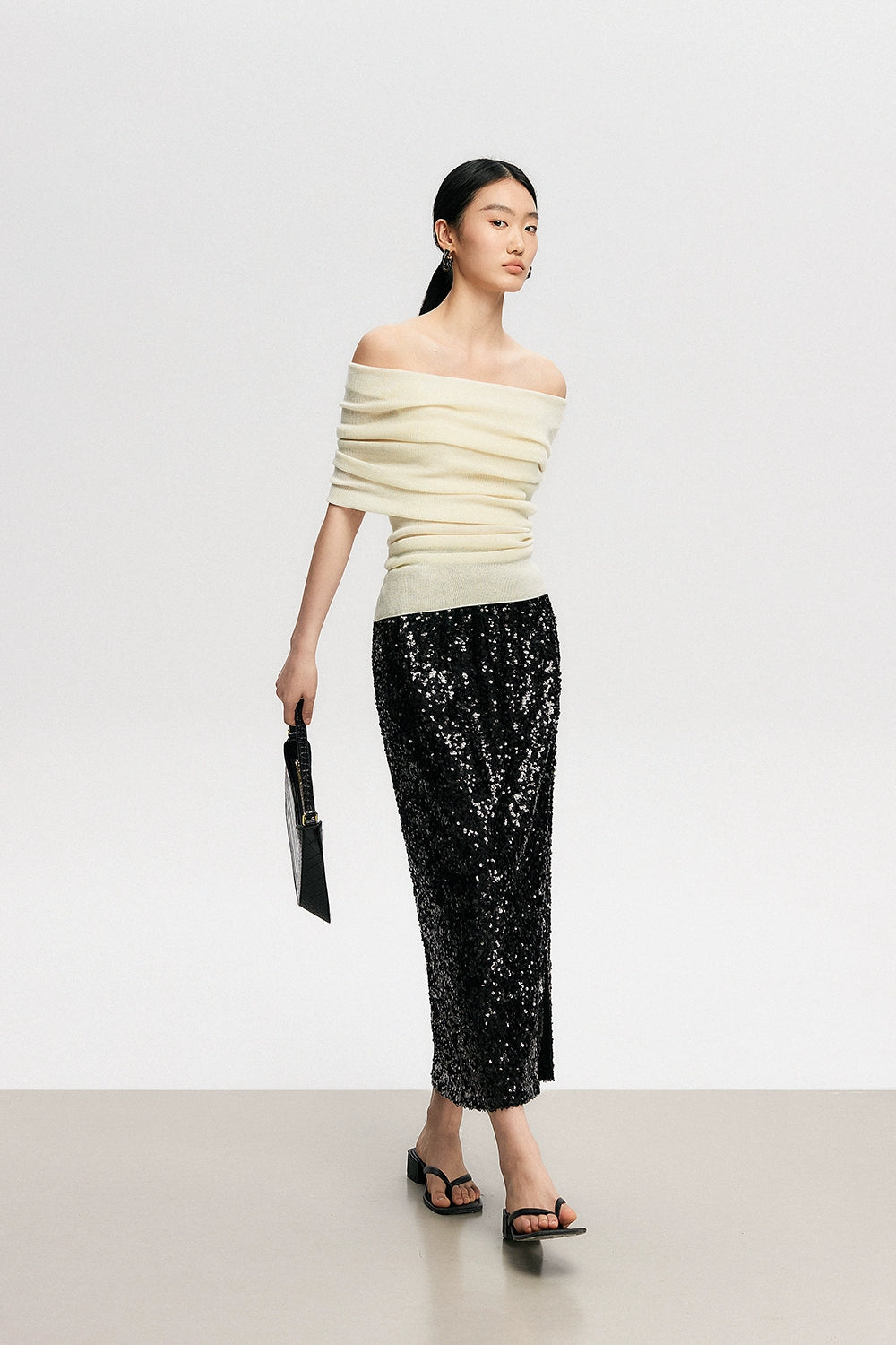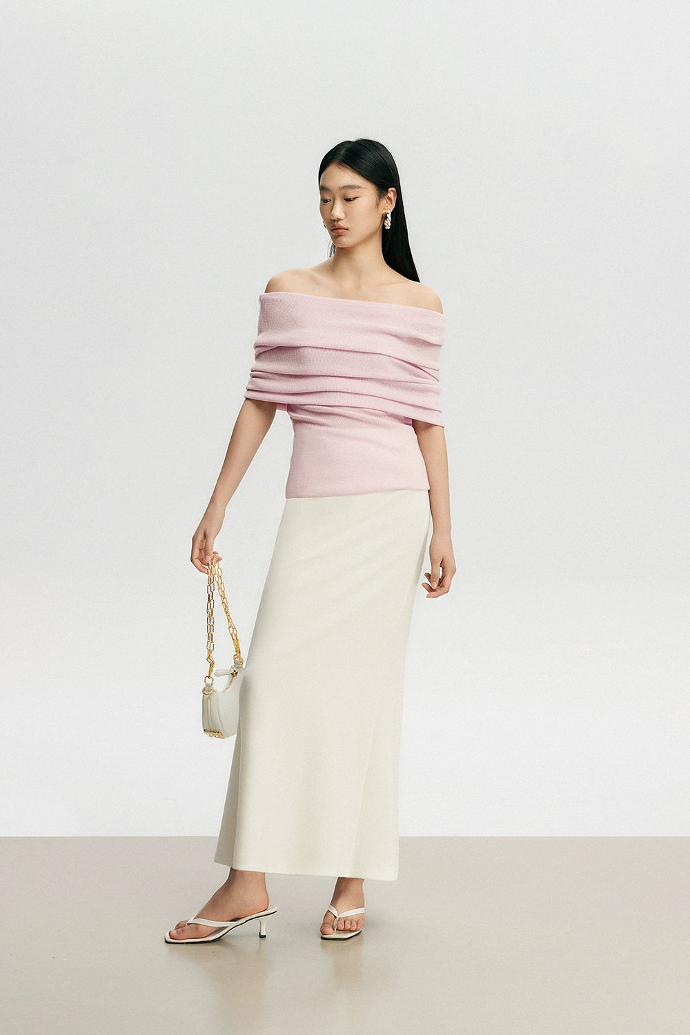 Crafted with a blend of polyester, acrylic, nylon, and a touch of cotton wool, this top features a ribbed knit pattern that accentuates your silhouette softly. Its off-shoulder design can be worn as a subtle hint of allure or adjusted to create a stunning neckline, making it a canvas for self-expression and style.