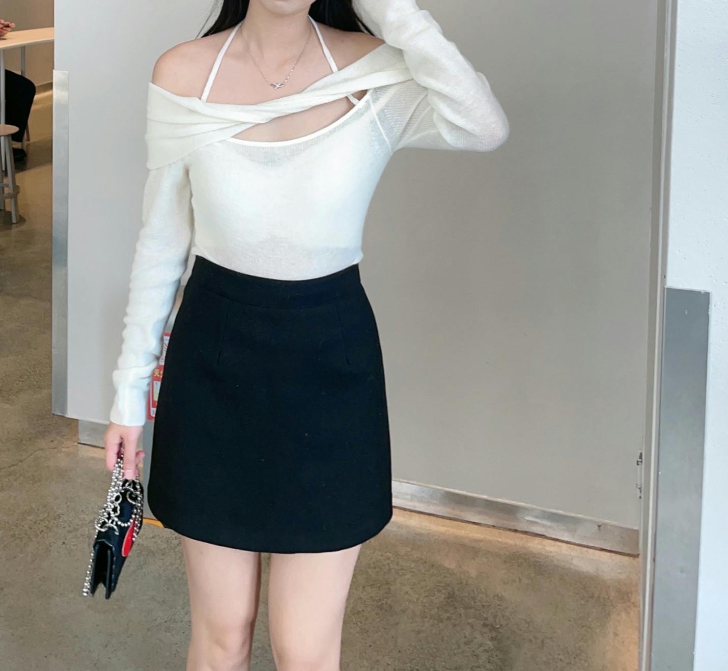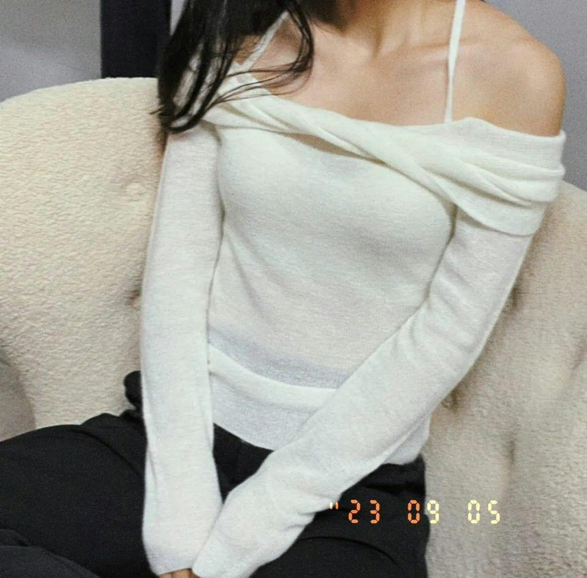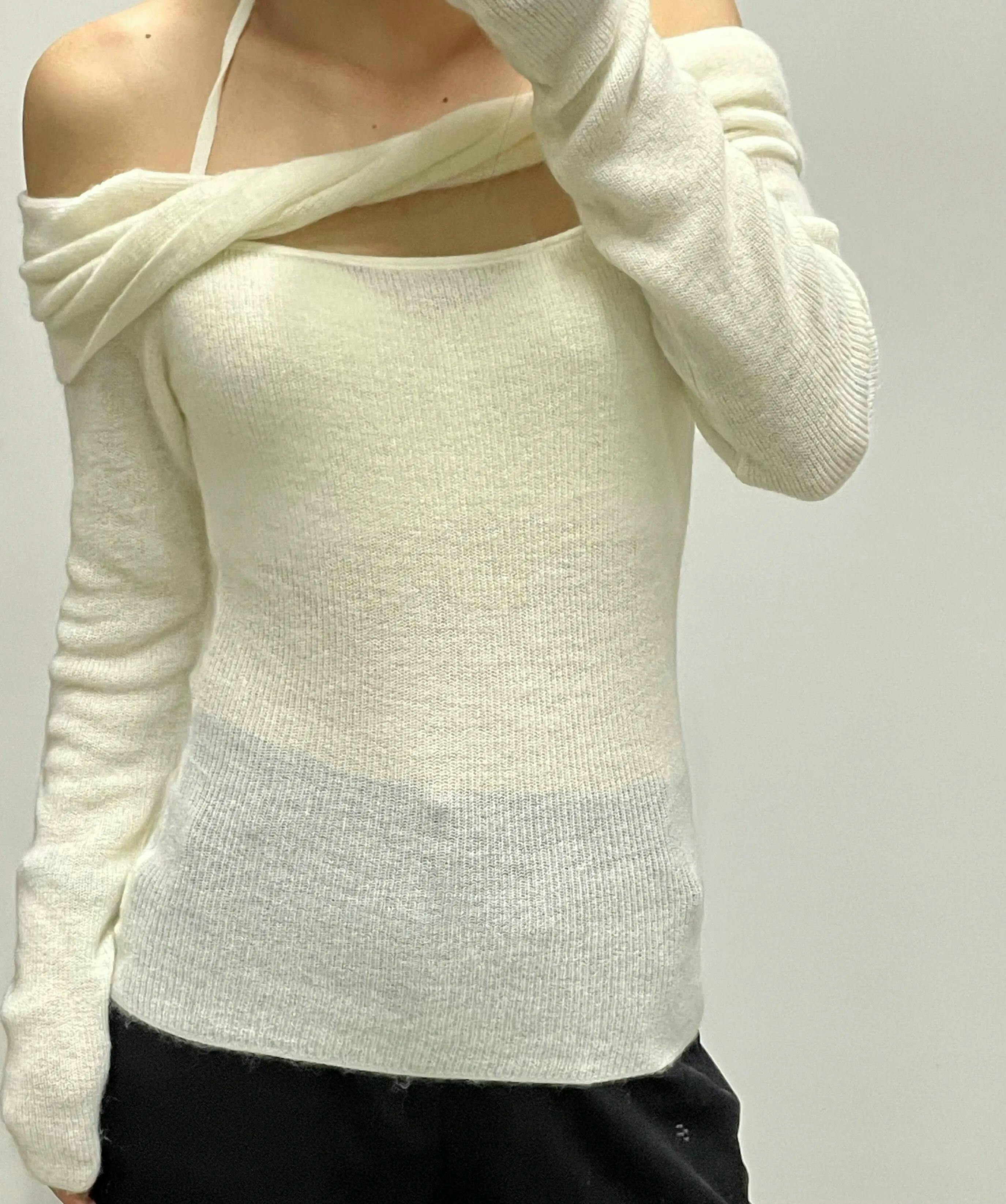 Crafted with a blend of polyamide fiber, wool, and alpaca hair, this sweater offers a soft touch and a gentle drape that accentuates your silhouette. The unique off-shoulder halter-neck design provides a chic, layered look that transitions effortlessly from a casual day out to a sophisticated evening ensemble.