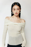 Off-Shoulder Ribbed Long Sleeve Halter-Neck Sweater Top