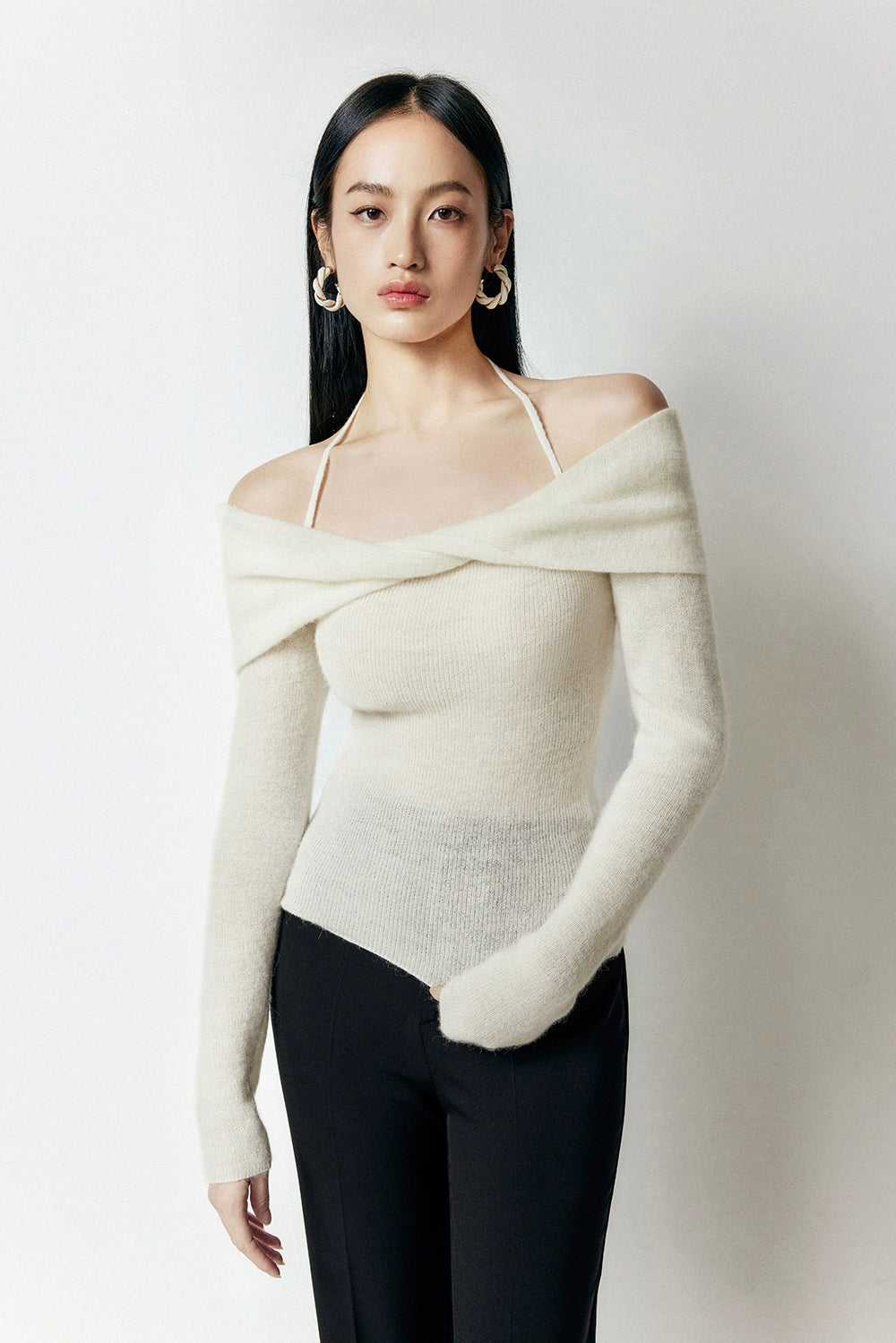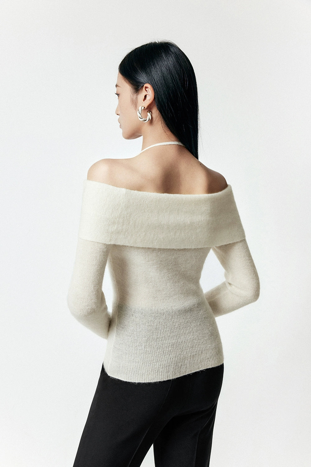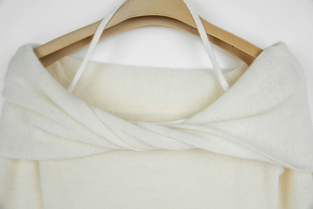 Crafted with a blend of polyamide fiber, wool, and alpaca hair, this sweater offers a soft touch and a gentle drape that accentuates your silhouette. The unique off-shoulder halter-neck design provides a chic, layered look that transitions effortlessly from a casual day out to a sophisticated evening ensemble.