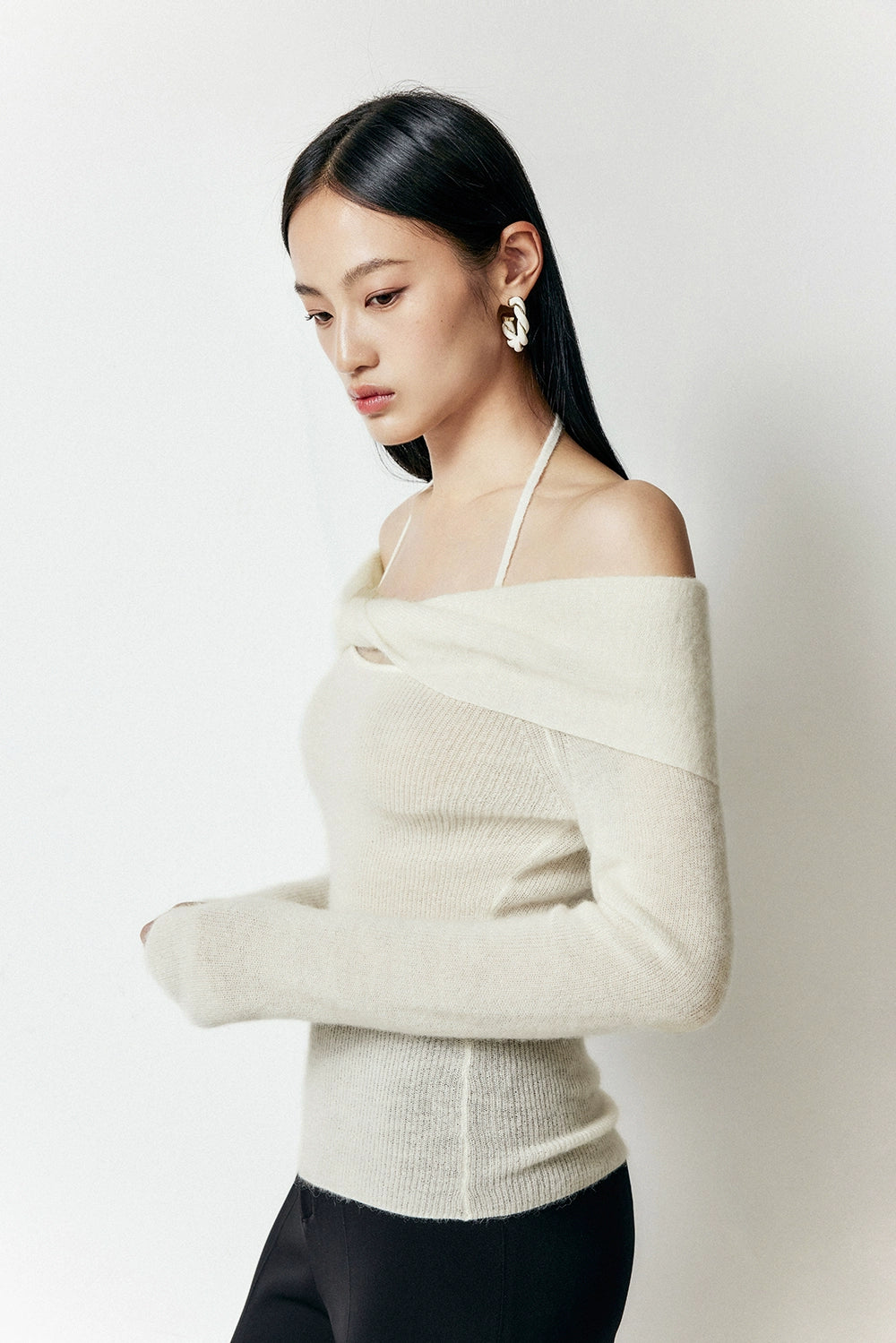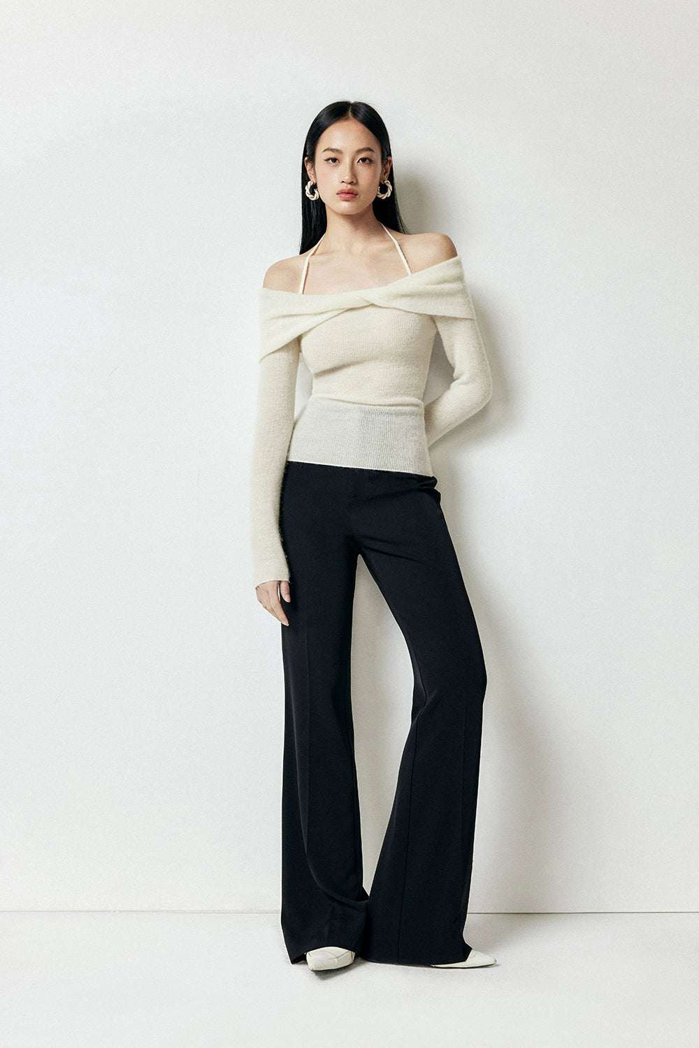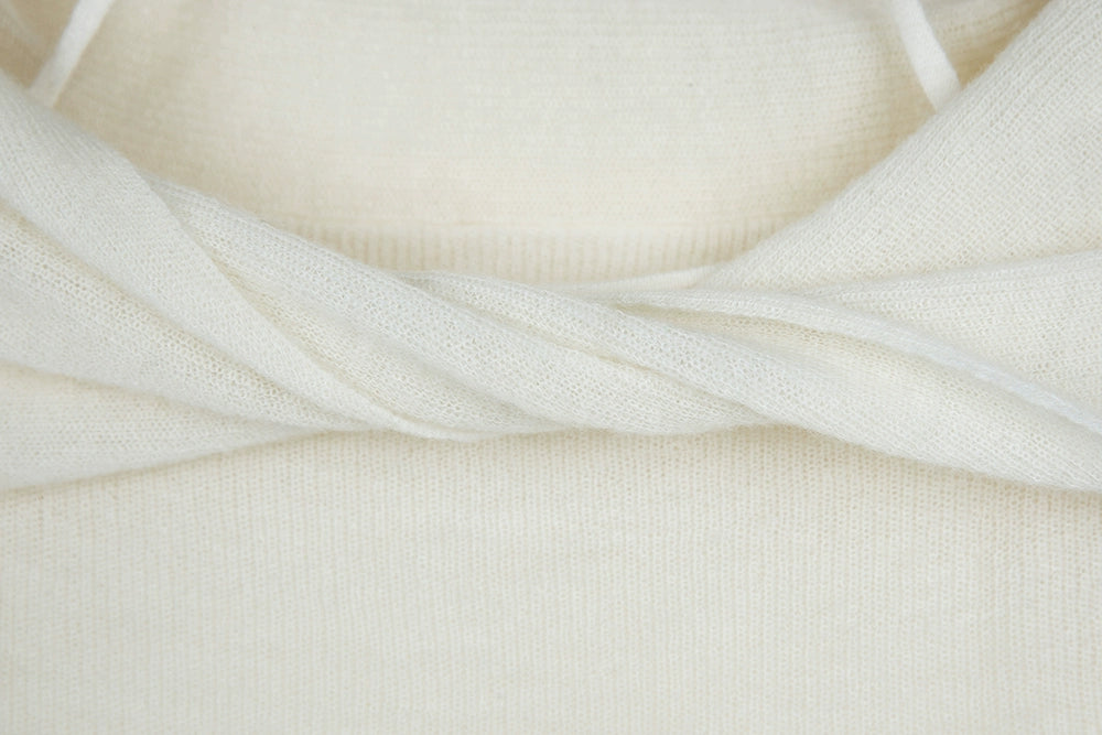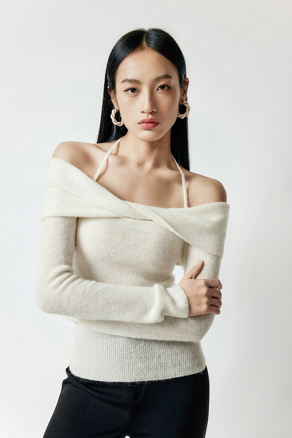 Crafted with a blend of polyamide fiber, wool, and alpaca hair, this sweater offers a soft touch and a gentle drape that accentuates your silhouette. The unique off-shoulder halter-neck design provides a chic, layered look that transitions effortlessly from a casual day out to a sophisticated evening ensemble.