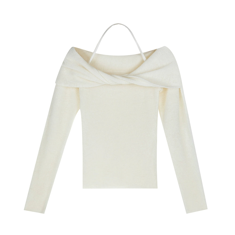 Off-Shoulder Ribbed Long Sleeve Halter-Neck Sweater Top