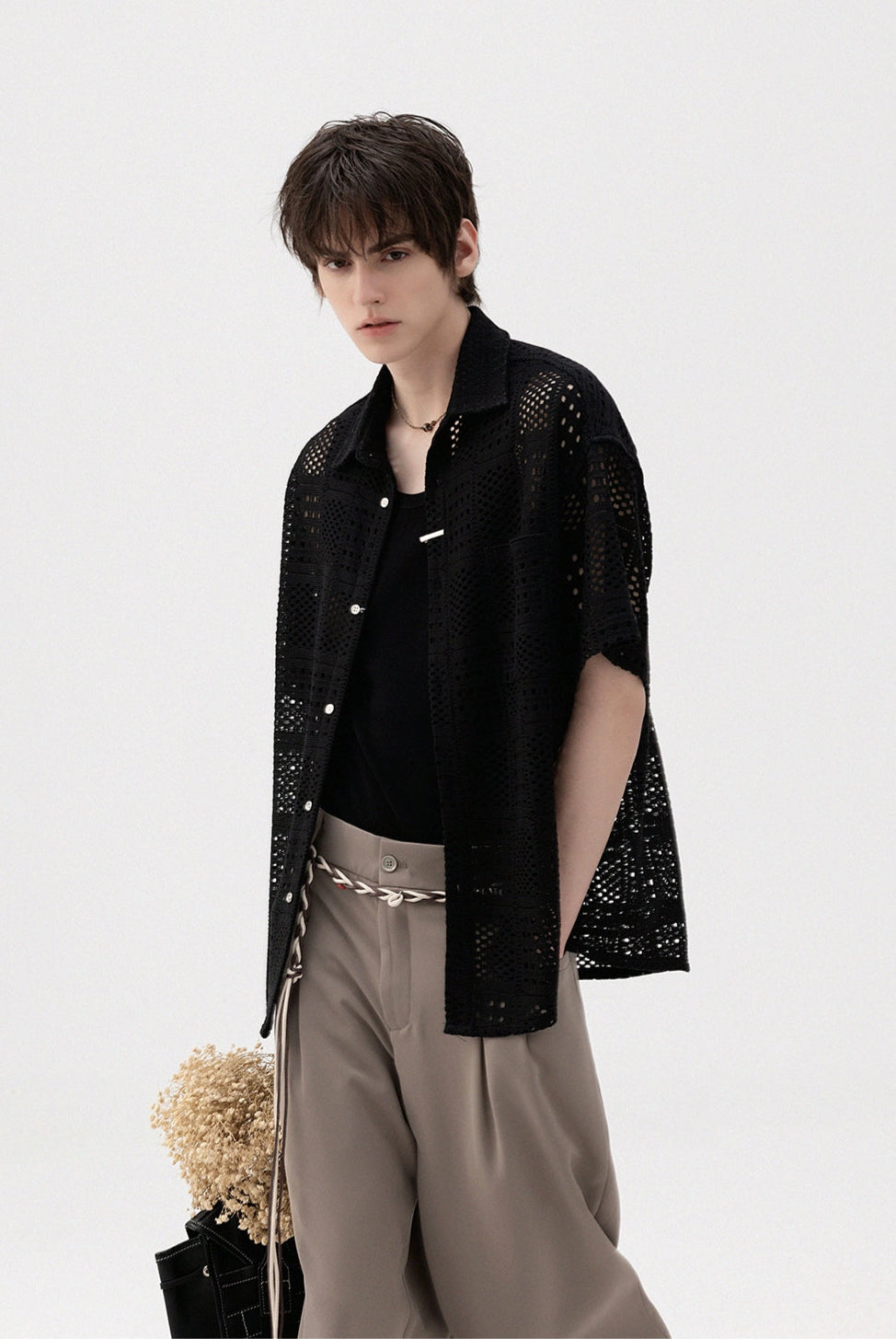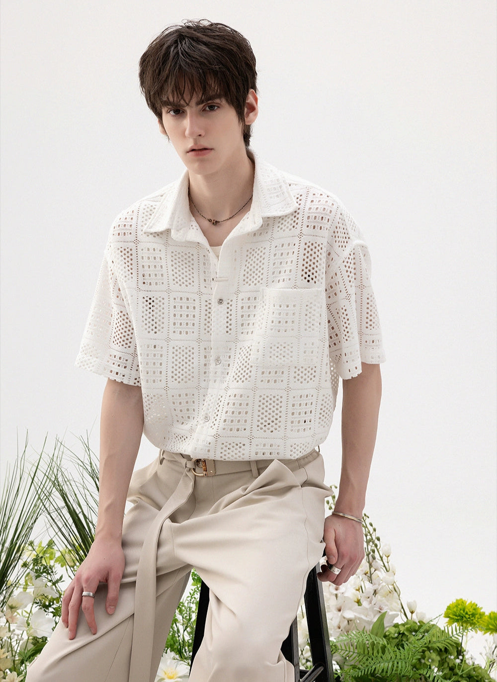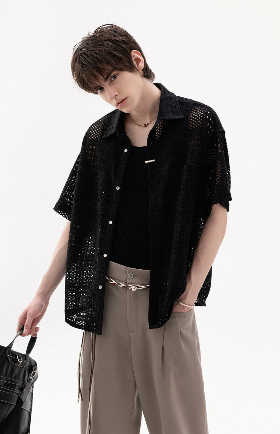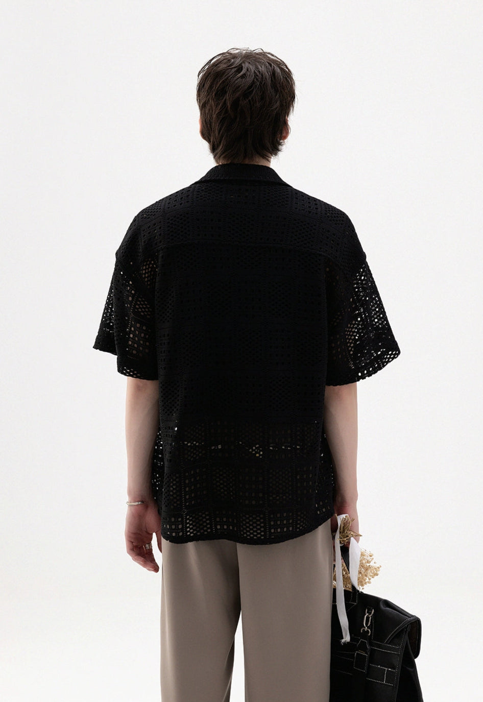 Open Knit Drop Shoulder Short Sleeve Button Shirt