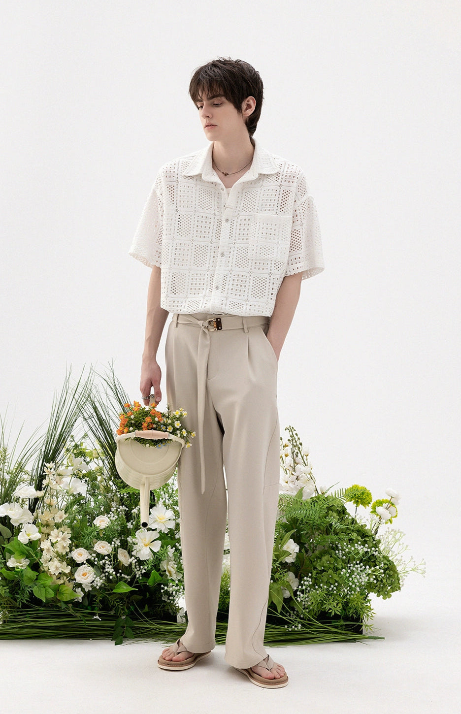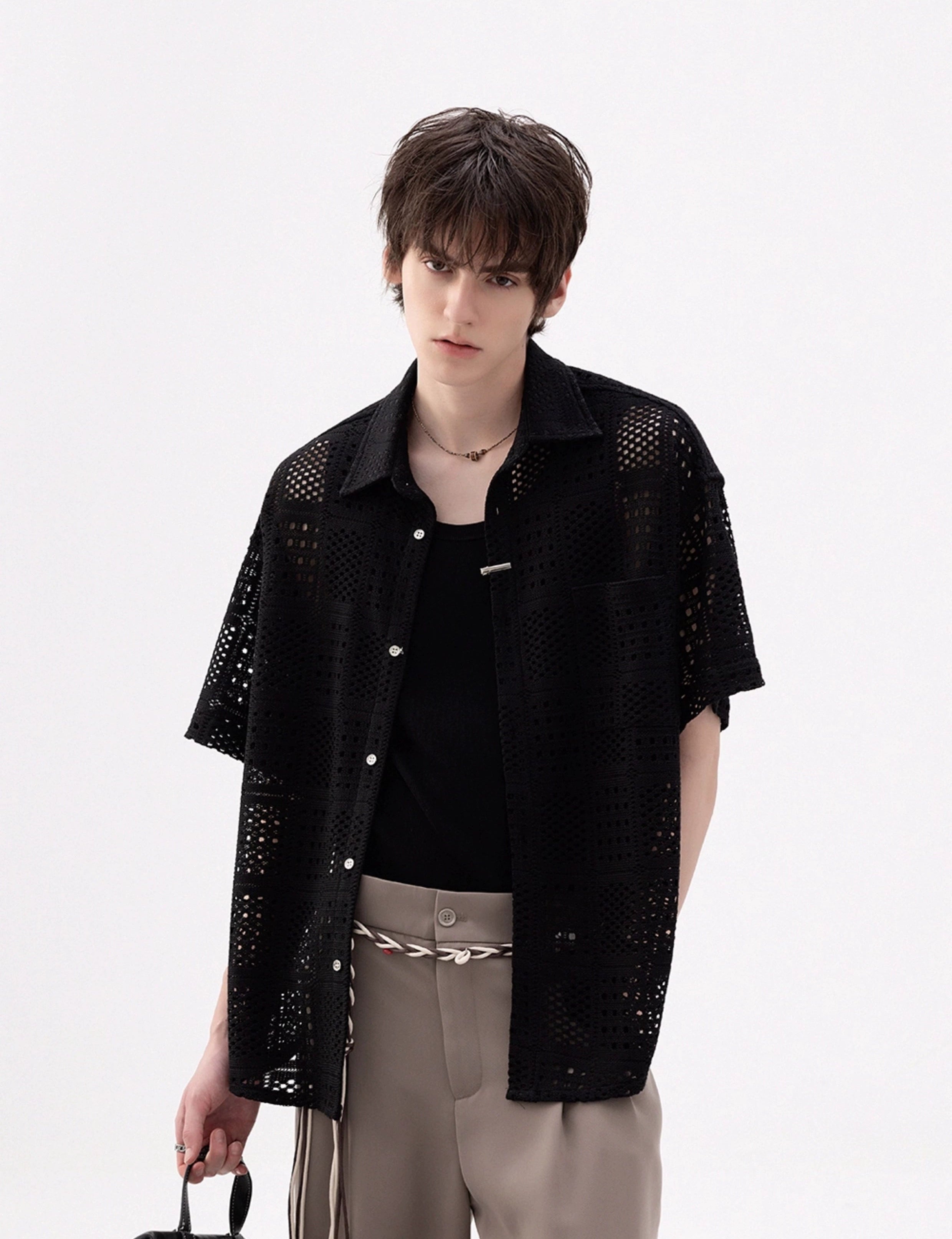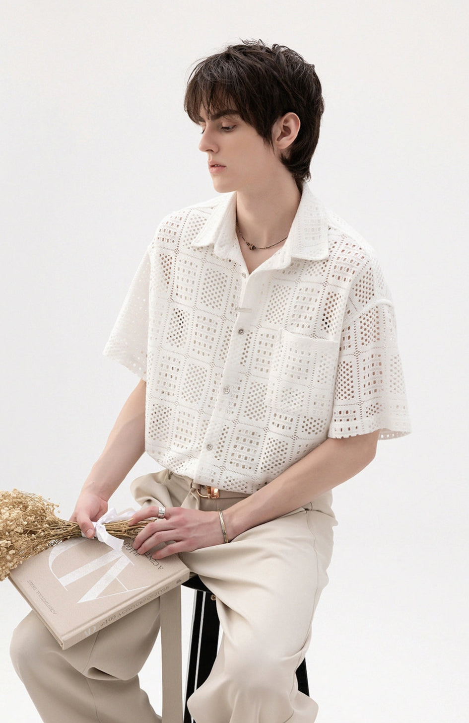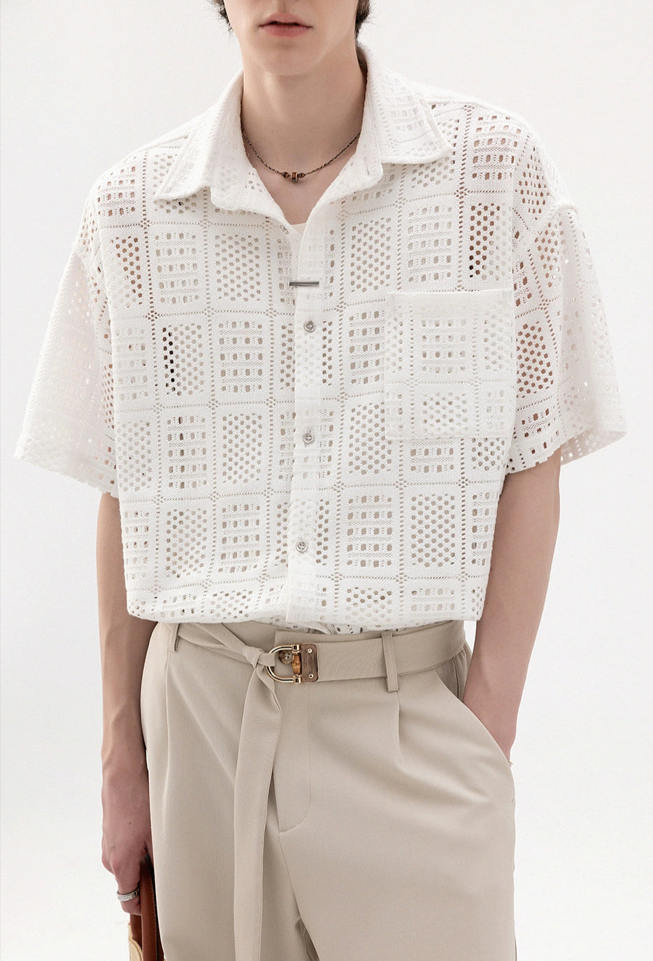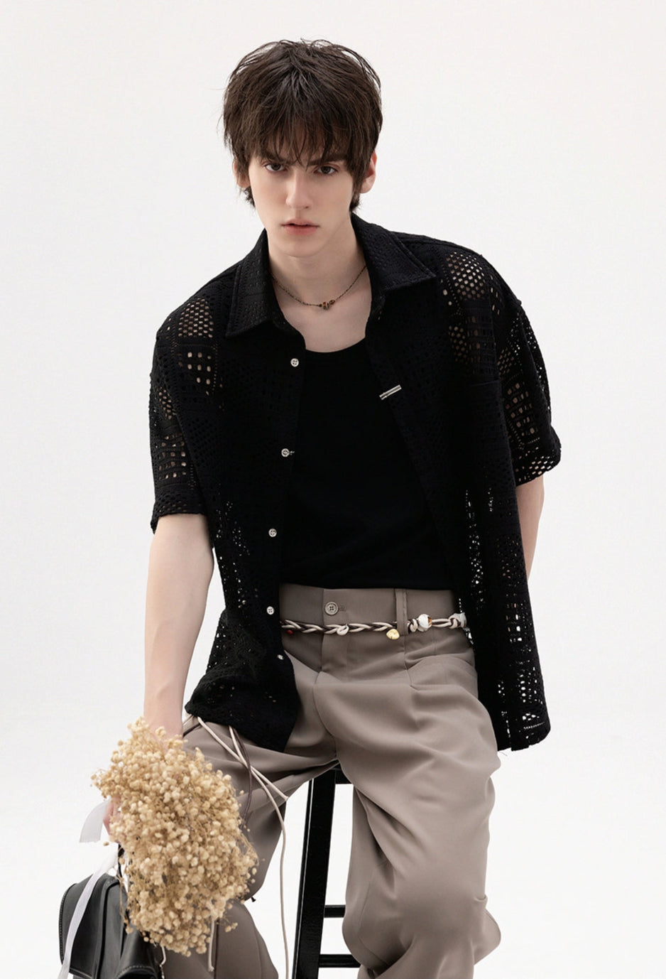 Open Knit Drop Shoulder Short Sleeve Button Shirt