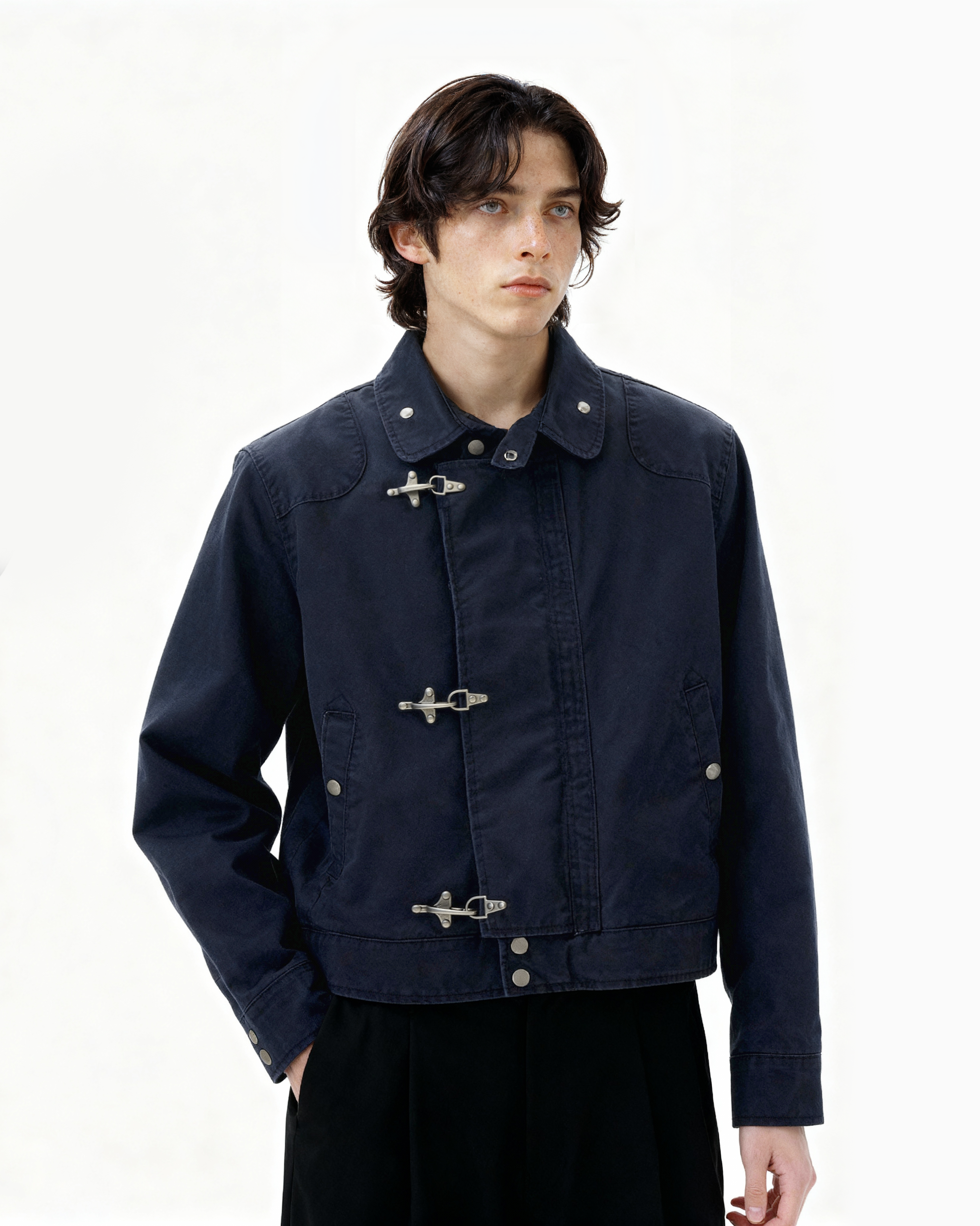 Designed with a subtle nod to classic military and streetwear silhouettes, this mid-cropped jacket offers a clean yet bold look that doesn't try too hard. Made from 100% cotton with a midweight build, its sturdy weave and soft hand-feel offer both comfort and durability. The asymmetrical placket and buckle-front design enhance its visual texture, while the gently structured shoulders and cropped length create a confident, modern cut. Angled side pockets add subtle functionality without compromising the jacket’s minimal styling.
