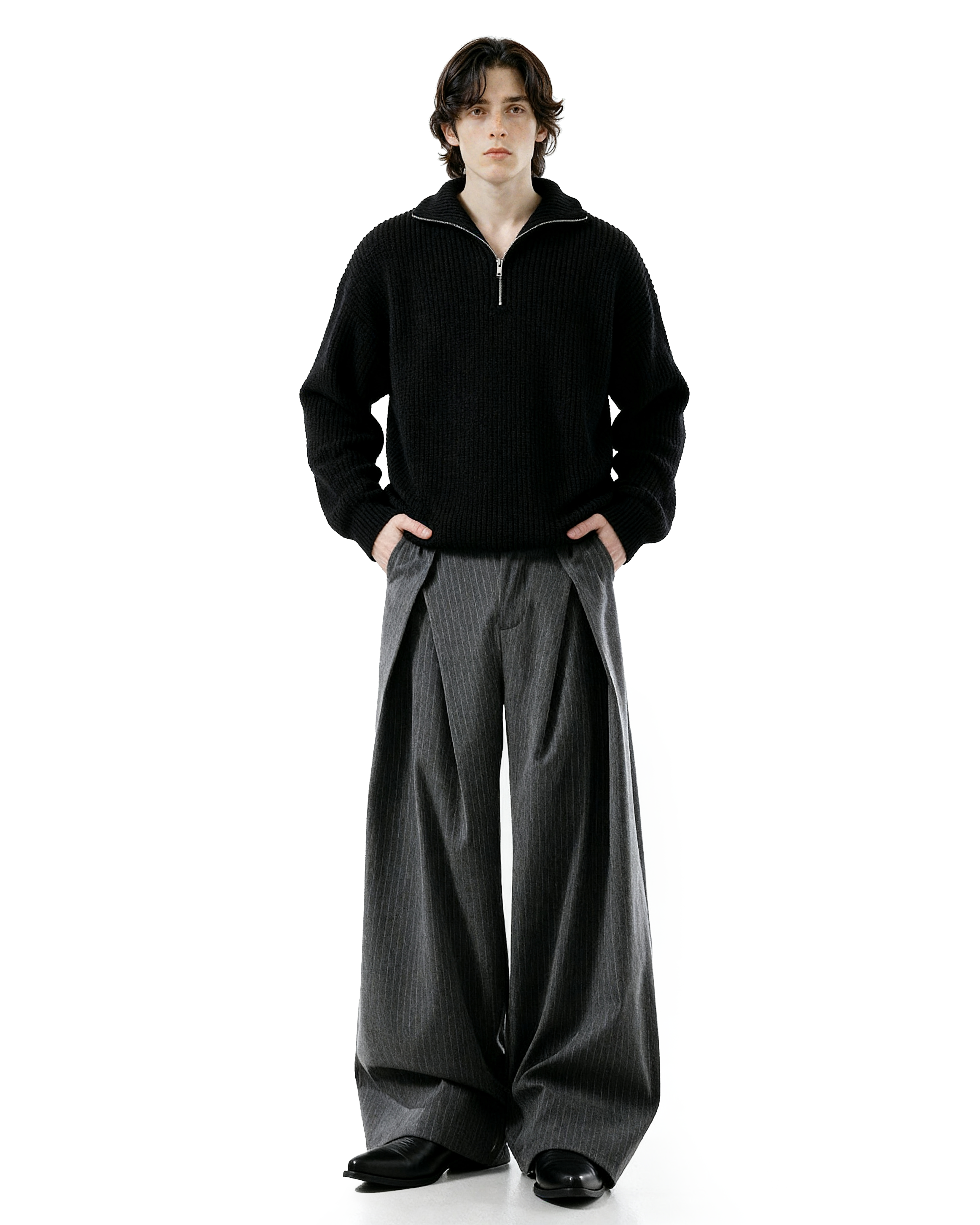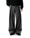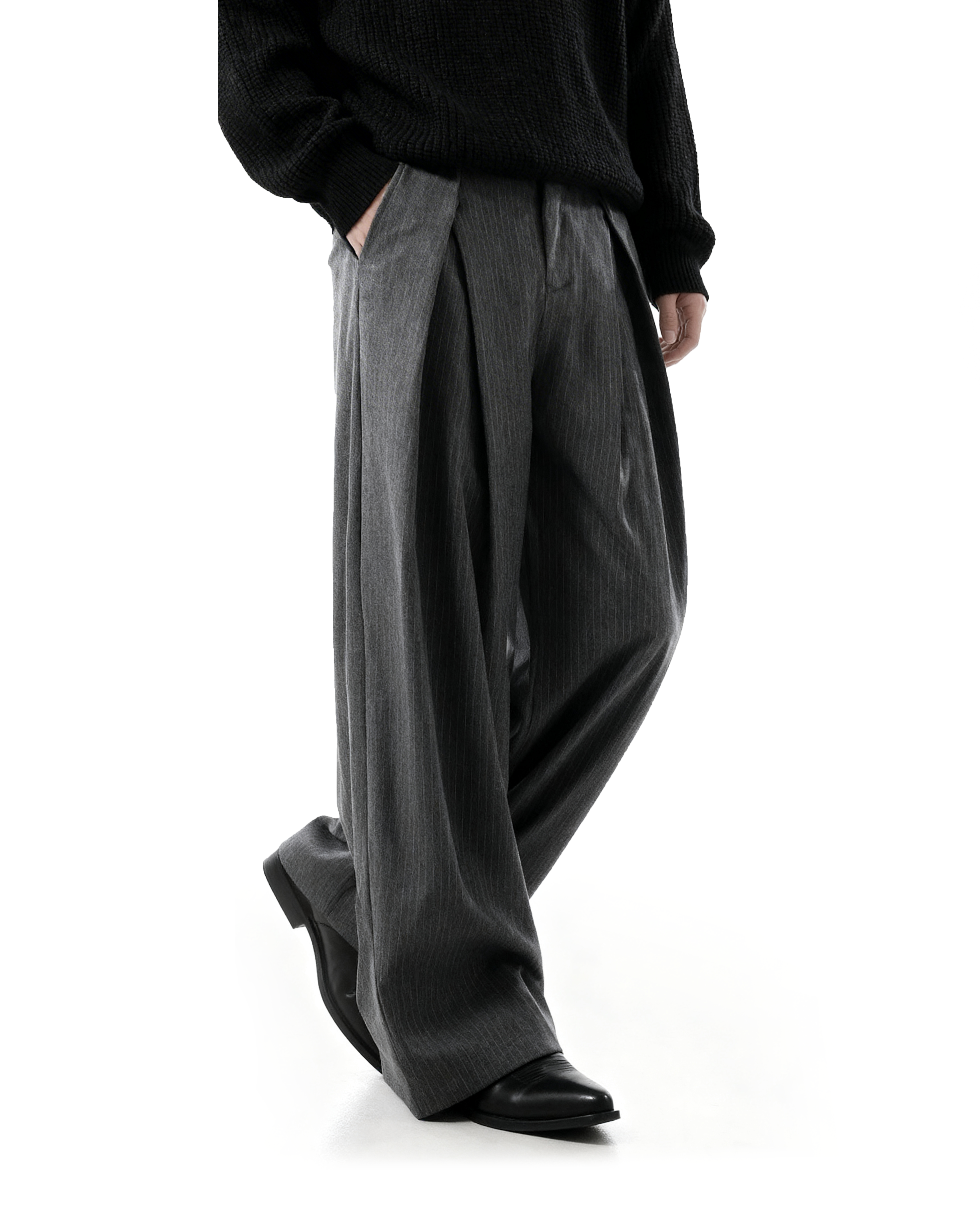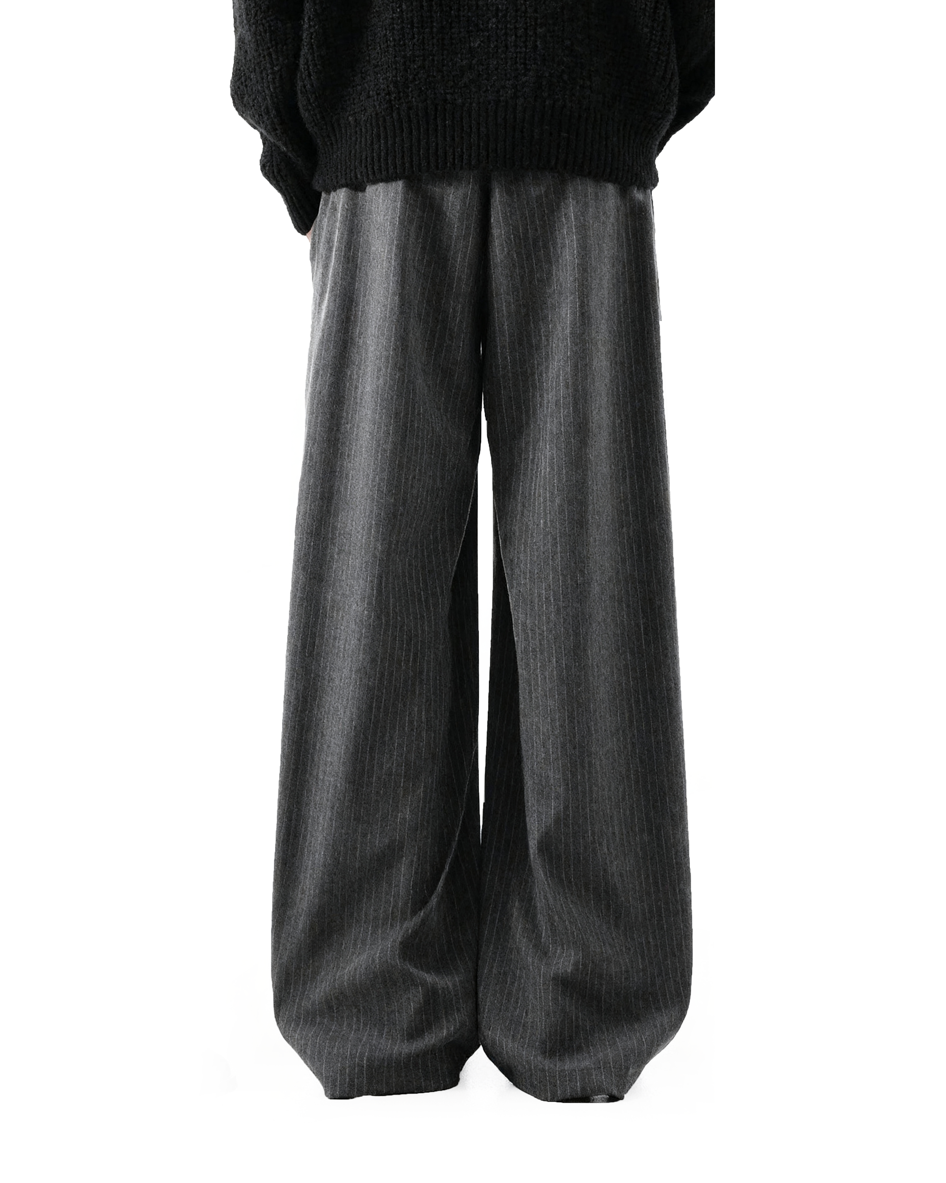 With double pleats and clean pinstripes, they bring a sharp sense of design to a relaxed, wide-leg cut. Crafted from a durable, medium-weight fabric, the texture offers enough structure to hold shape while moving naturally with the body. The overlapping front waistband adds visual edge, while the subtle gray or black stripe pattern builds depth without being loud.