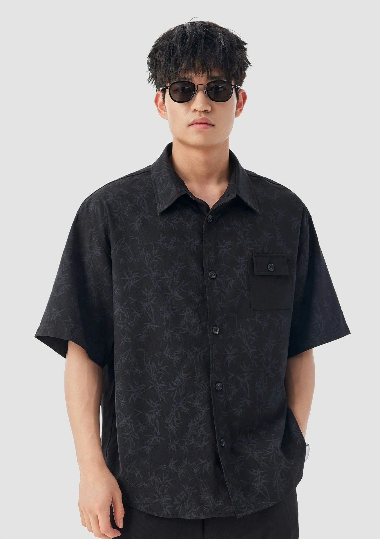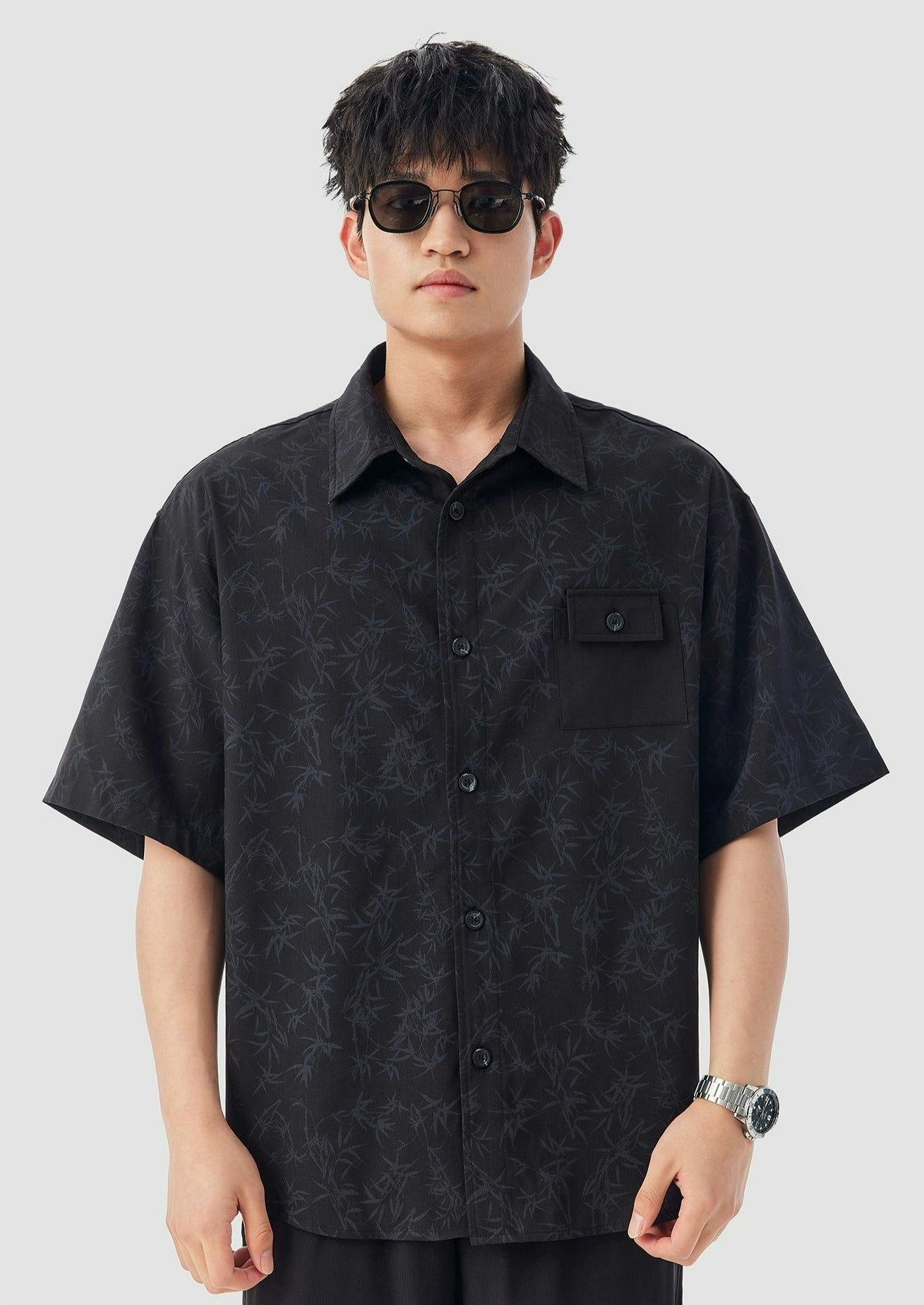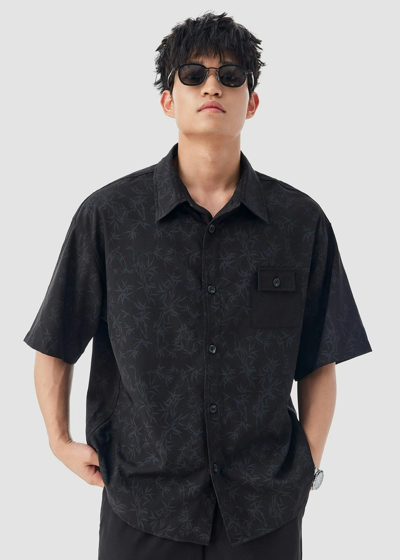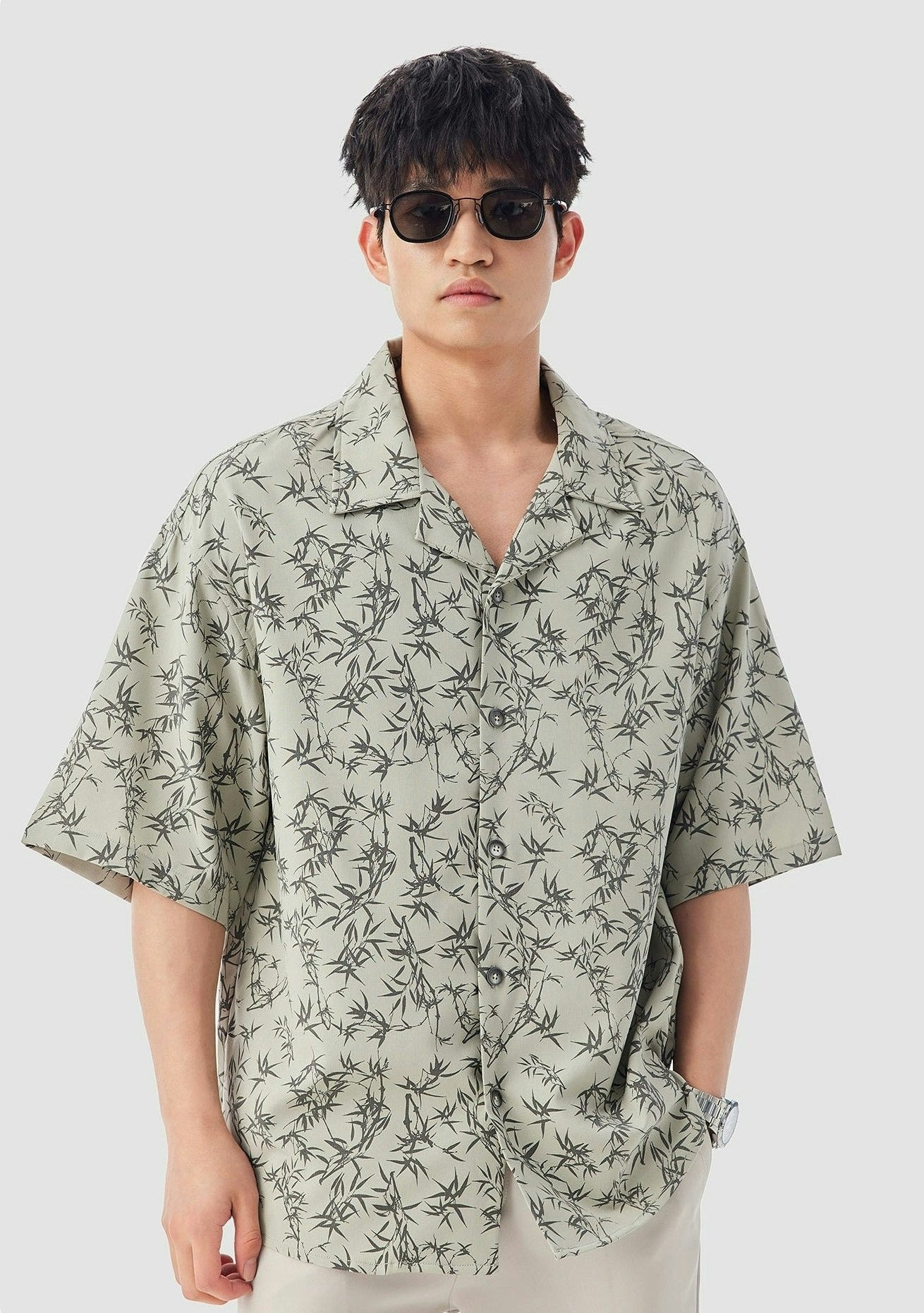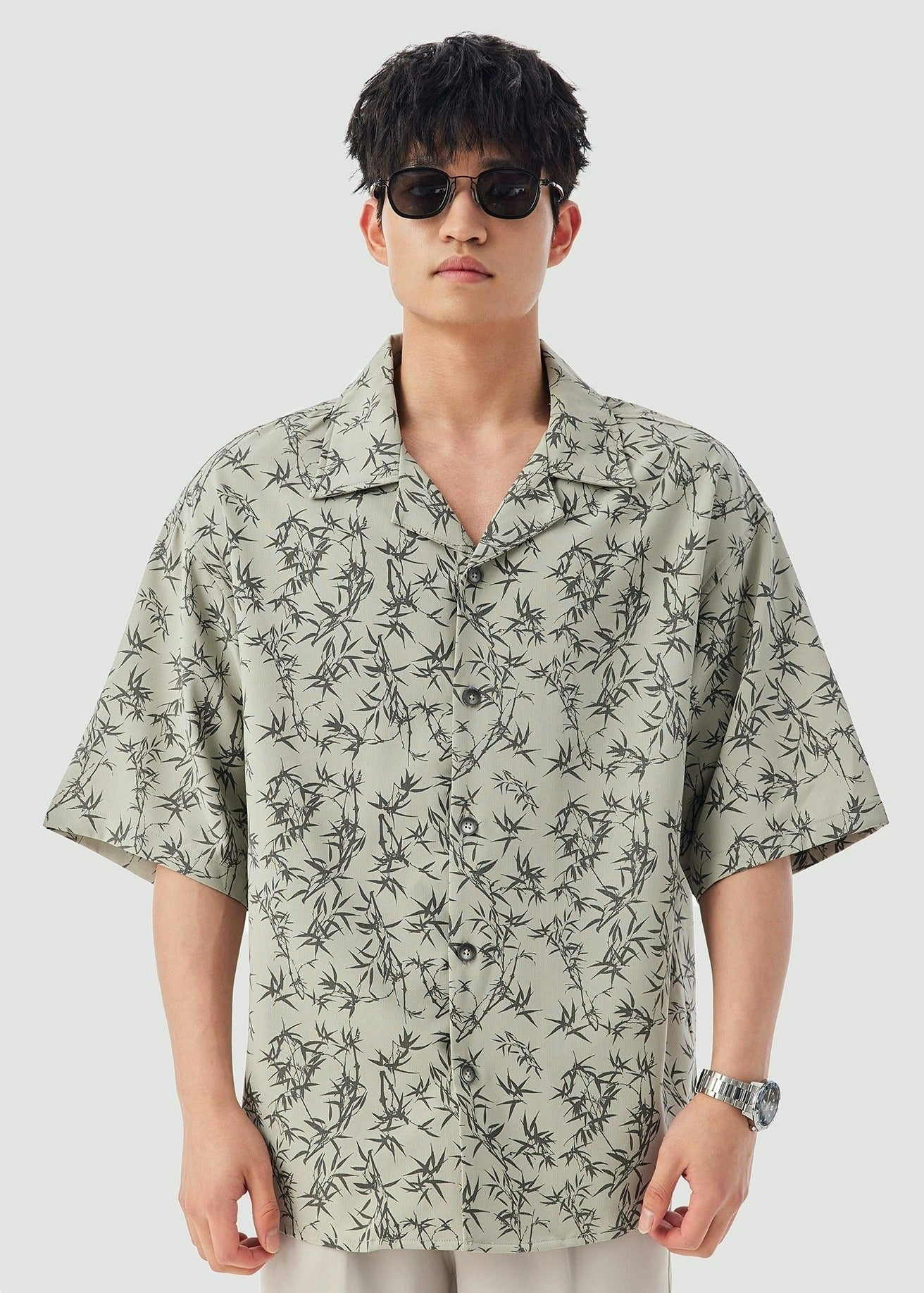 Oversized Bamboo Print Short Sleeve Button-up Shirt