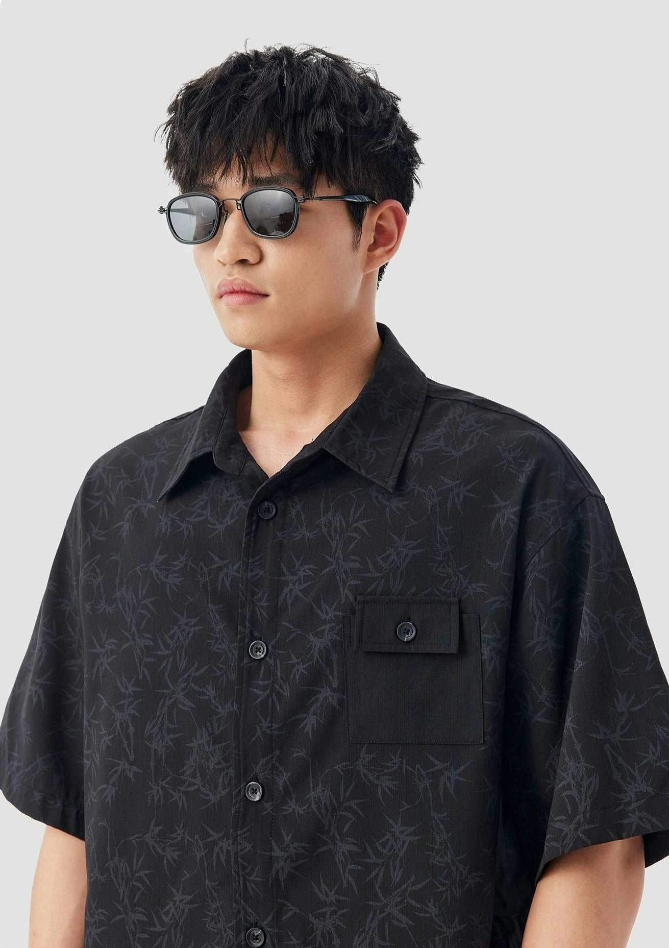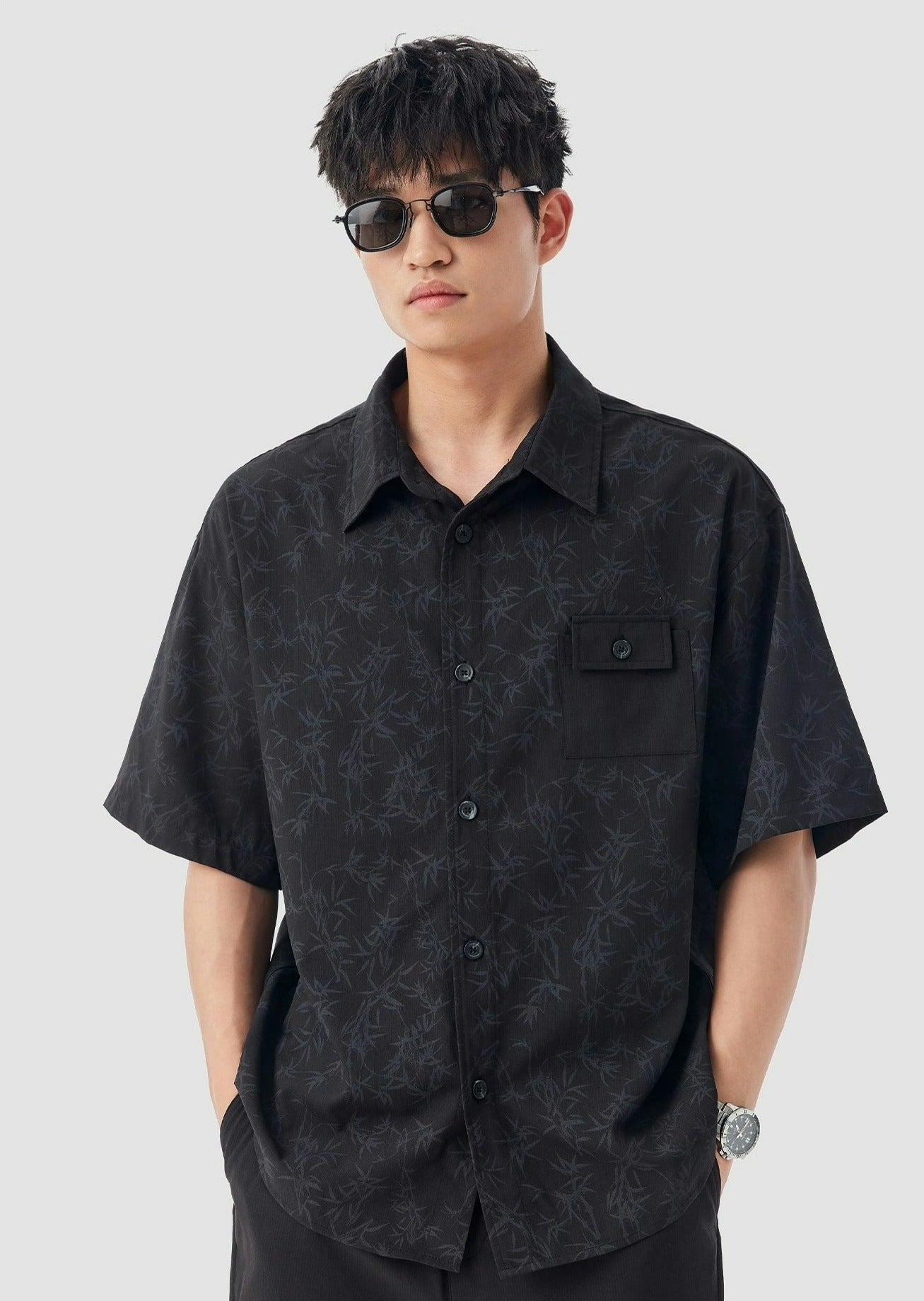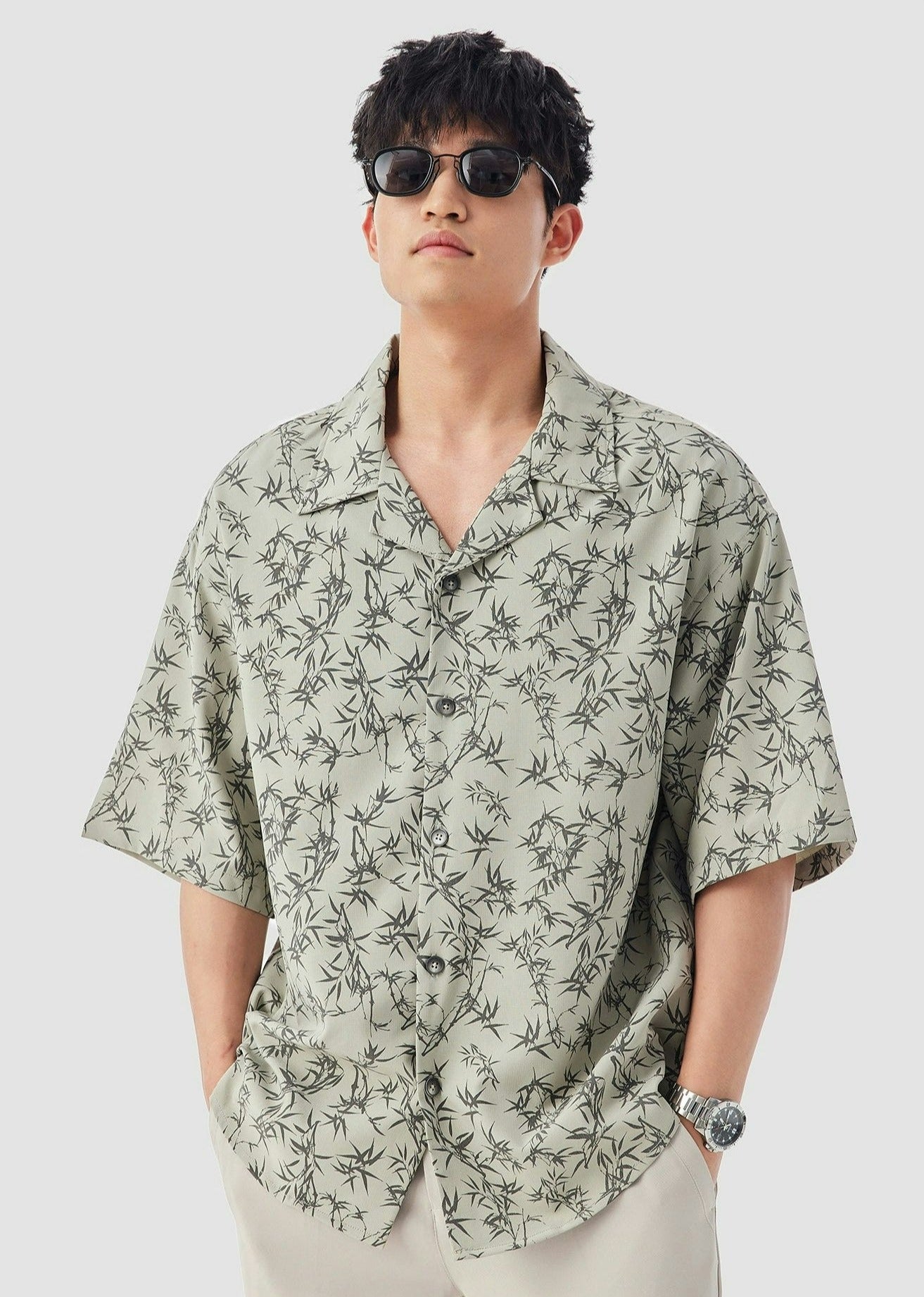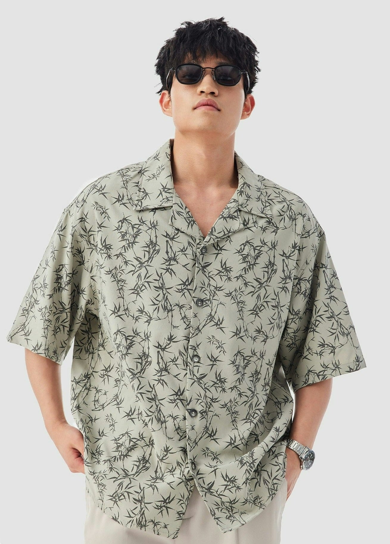Oversized Bamboo Print Short Sleeve Button-up Shirt