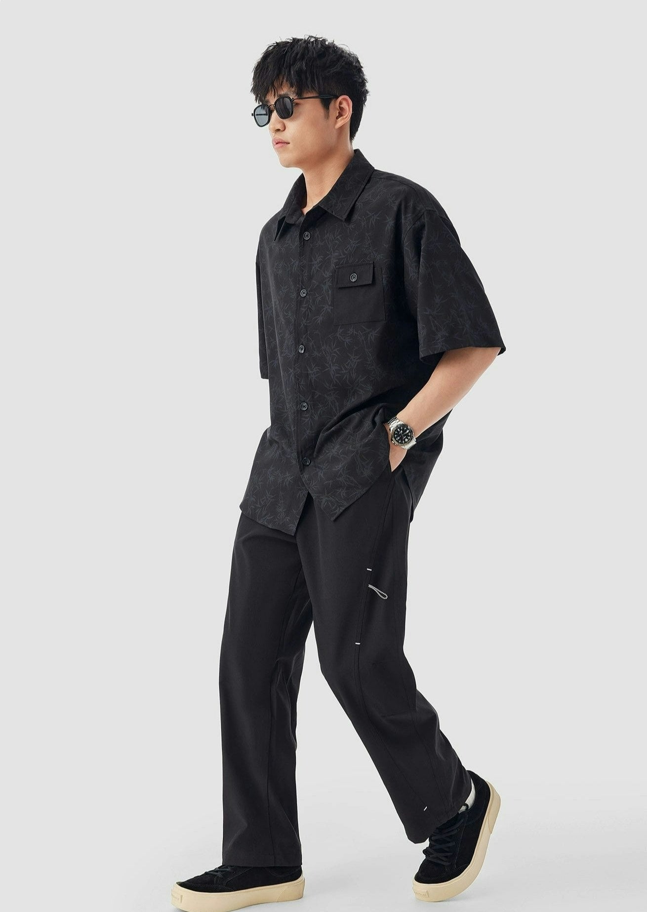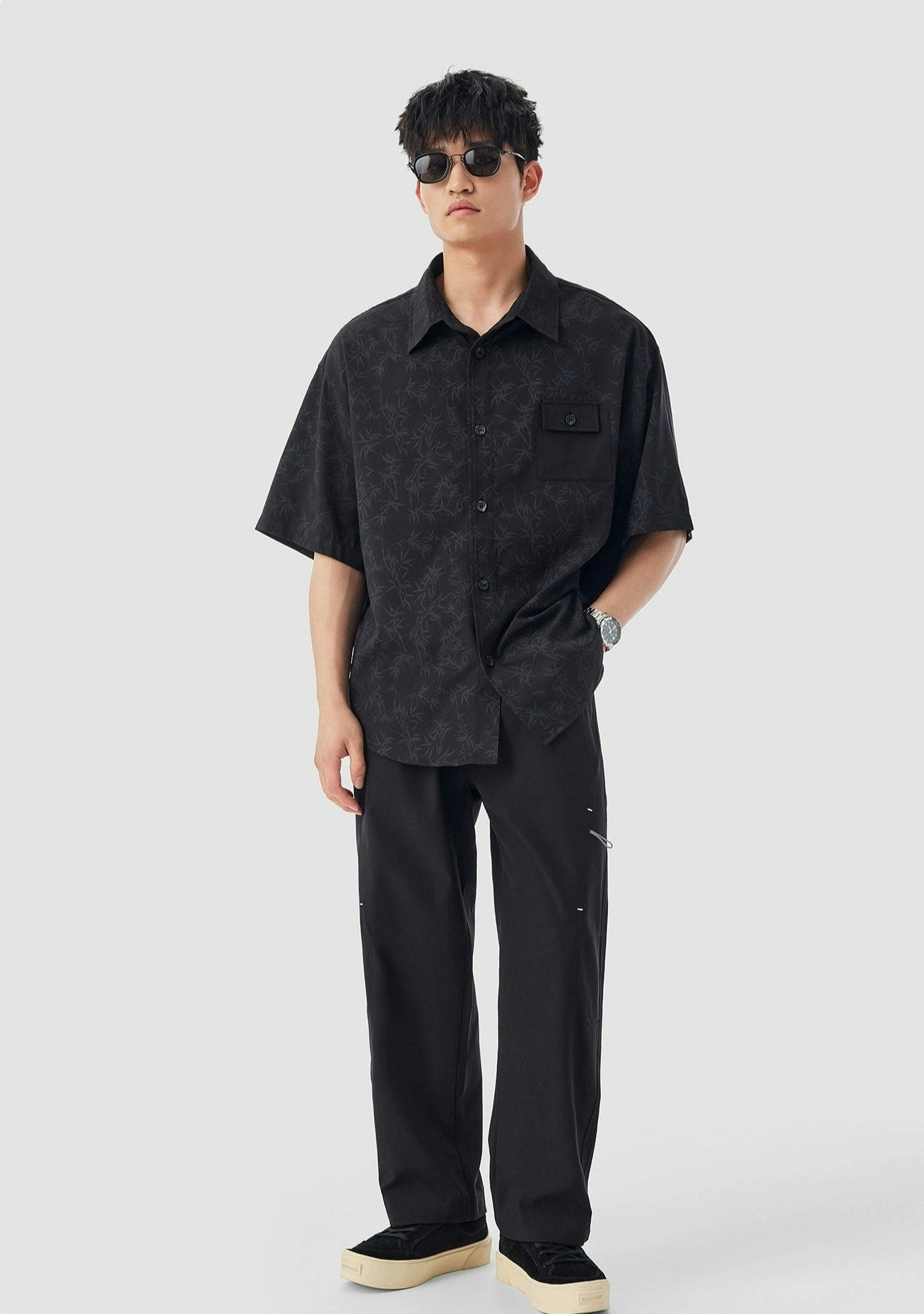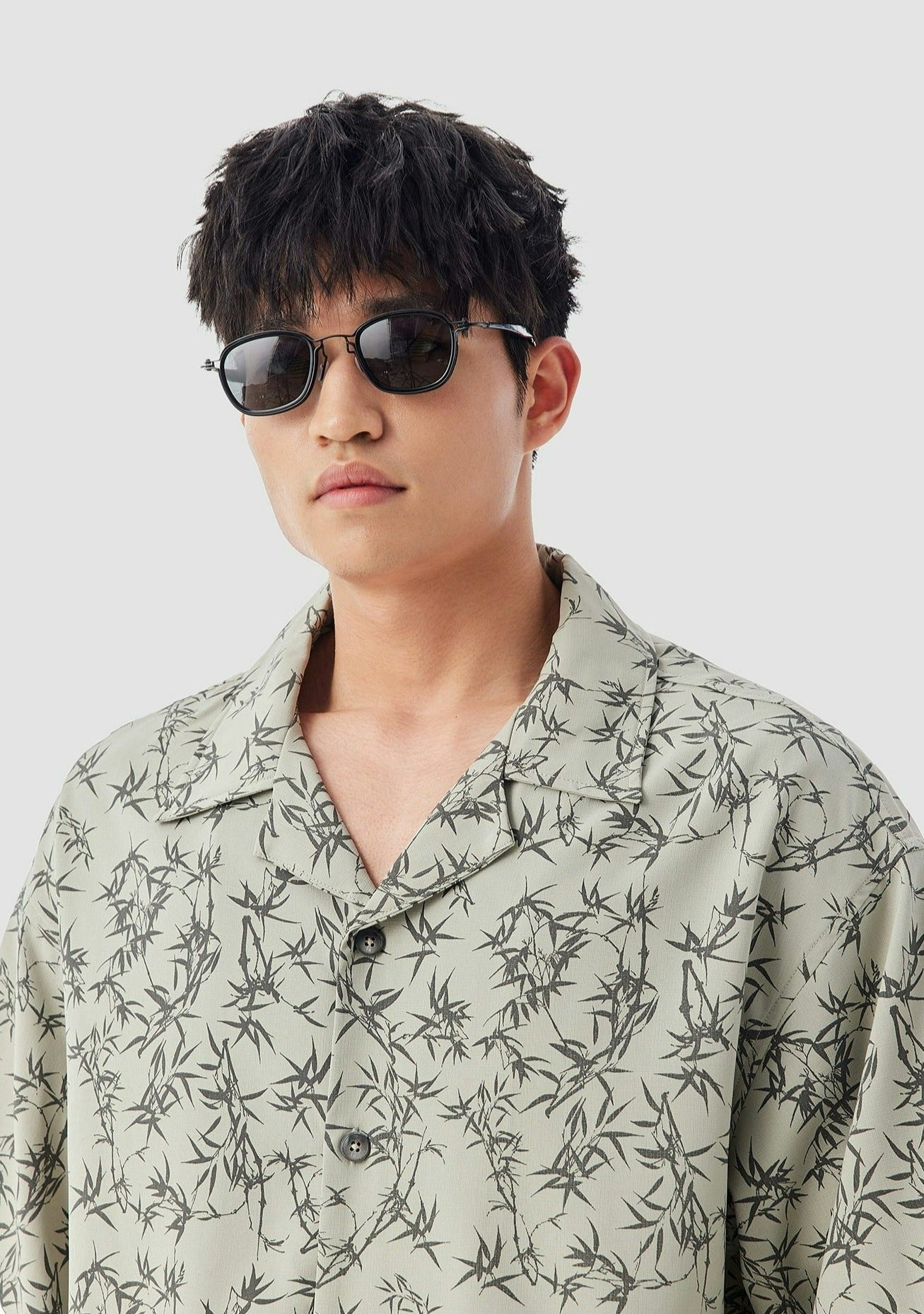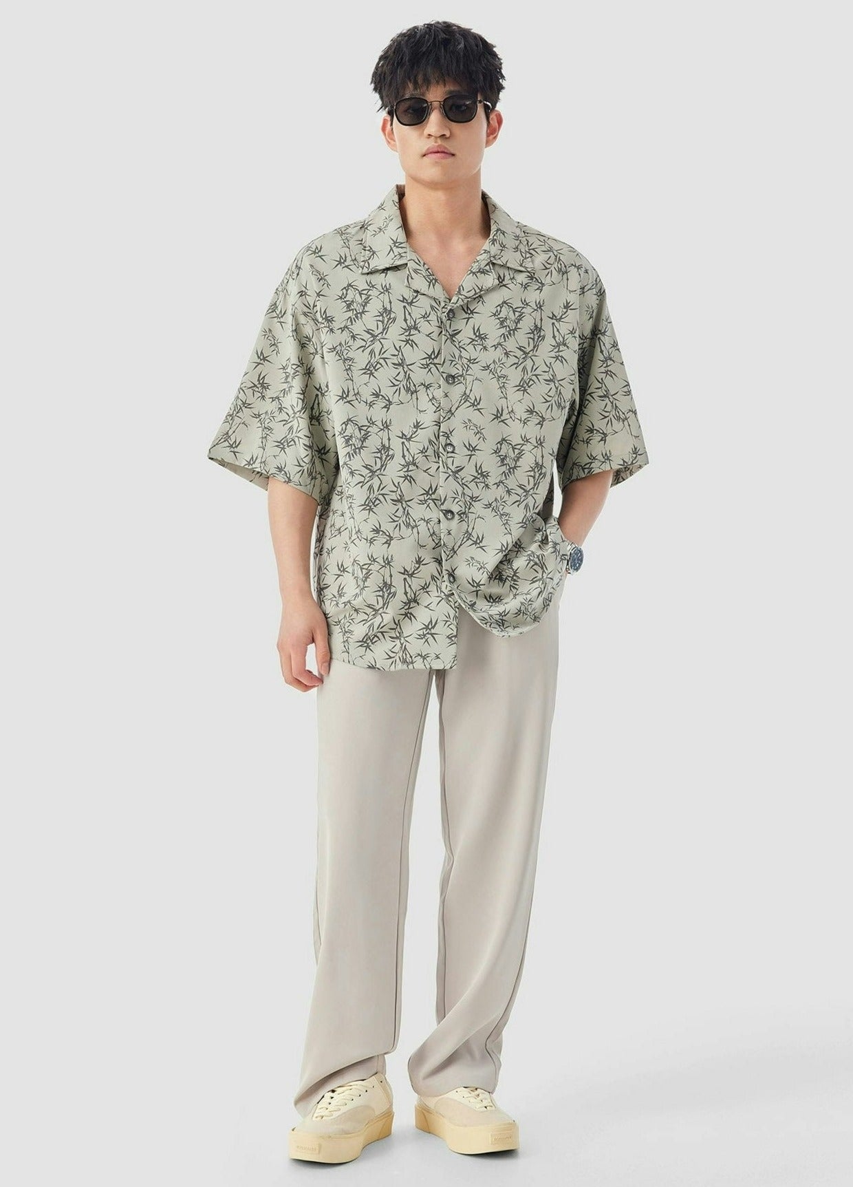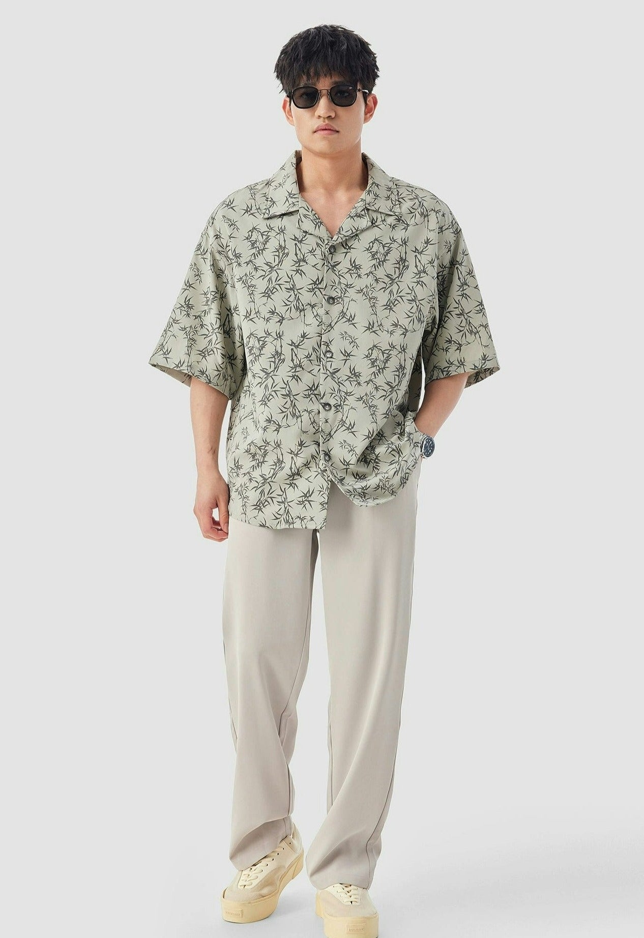 Oversized Bamboo Print Short Sleeve Button-up Shirt