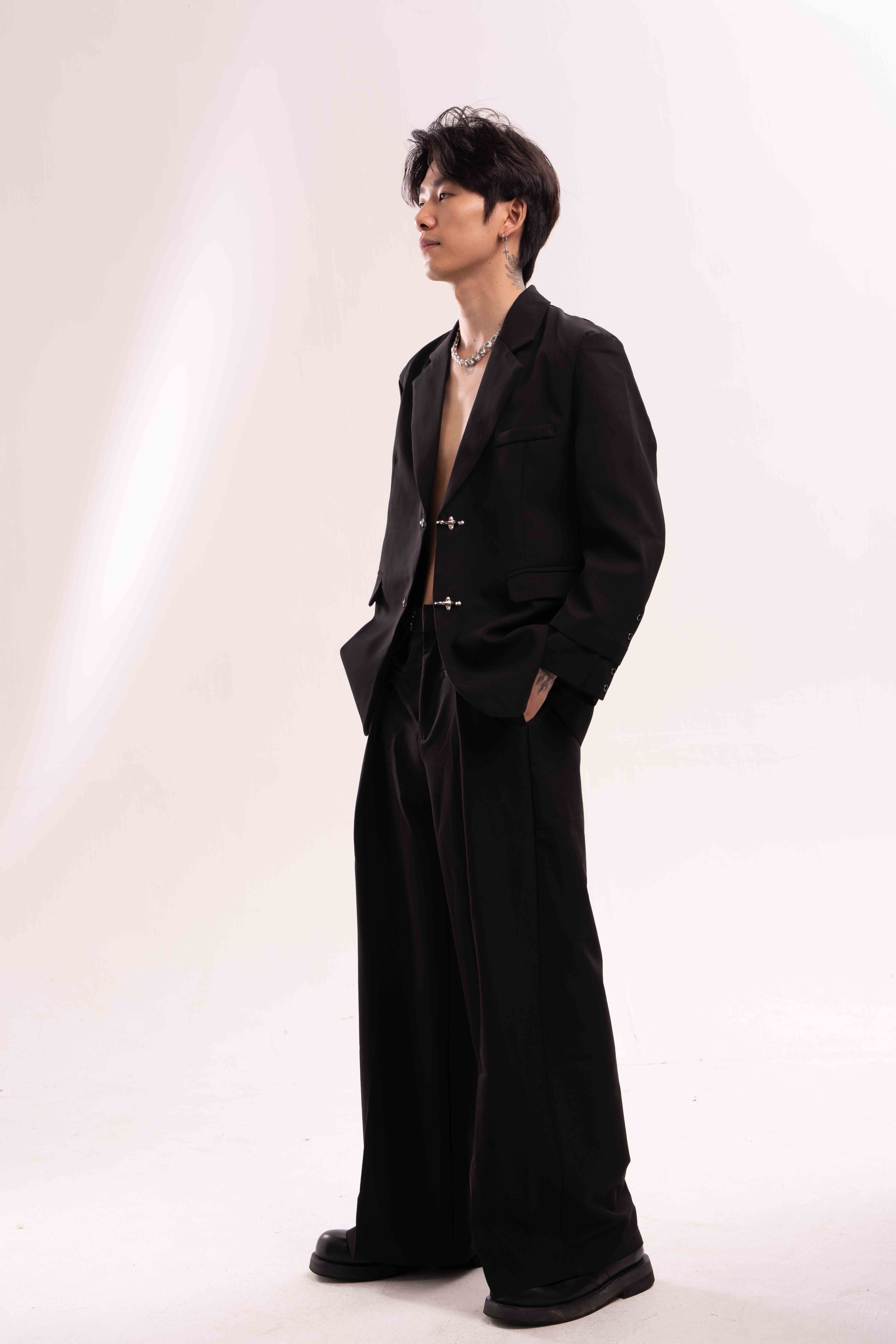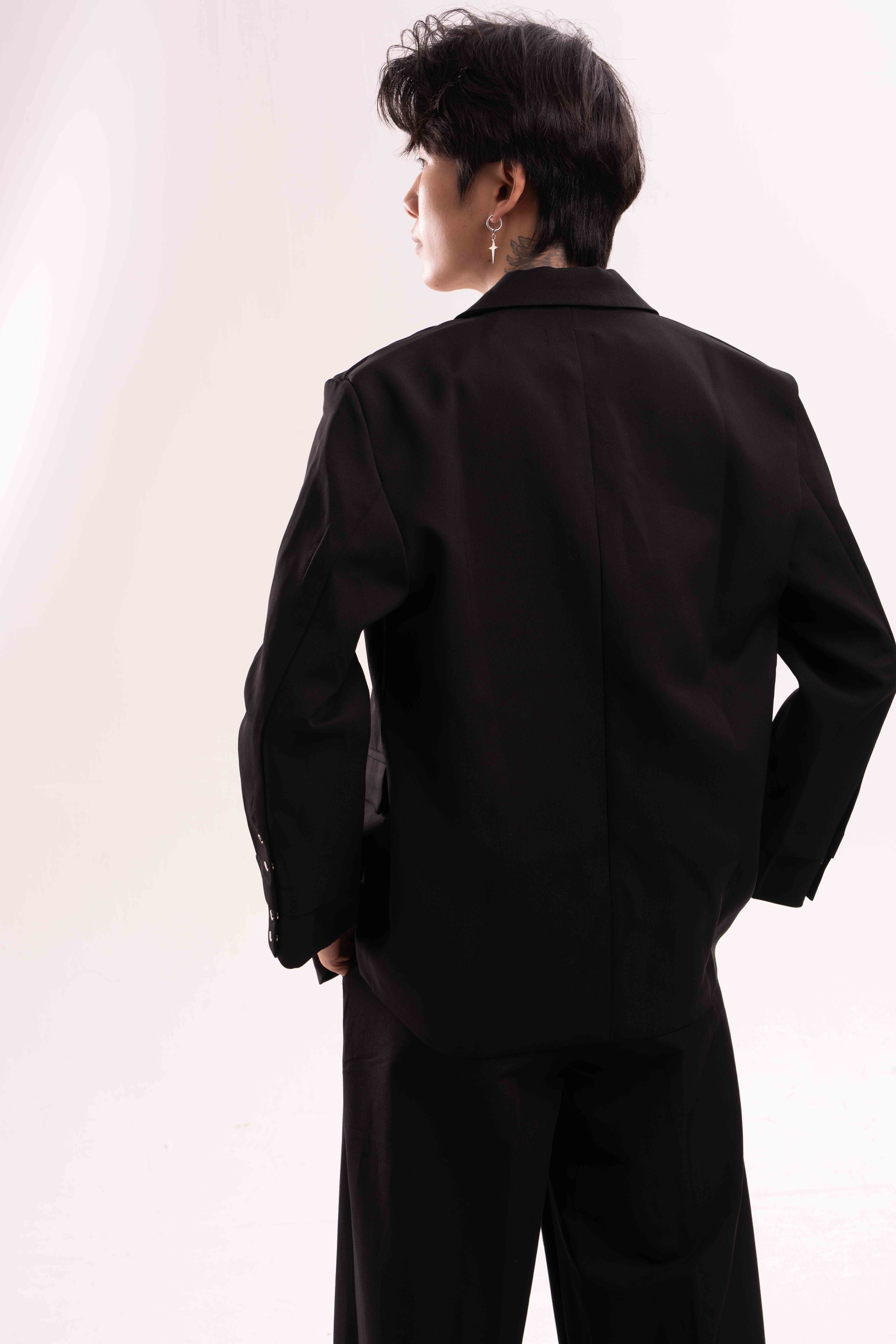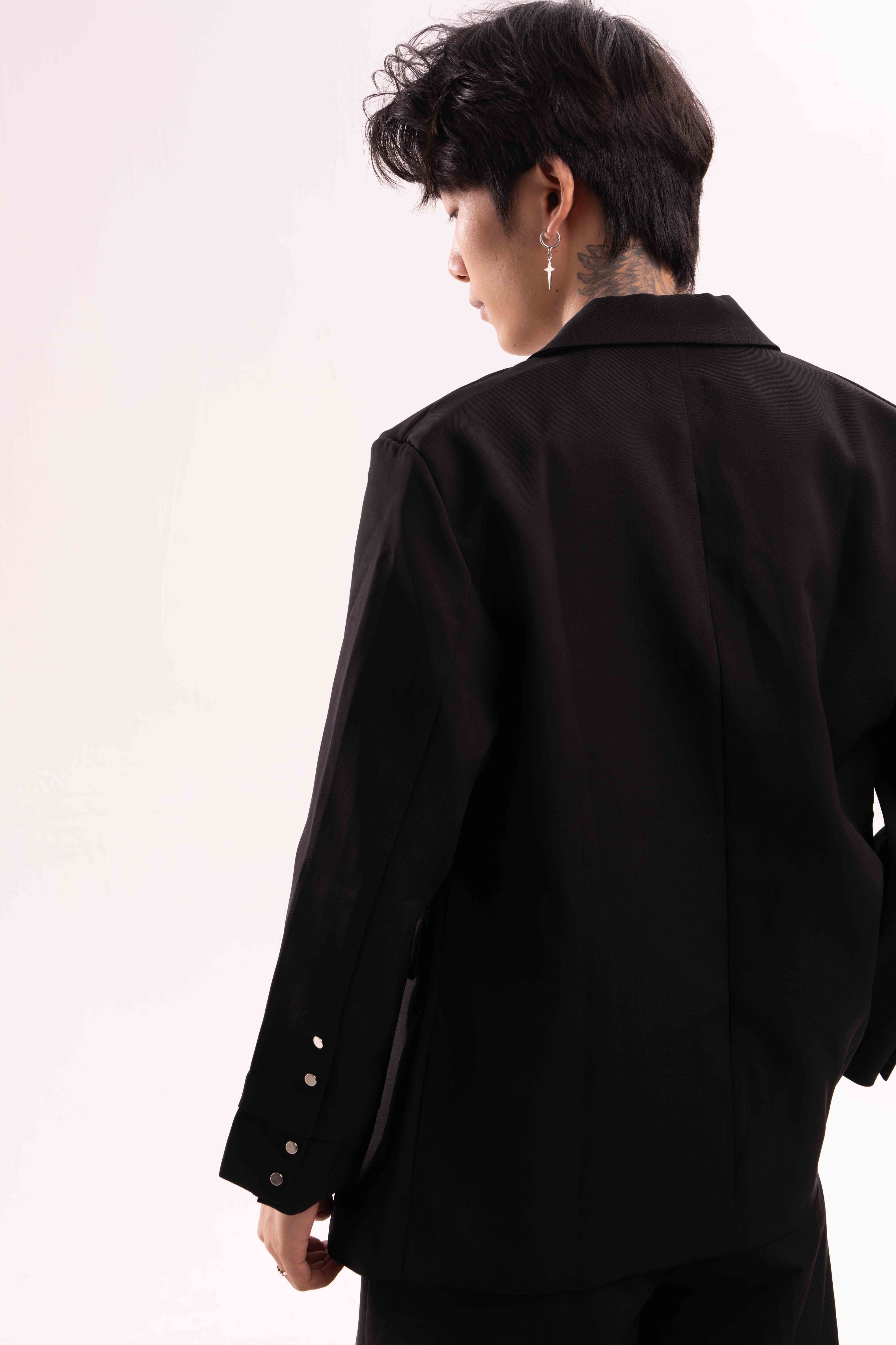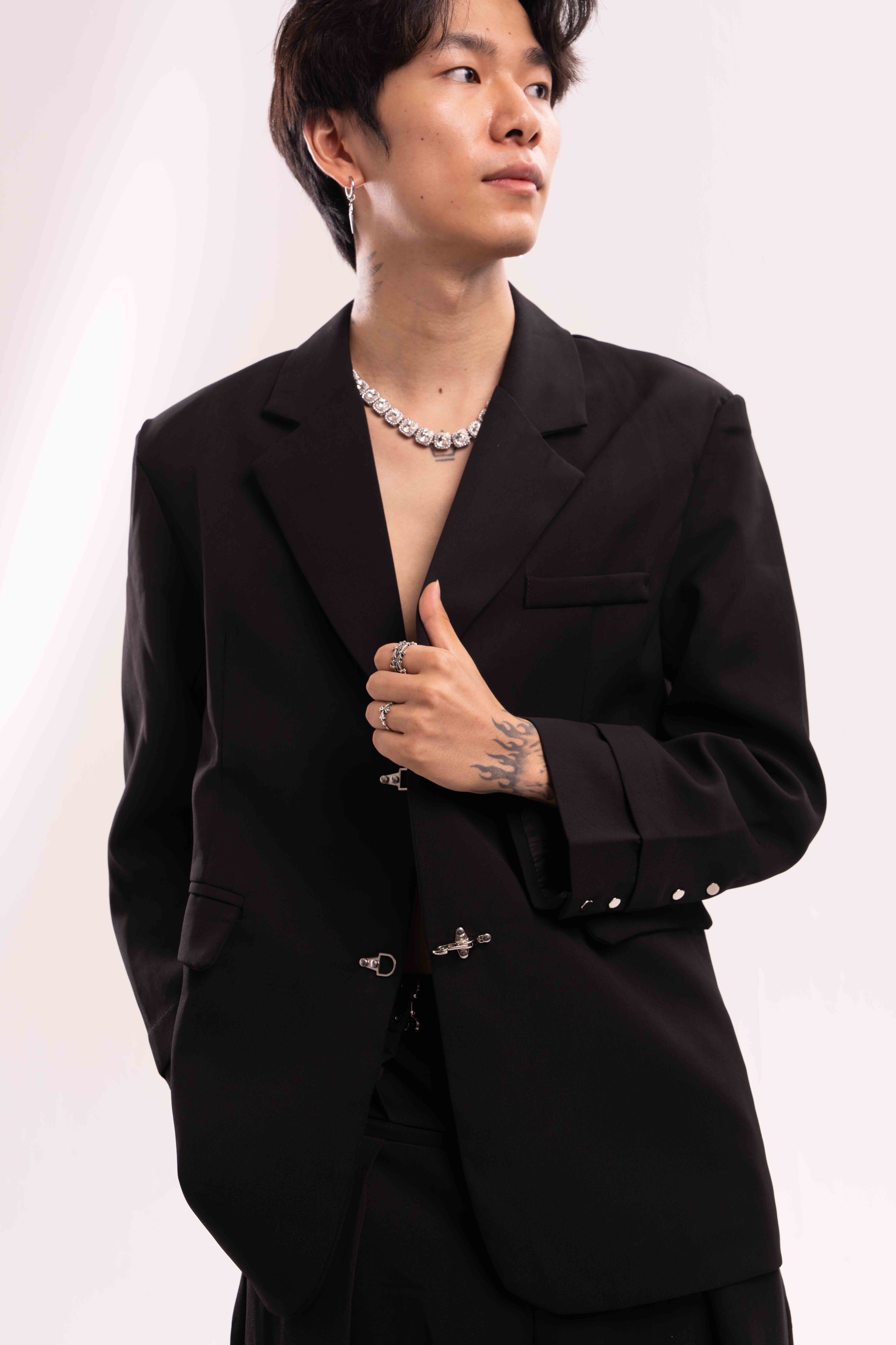 Crafted from premium materials, this blazer stands out with its unique silver buckled closures and mock-layered sleeves. Ideal for those who appreciate a blend of timeless tailoring and contemporary design touches. It's a statement piece that exudes confidence and serves both style and functionality.