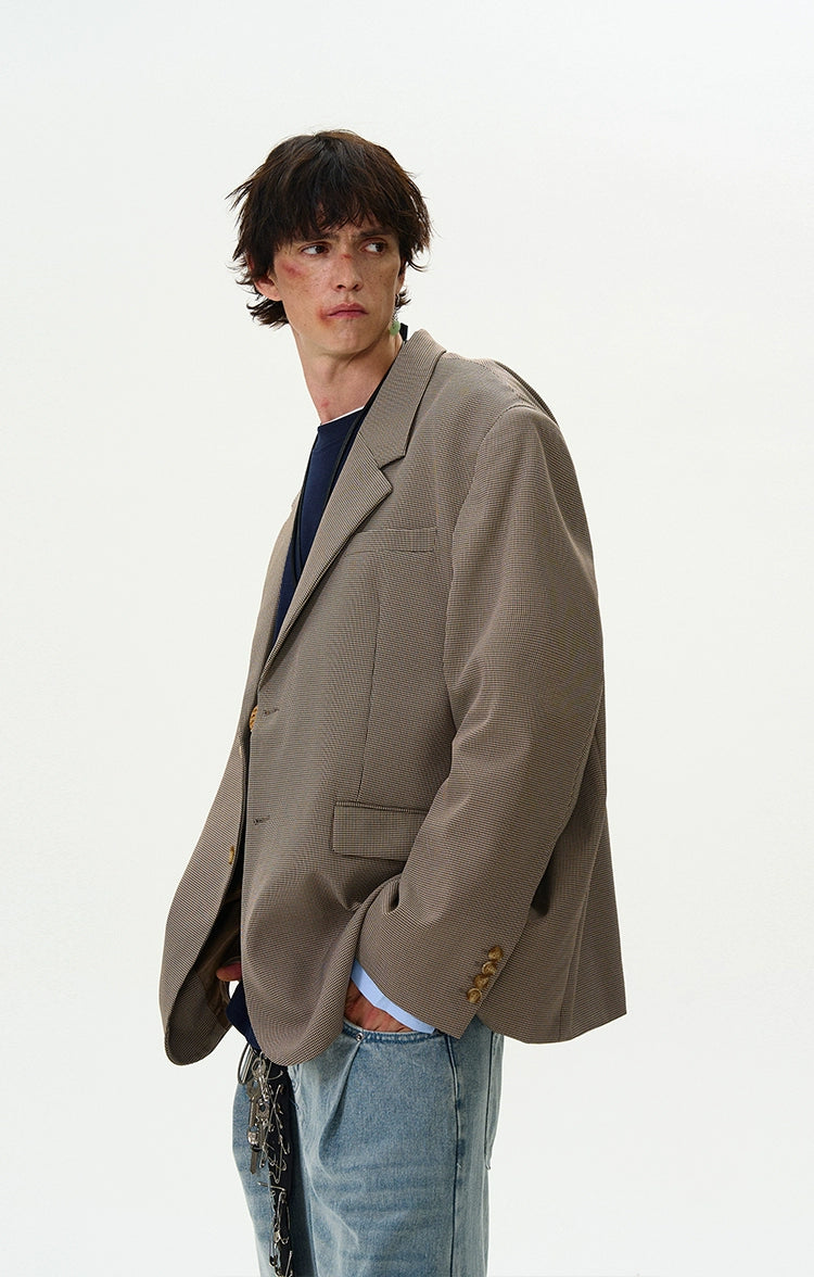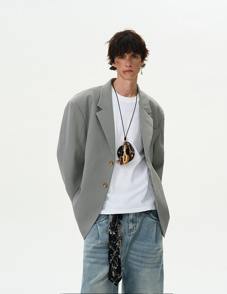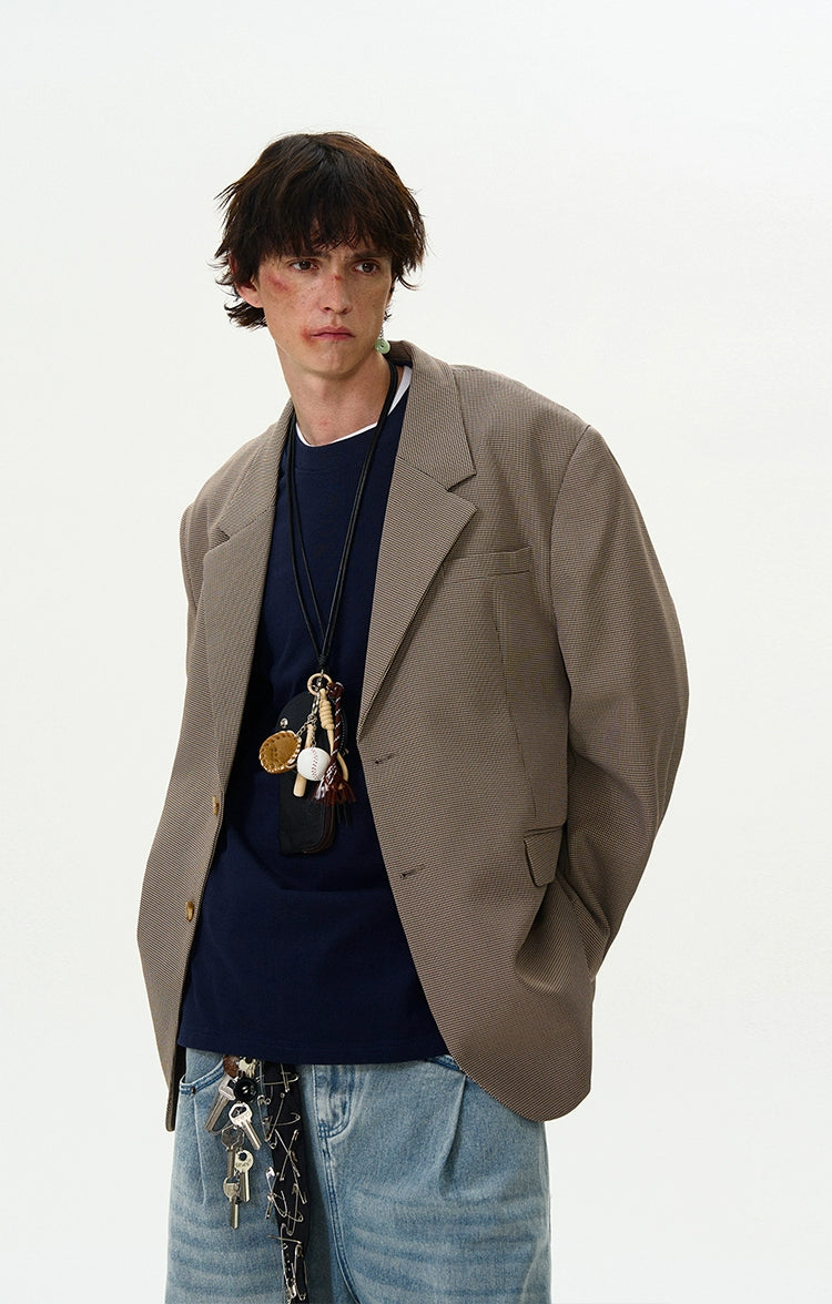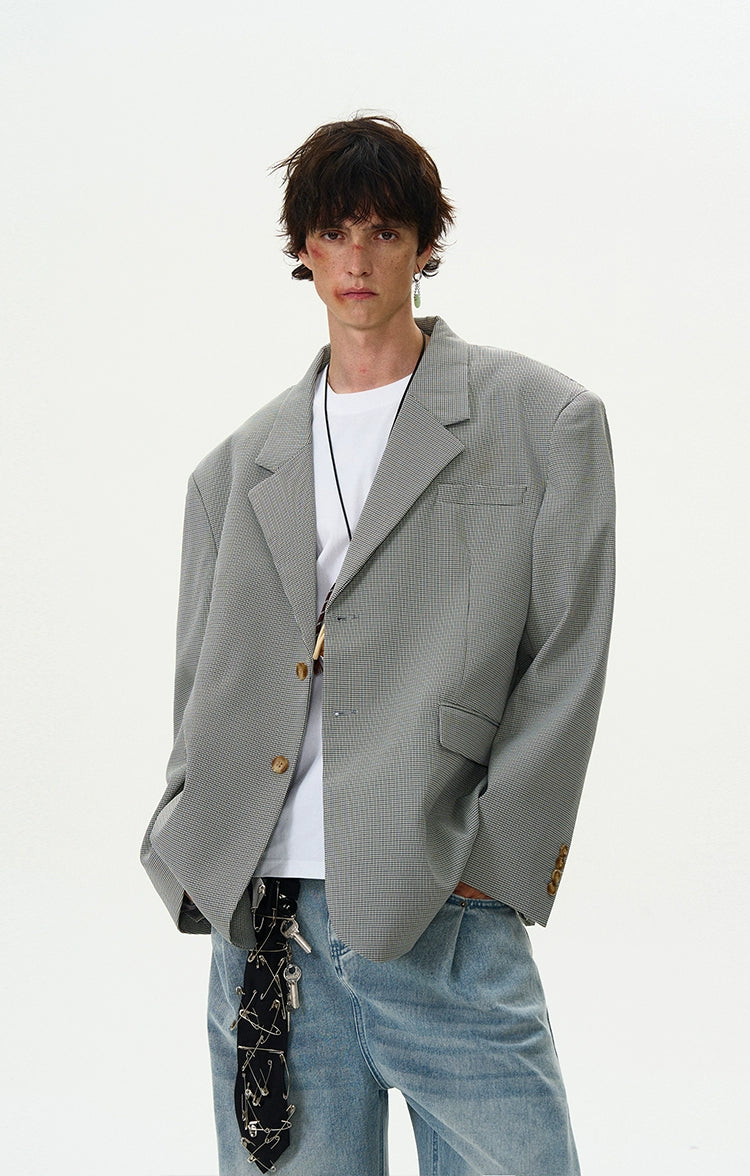 Oversized Checker Single-Breasted Blazer with Flap Pockets