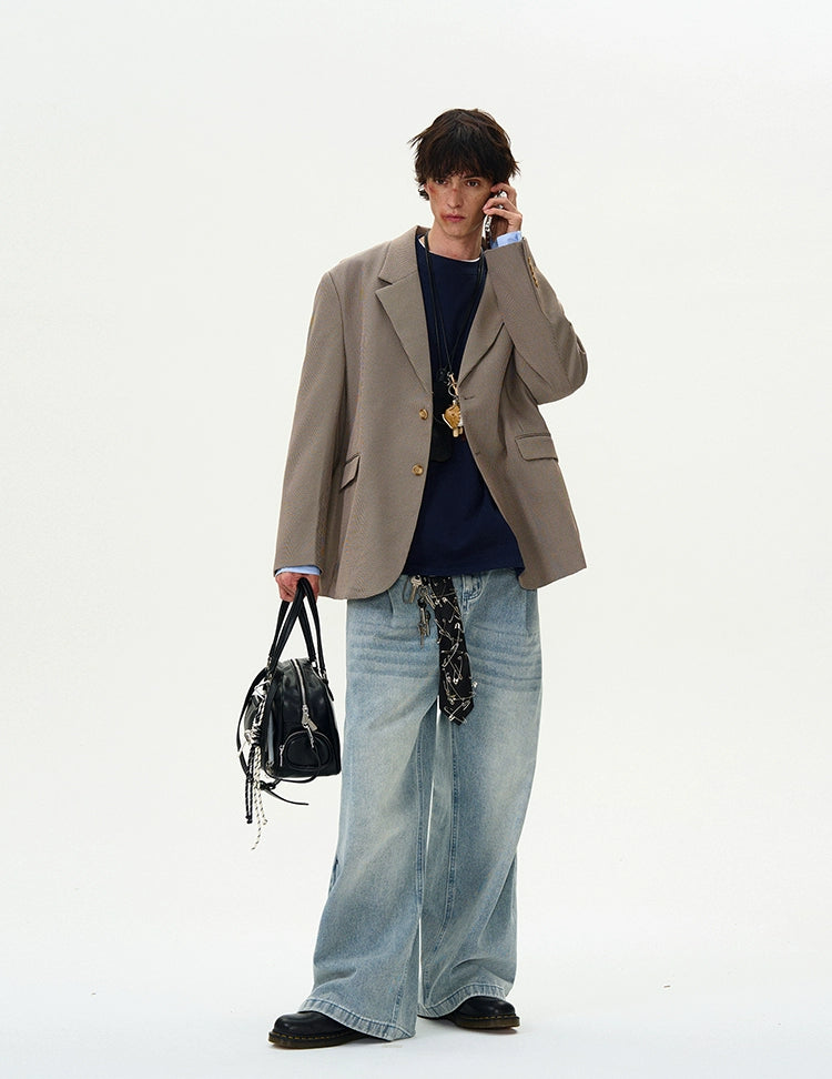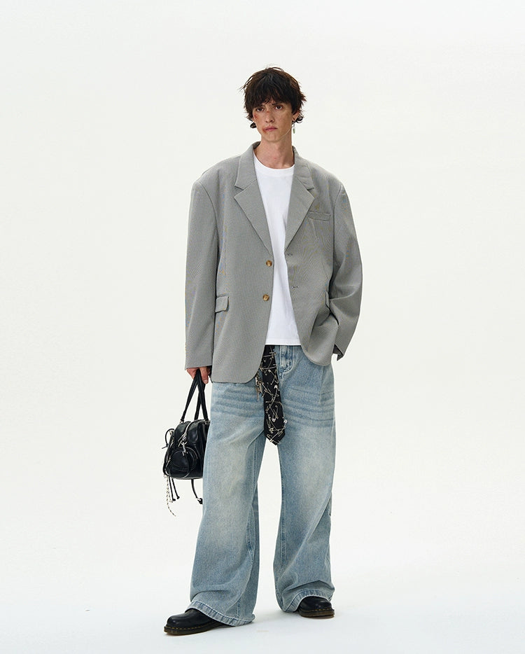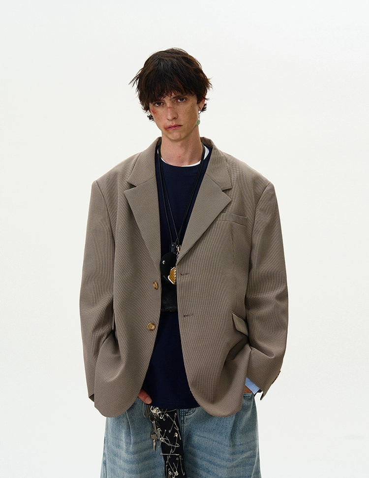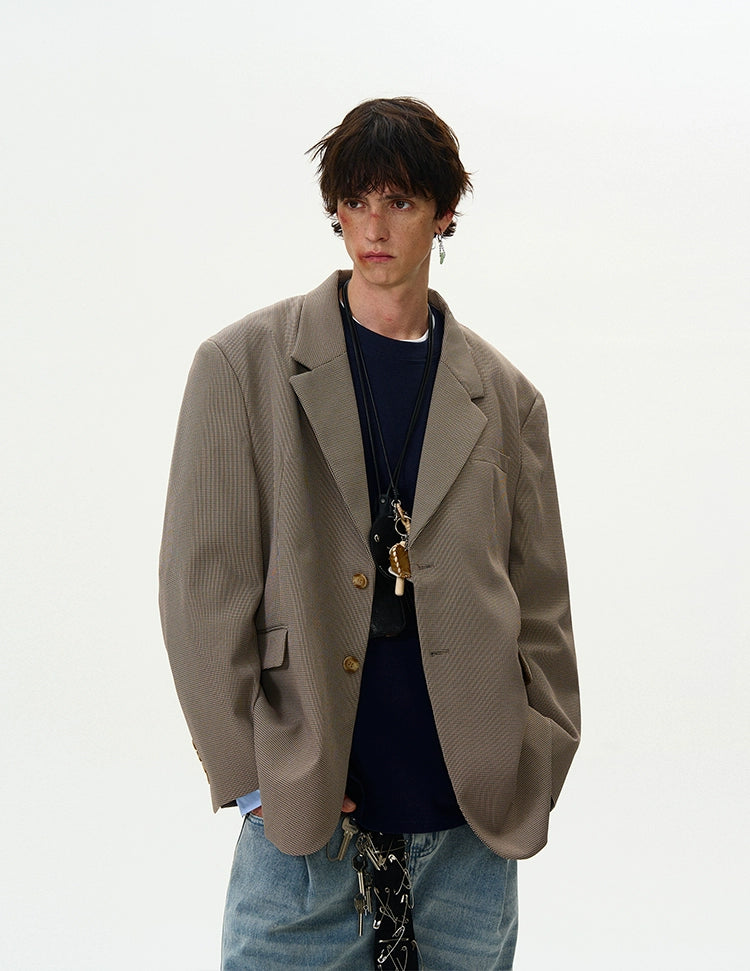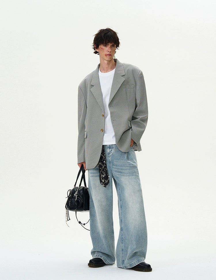 Oversized Checker Single-Breasted Blazer with Flap Pockets