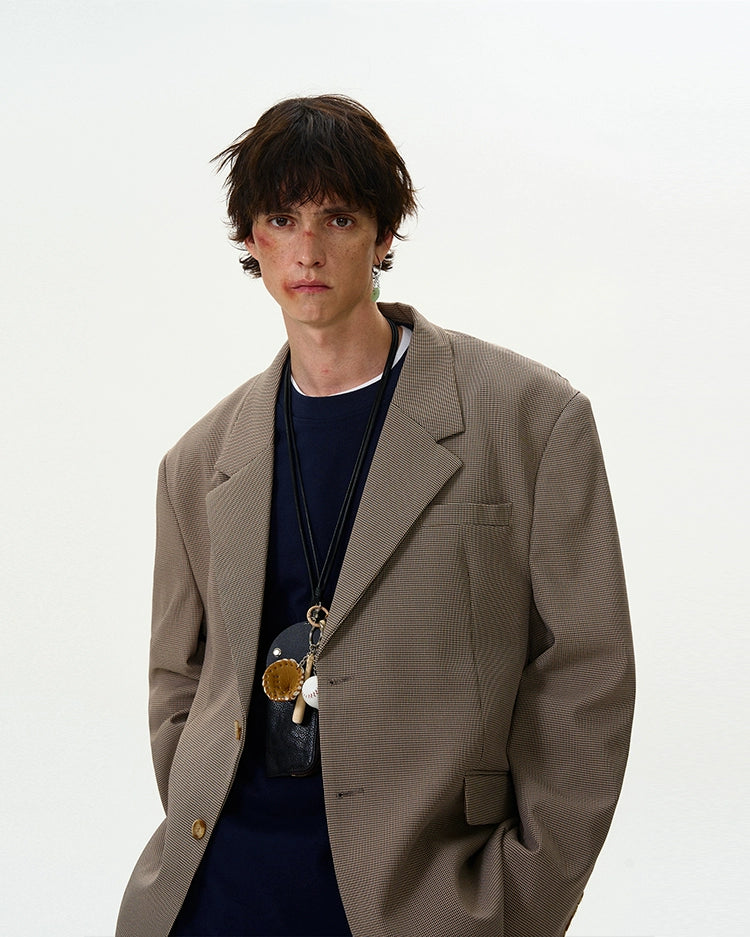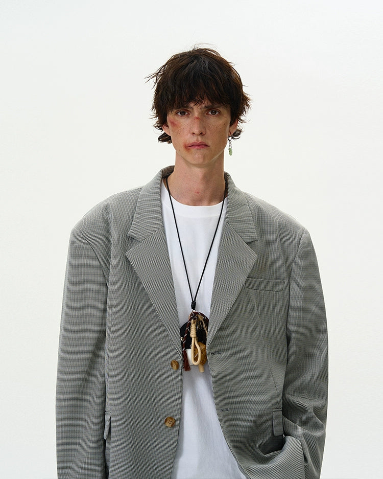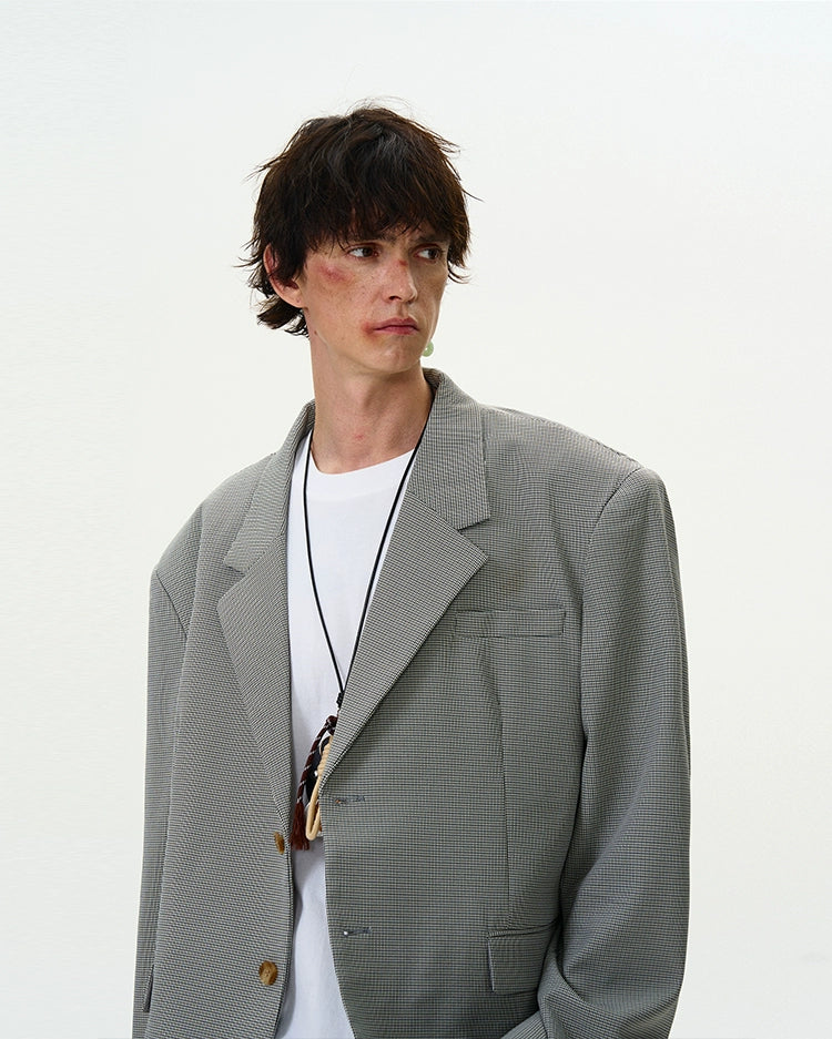 Its timeless checkered pattern and relaxed silhouette create a versatile statement piece that transitions seamlessly between workwear and casual outings. Crafted with precision, this blazer boasts a loose fit complemented by padded shoulders to accentuate its structured design.