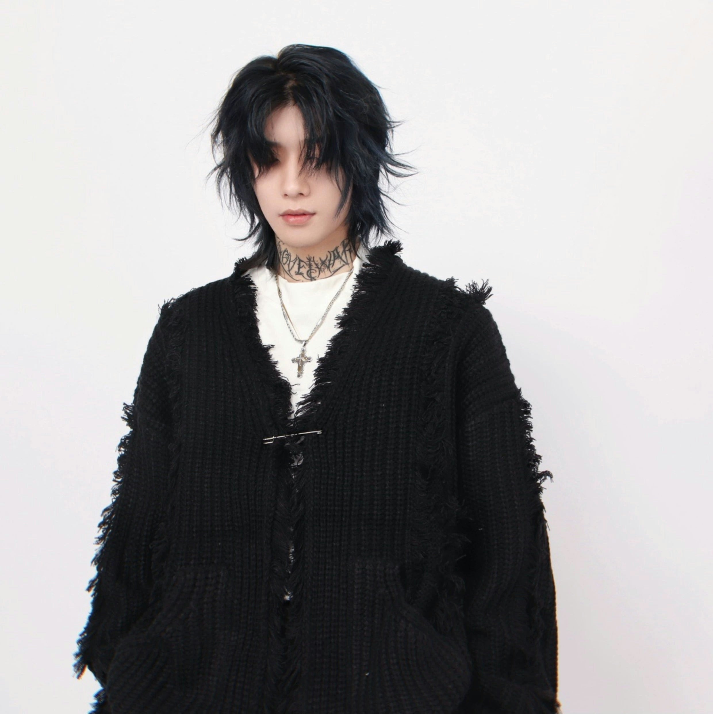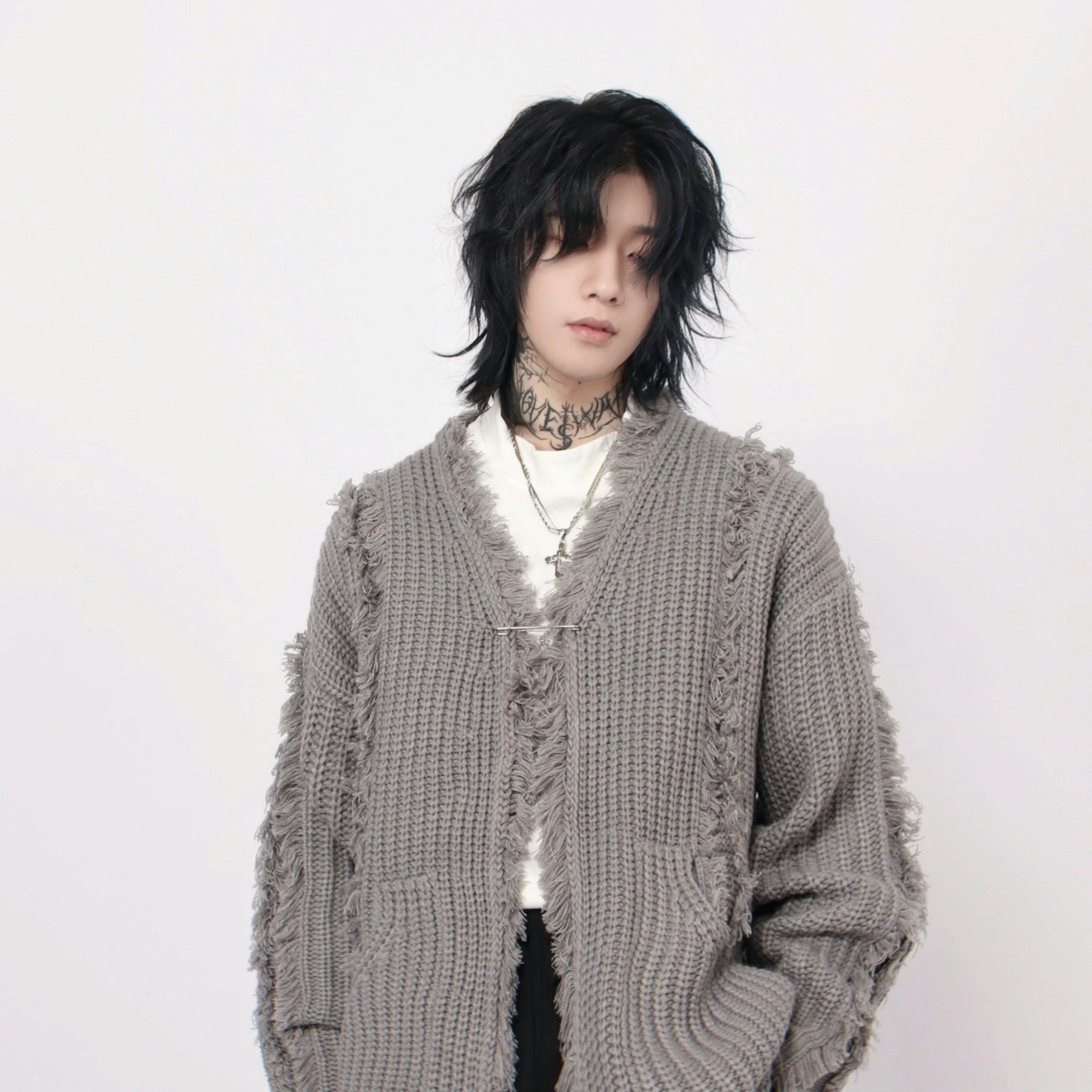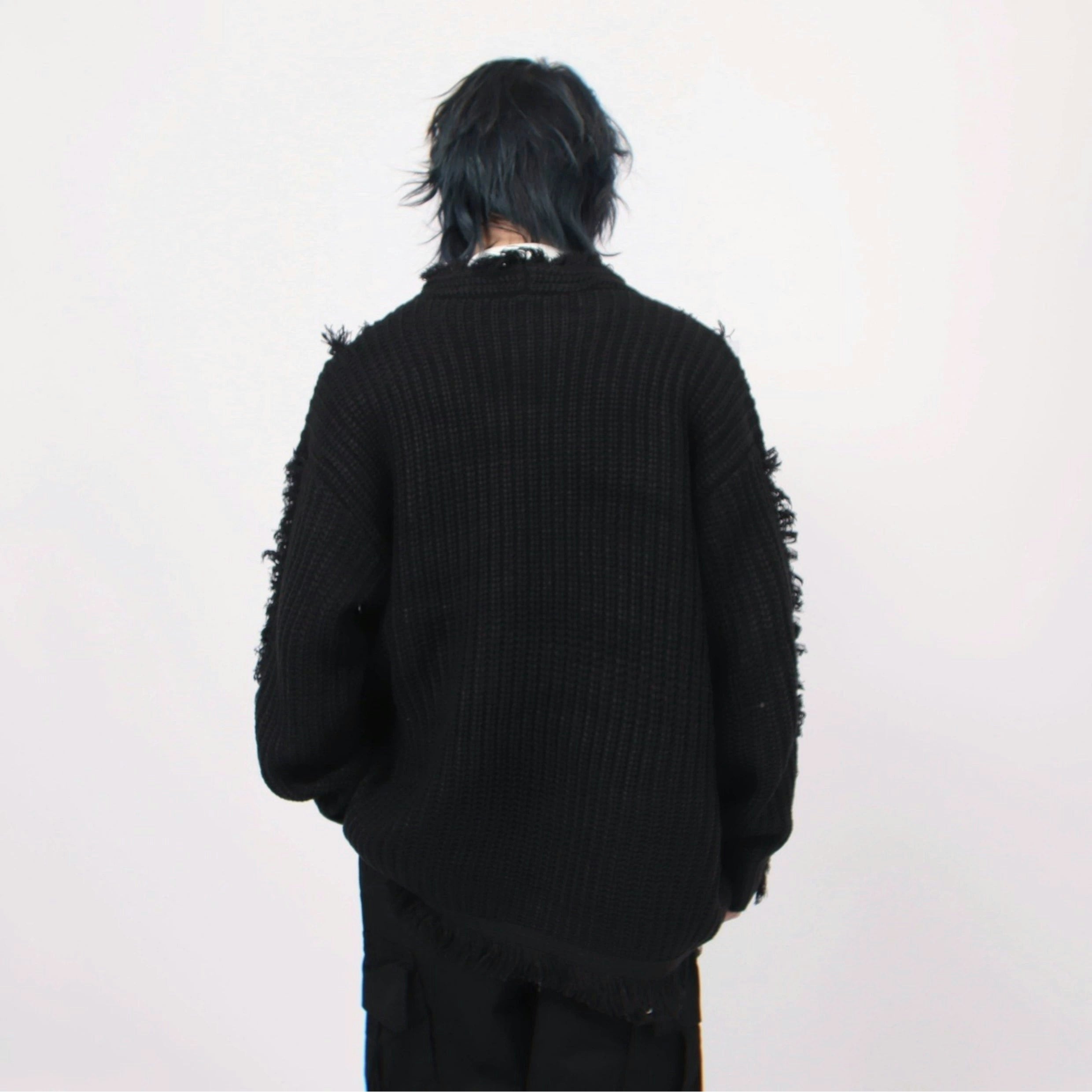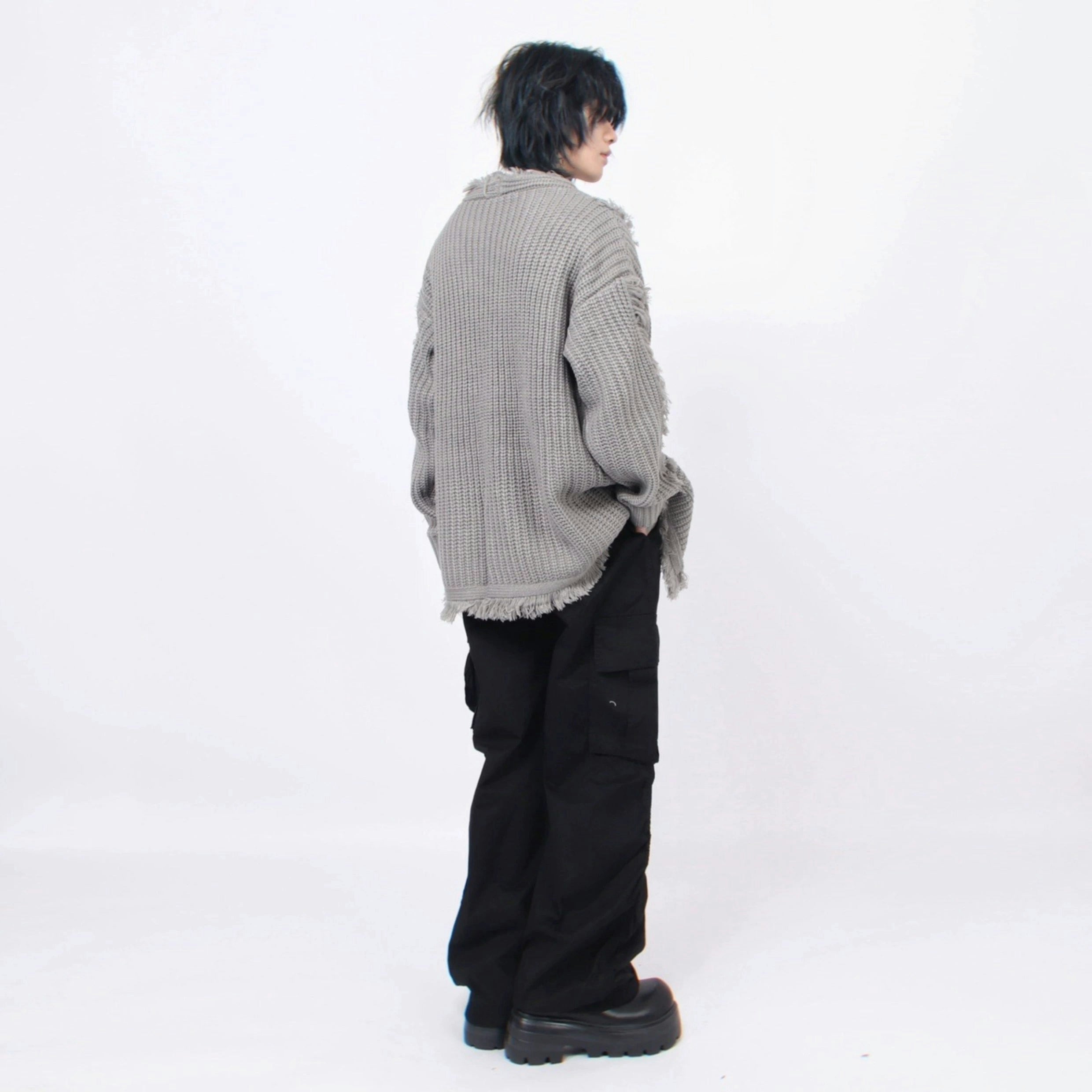 Crafted from a cozy knit fabric, it boasts a distinctive distressed texture that adds an effortlessly cool edge to any outfit. Its V-neckline and relaxed shape ensure easy layering, making it a must-have for any casual occasion.