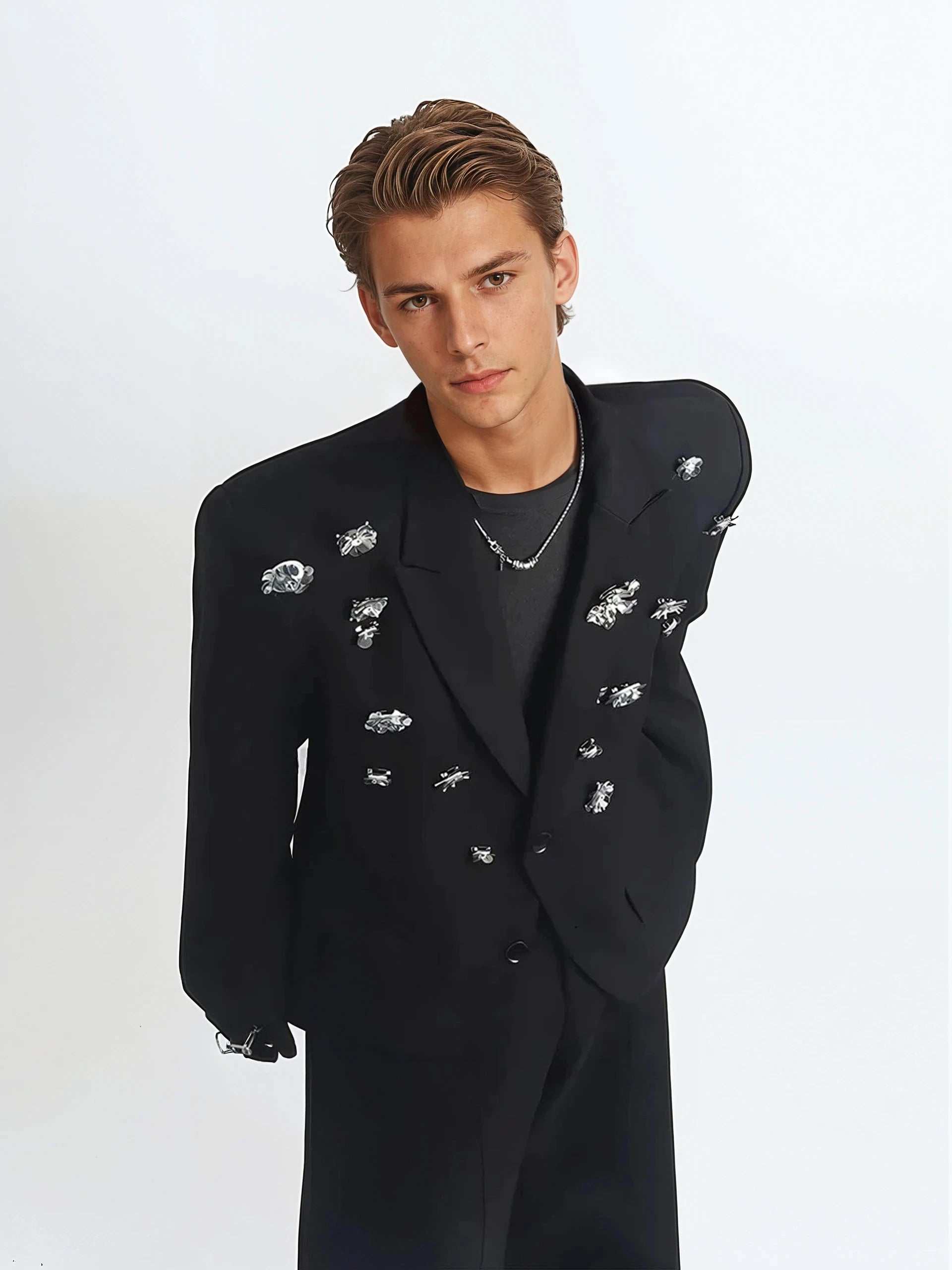 Made from a structured medium-weight fabric, its clean black base serves as a backdrop for textured floral crystal detailing across the front. The sharp shoulders, long sleeves, and two-button closure give it a strong silhouette, while the relaxed fit adds a modern, laid-back sensibility.