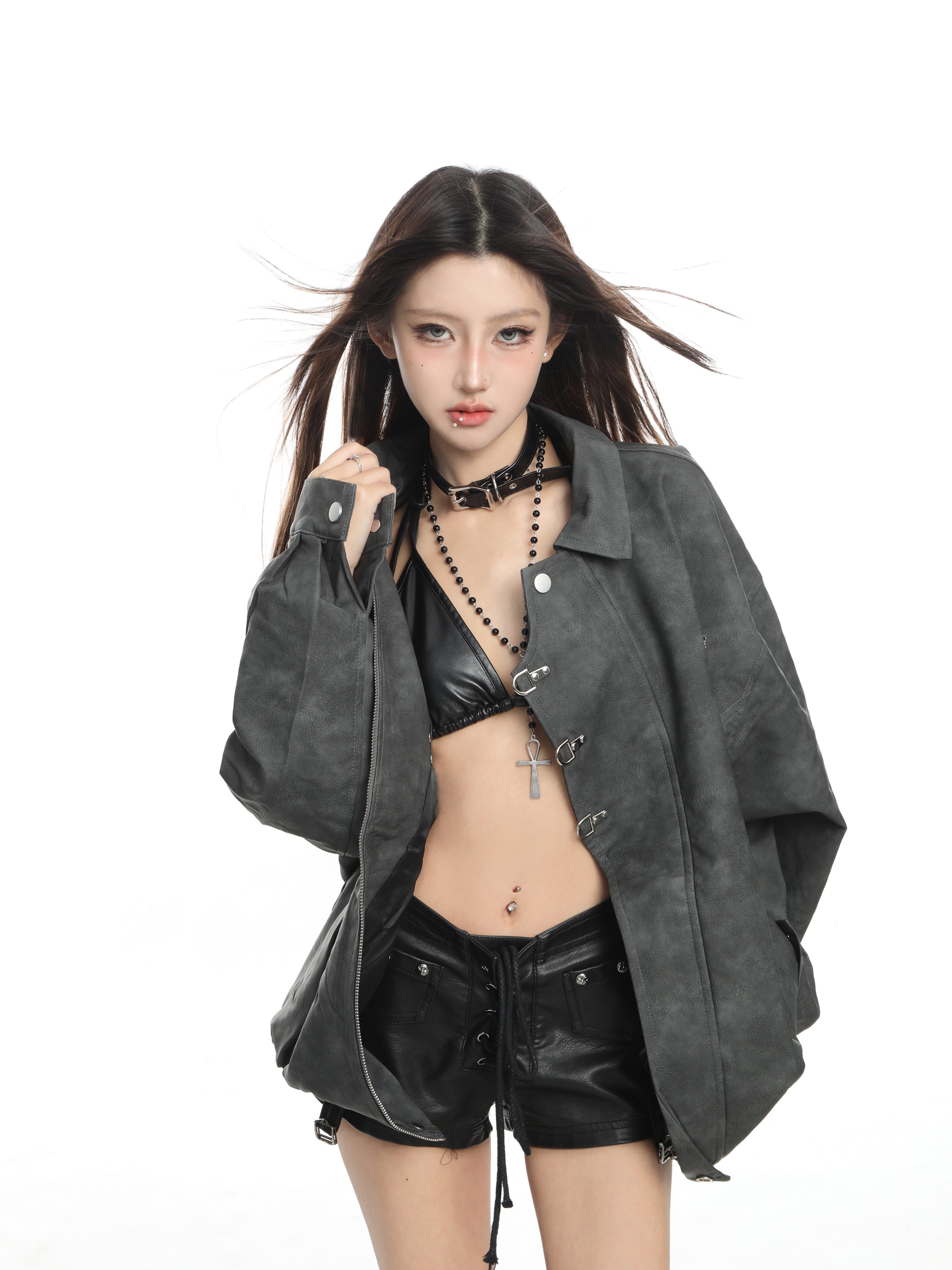 Made from soft faux suede, this jacket features striking fireman buckle hardware that adds a distinct edge to its timeless lapel design. The oversized fit and versatile zip closure ensure a comfortable yet structured silhouette, making it perfect for layering through transitional weather. Its smooth texture and rich tone make this piece effortlessly cool while remaining practical for all-day wear.