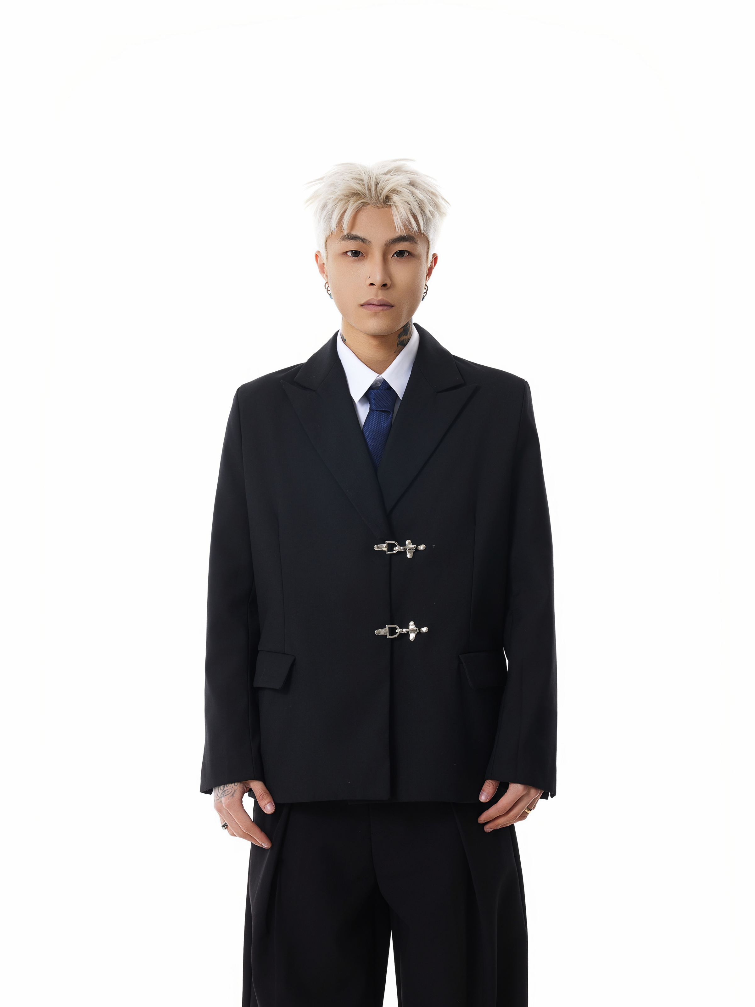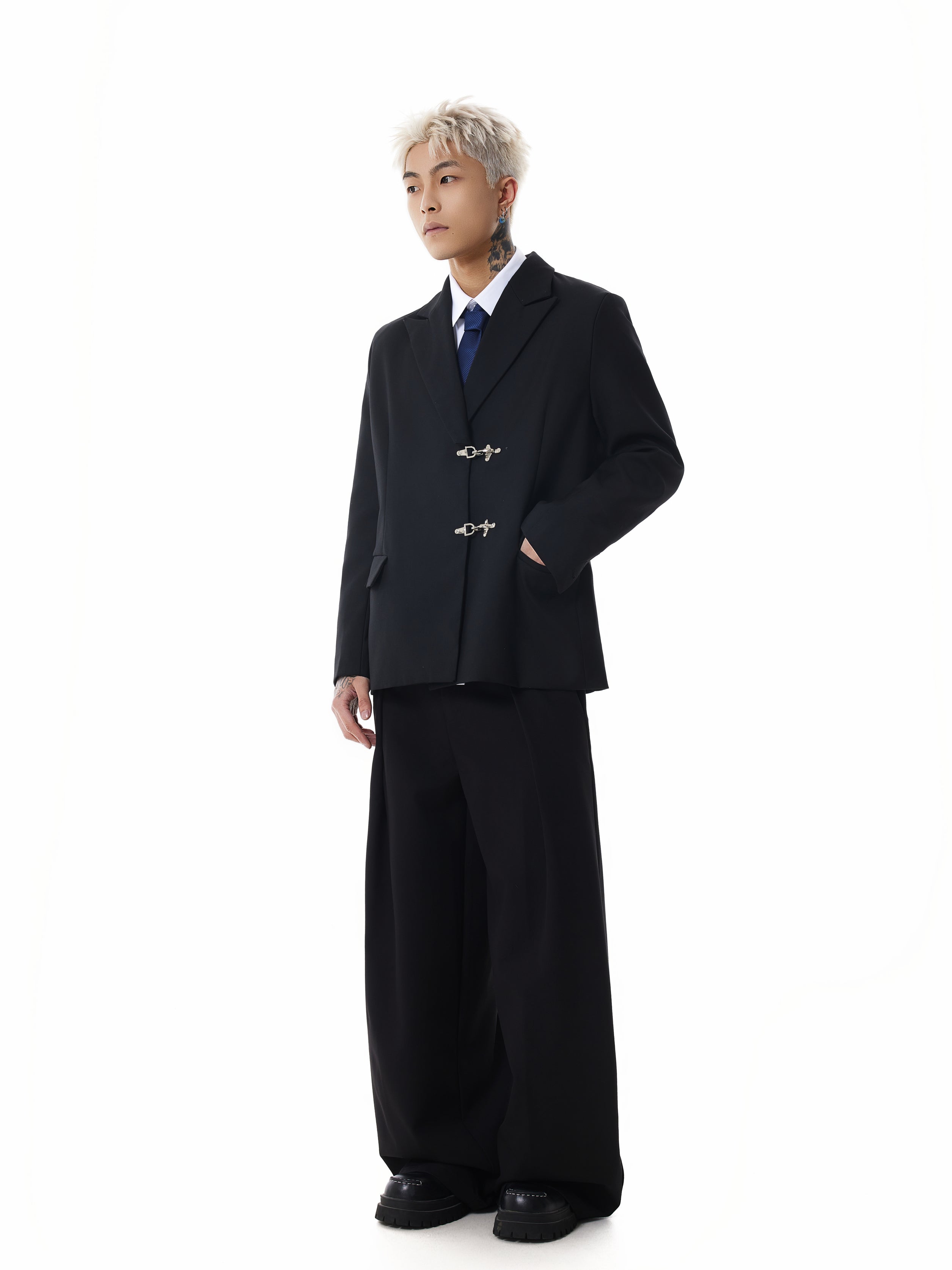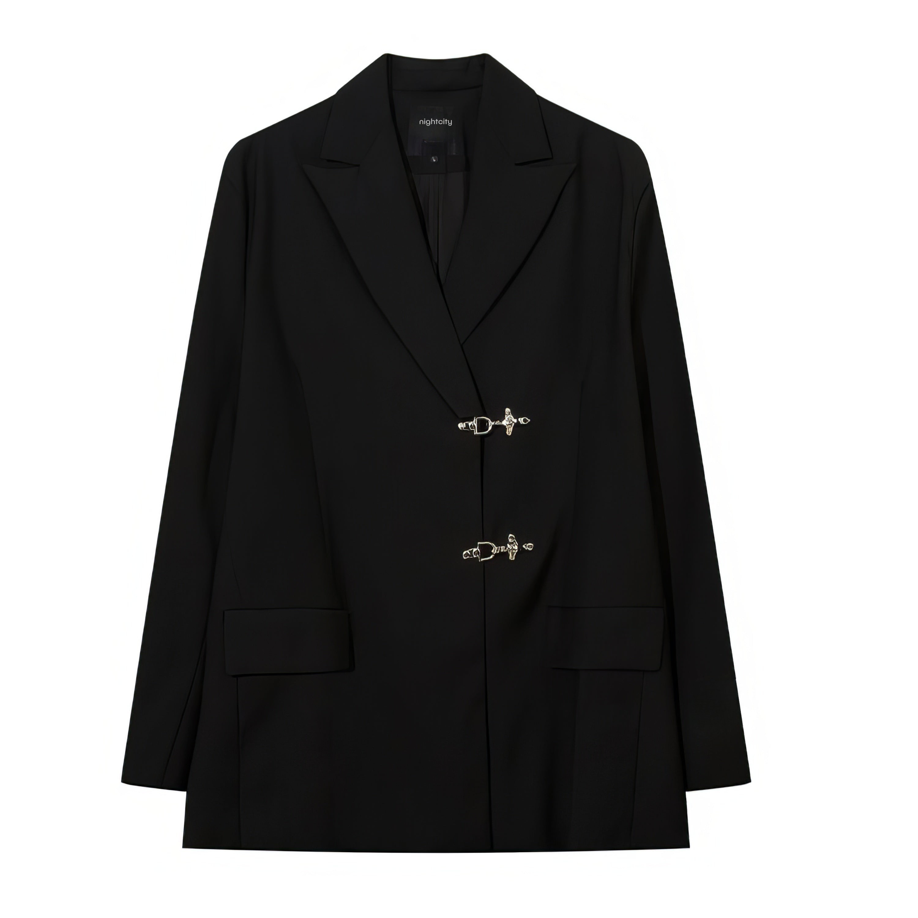Designed with a sleek, solid black color, this blazer features a classic suit collar complemented by eye-catching silver fireman clasp buckle closures for a unique edgy appeal. Practical and stylish, the blazer boasts convenient patch pockets and a loose silhouette that provides both a contemporary aesthetic and ease of movement.