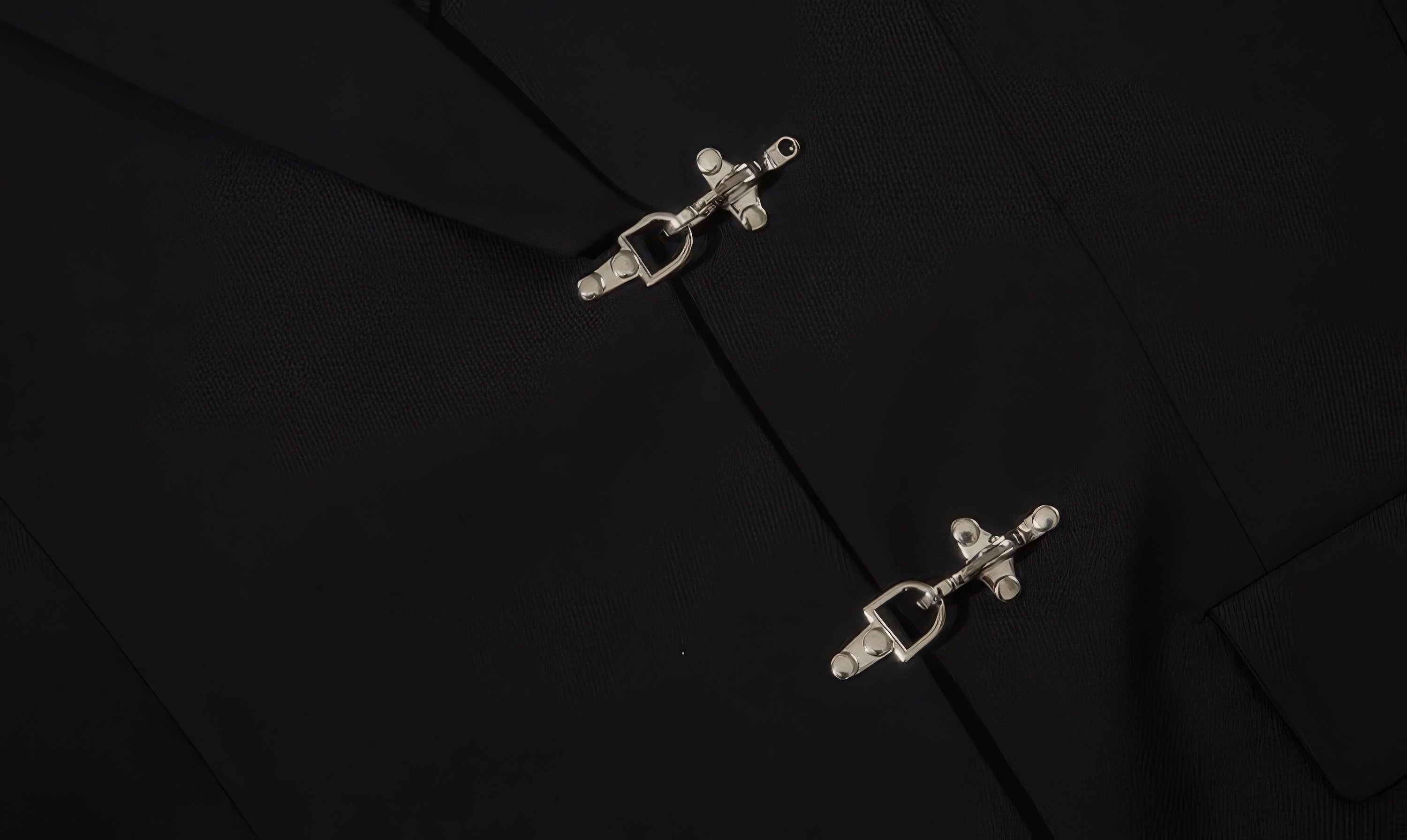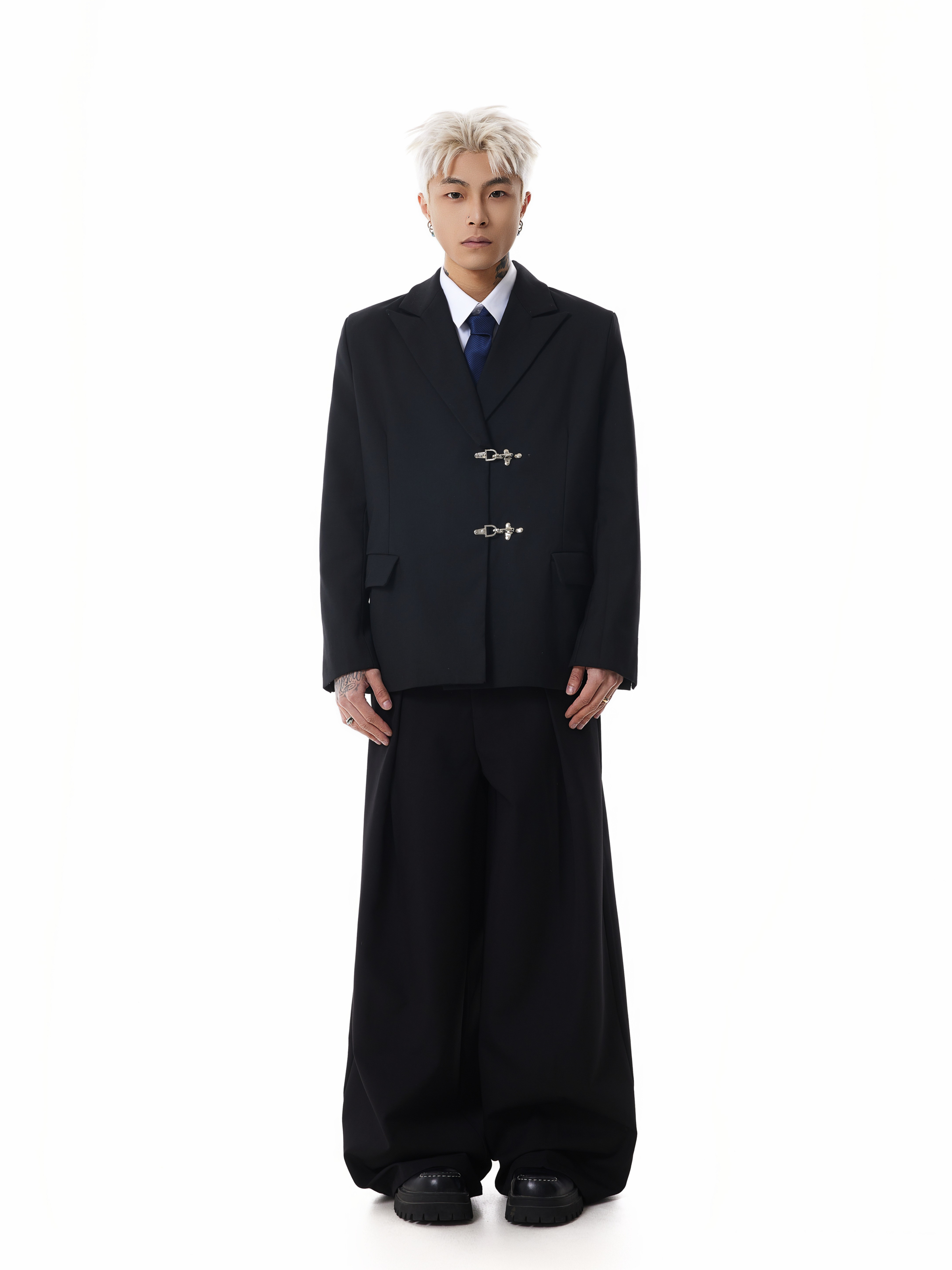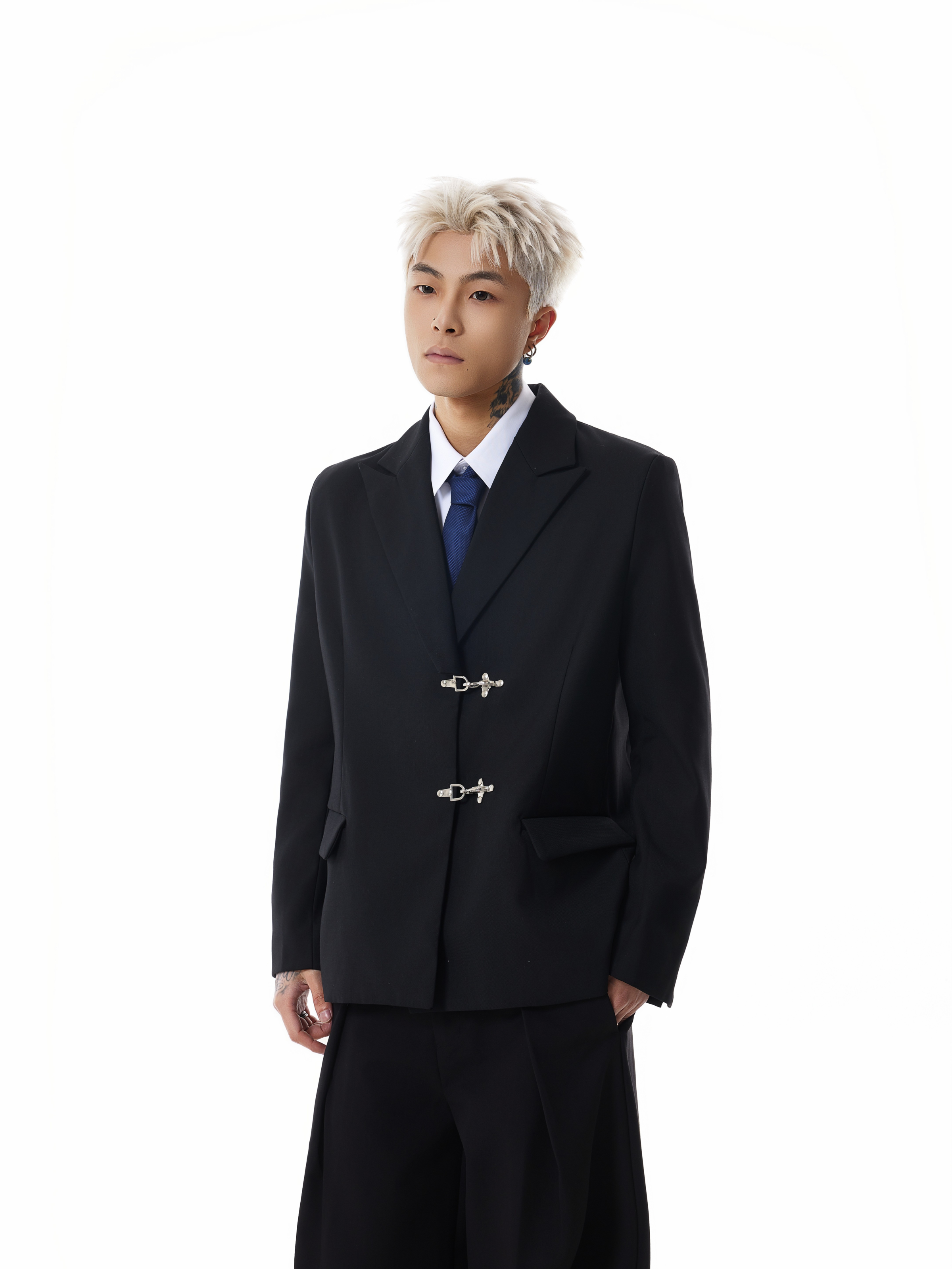 Designed with a sleek, solid black color, this blazer features a classic suit collar complemented by eye-catching silver fireman clasp buckle closures for a unique edgy appeal. Practical and stylish, the blazer boasts convenient patch pockets and a loose silhouette that provides both a contemporary aesthetic and ease of movement.