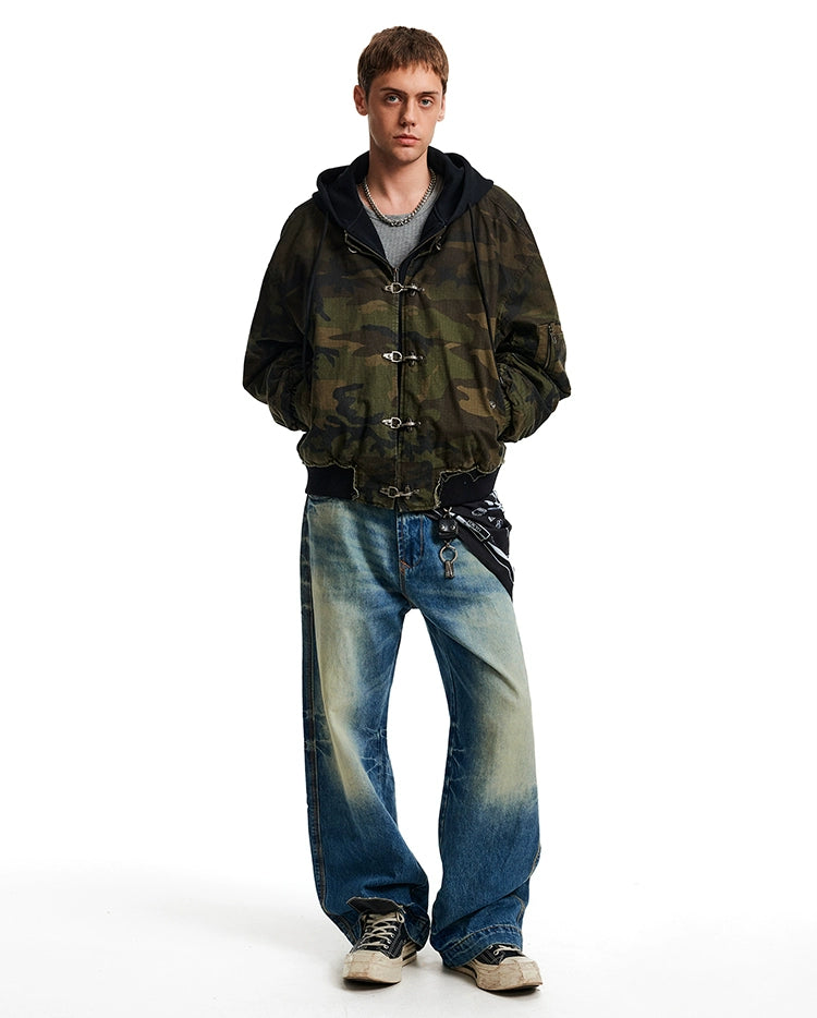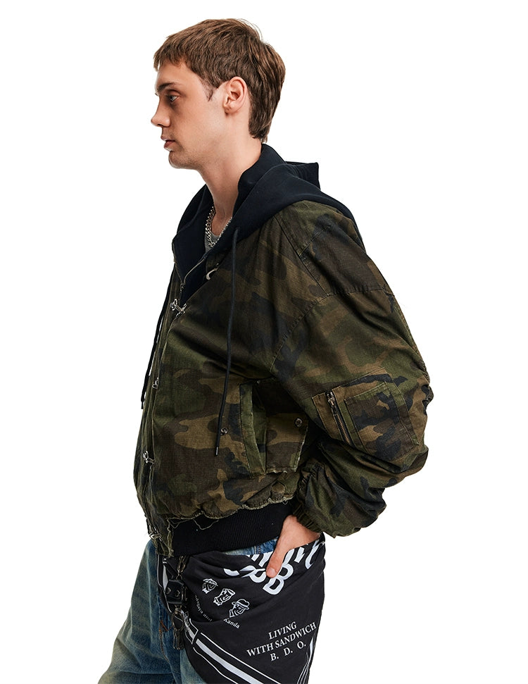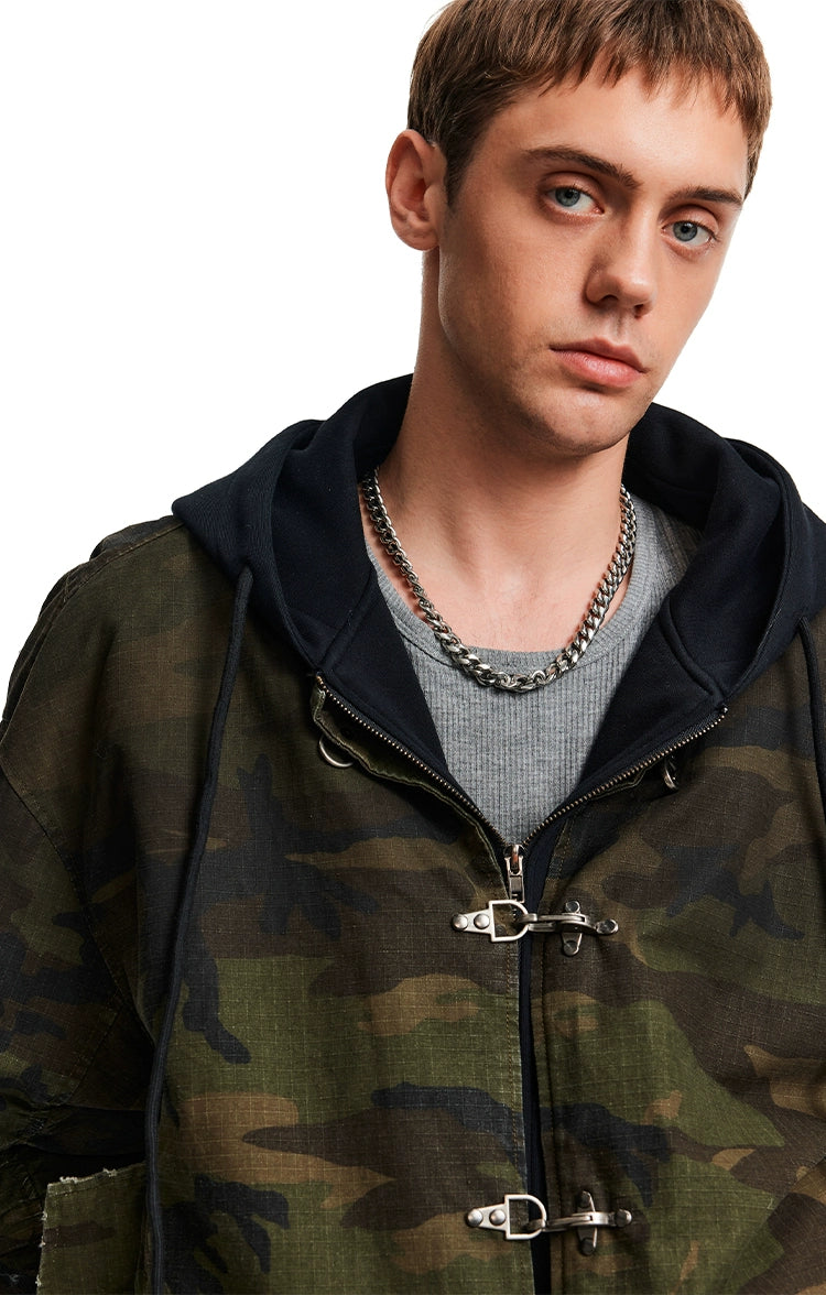 Oversized Fireman Clasp Hooded Distressed Camo Jacket