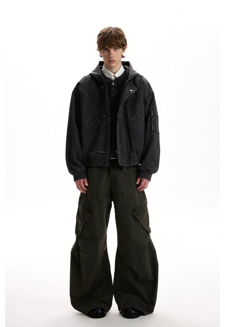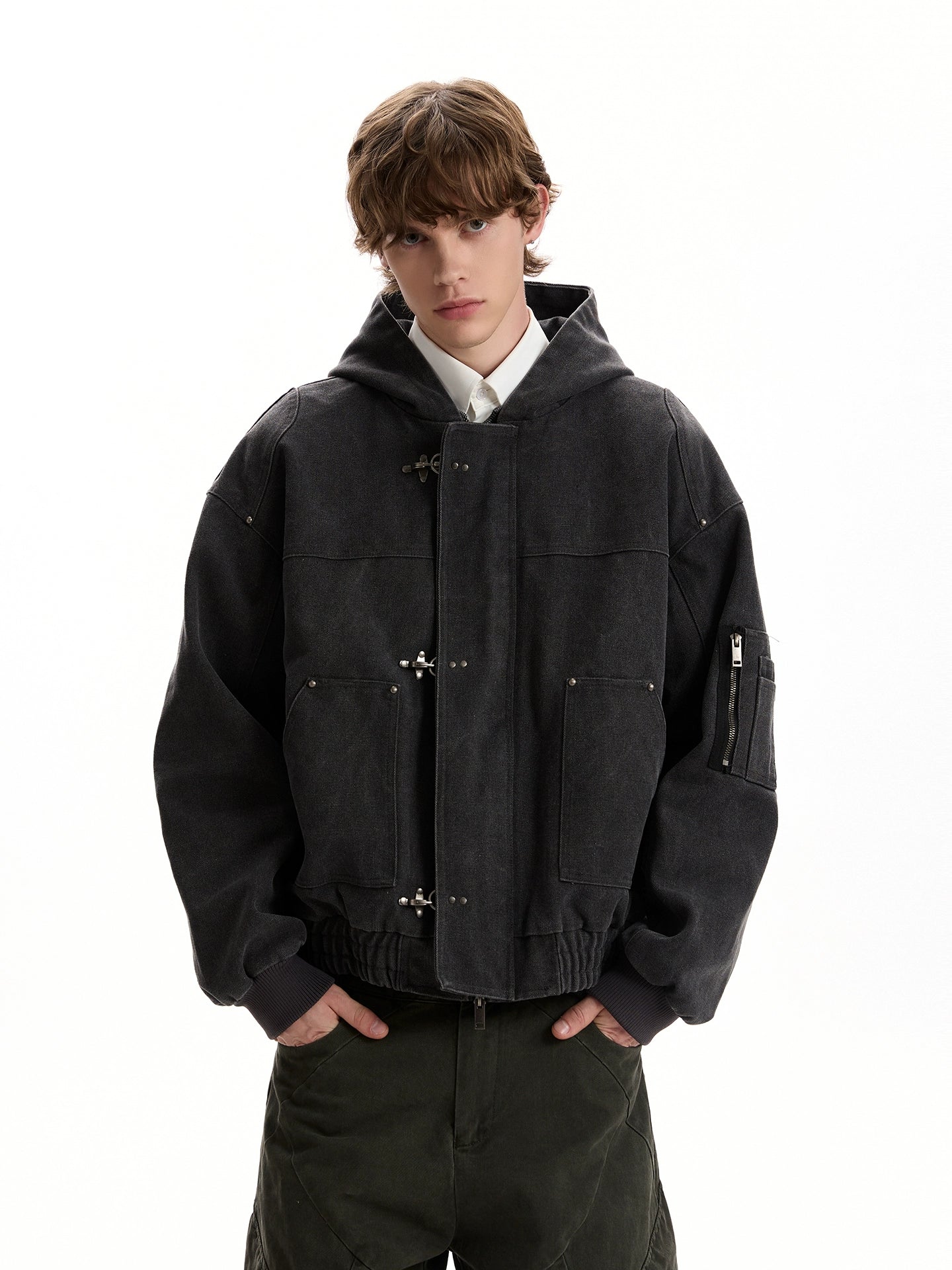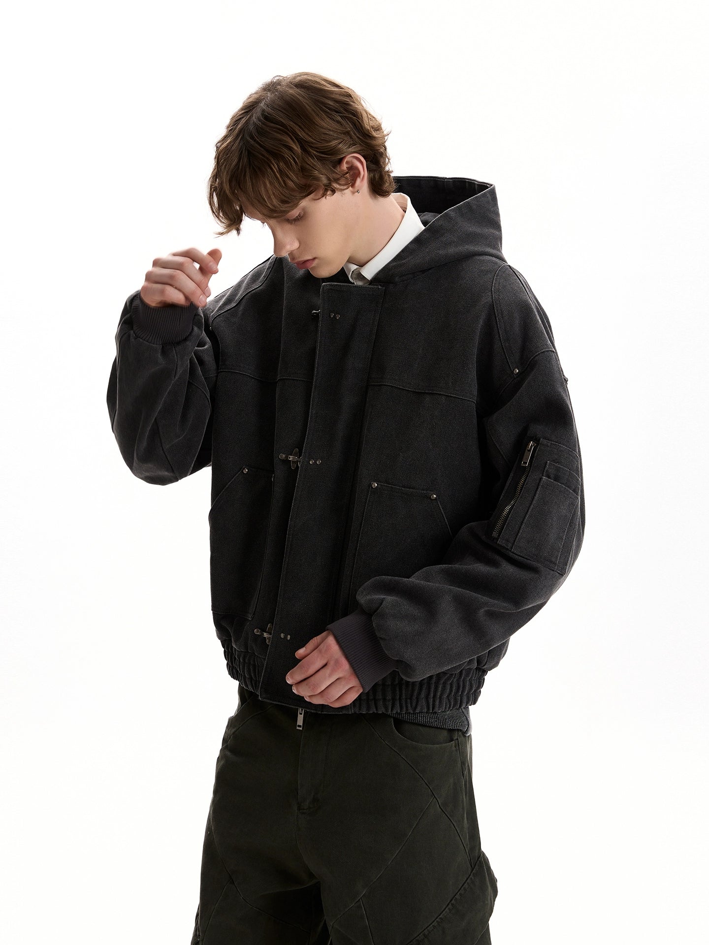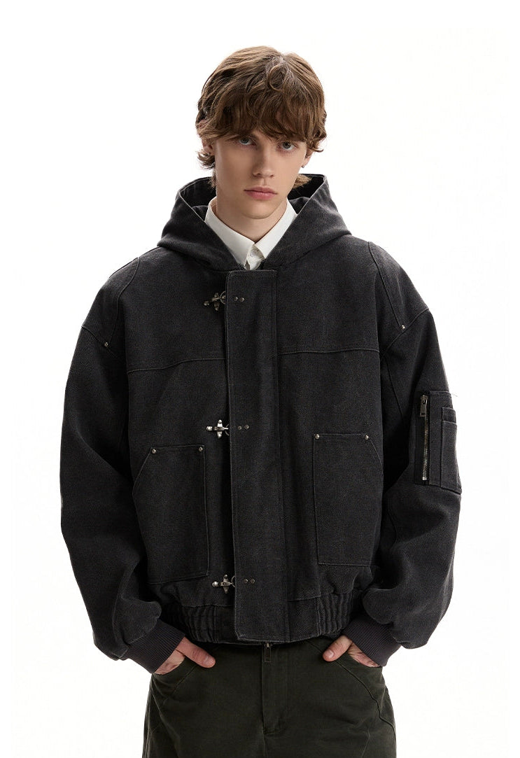 Read full Return PolicyThe Oversized Fireman Clasp Hooded Worker Jacket delivers a rugged, structured look with standout details that make it more than just outerwear.