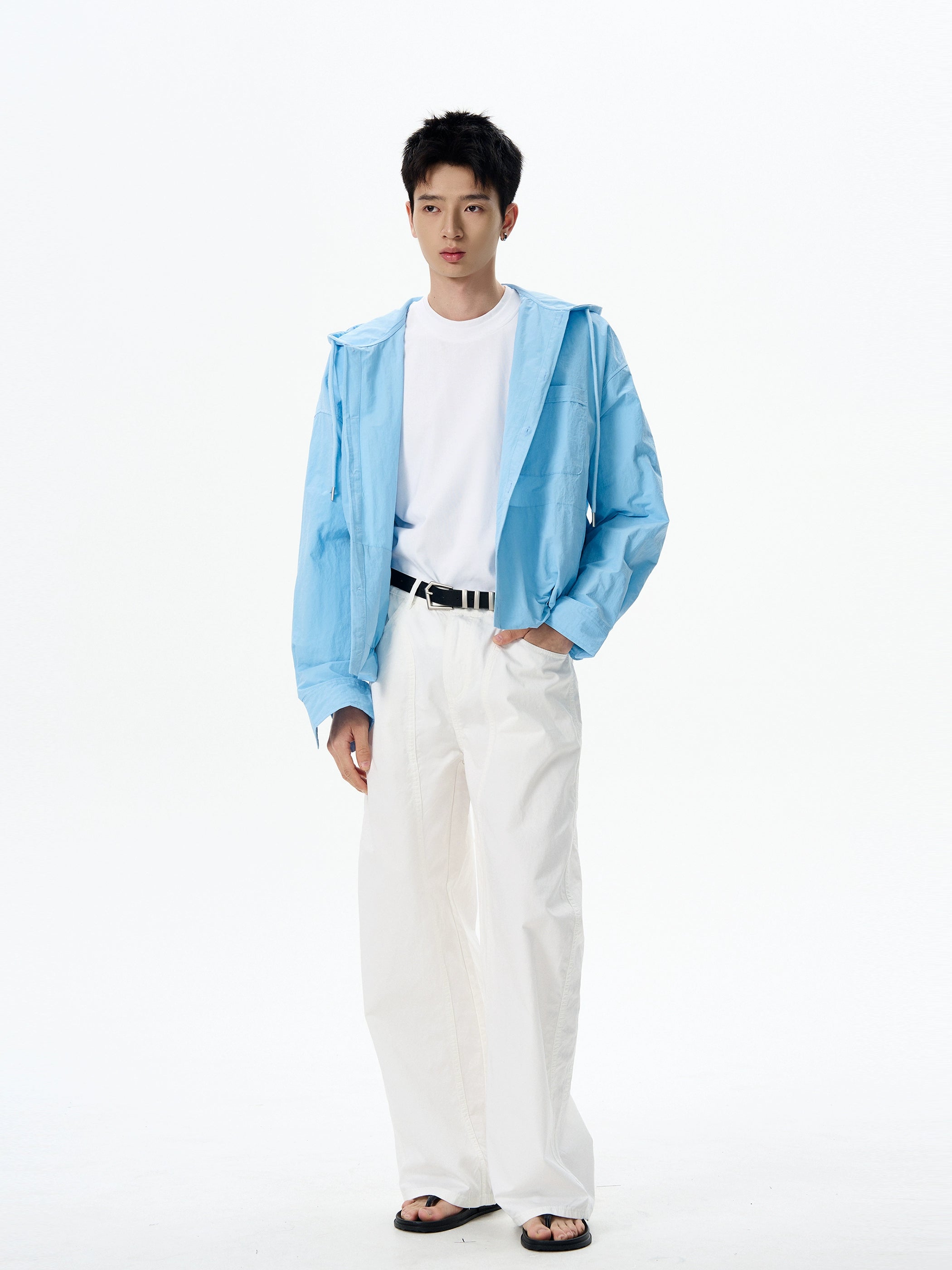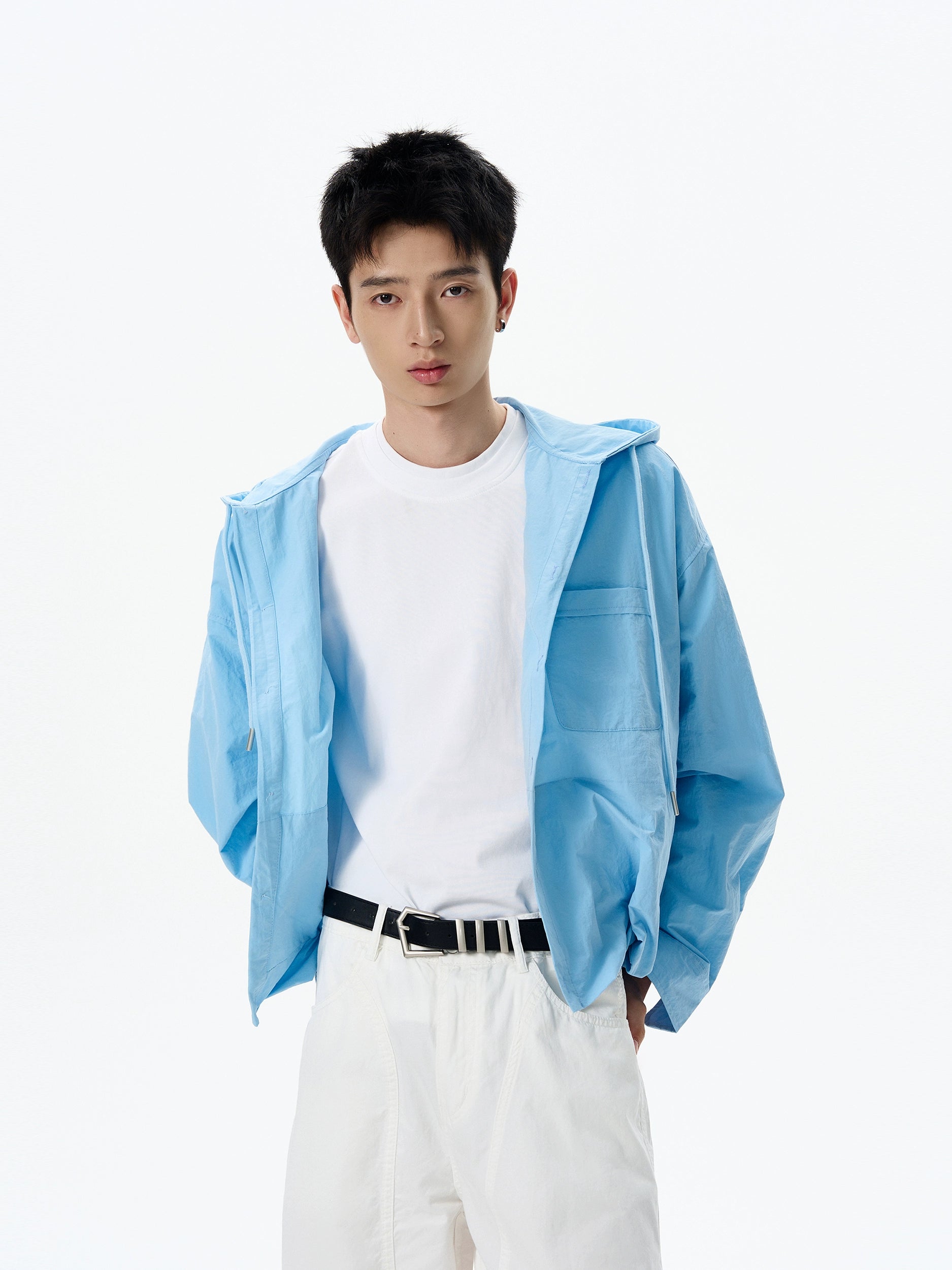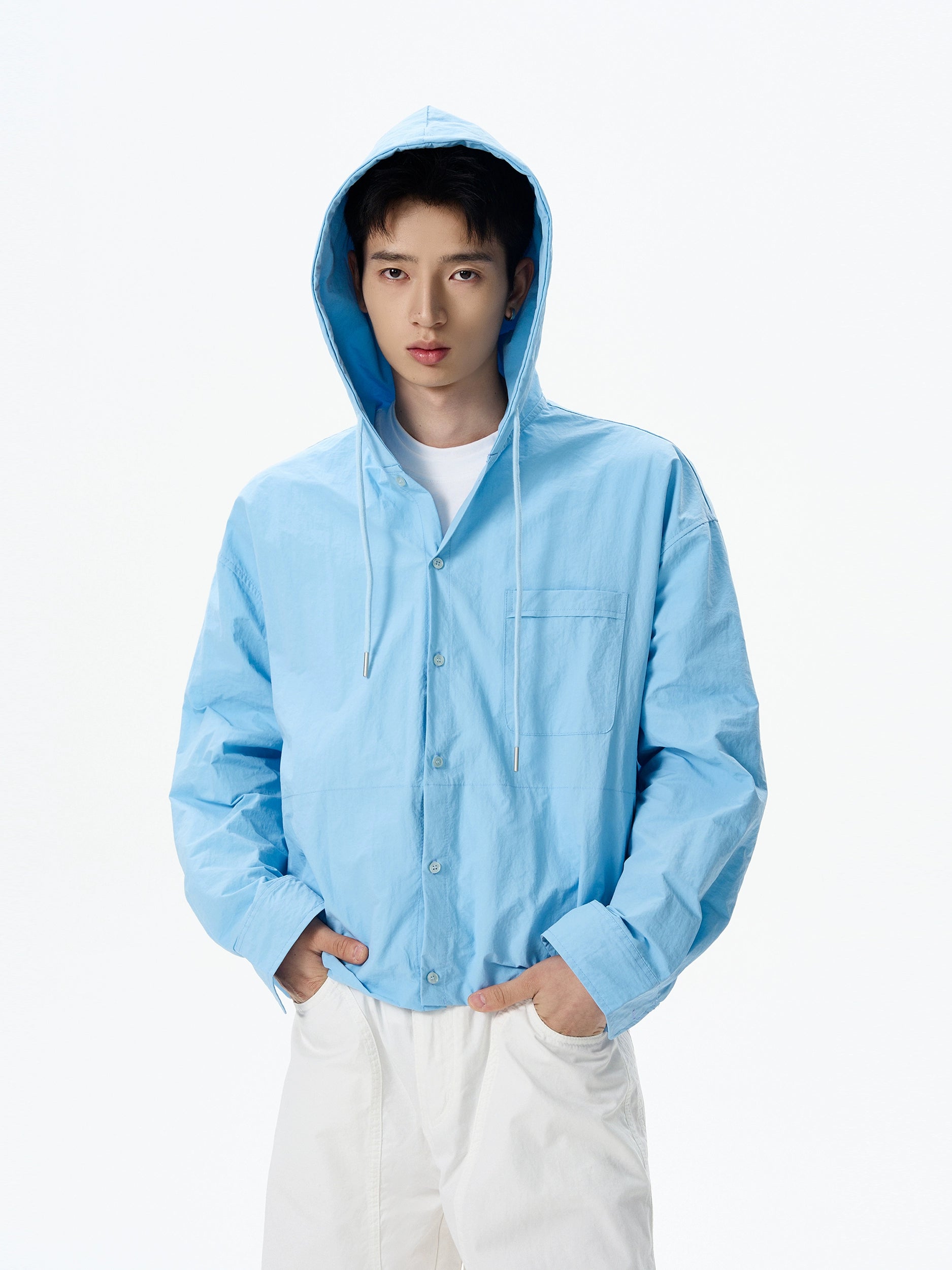 Designed with an easygoing silhouette, it brings the comfort of a hoodie to the clean lines of a shirt. Crafted from a lightweight and breathable fabric, it’s built to keep you covered without overheating. The texture has a subtle crinkle finish for a broken-in feel, while the anti-UV functionality adds a layer of practicality. Button-up closure, drawstring hood, and flap chest pocket complete the minimalist yet wearable design.