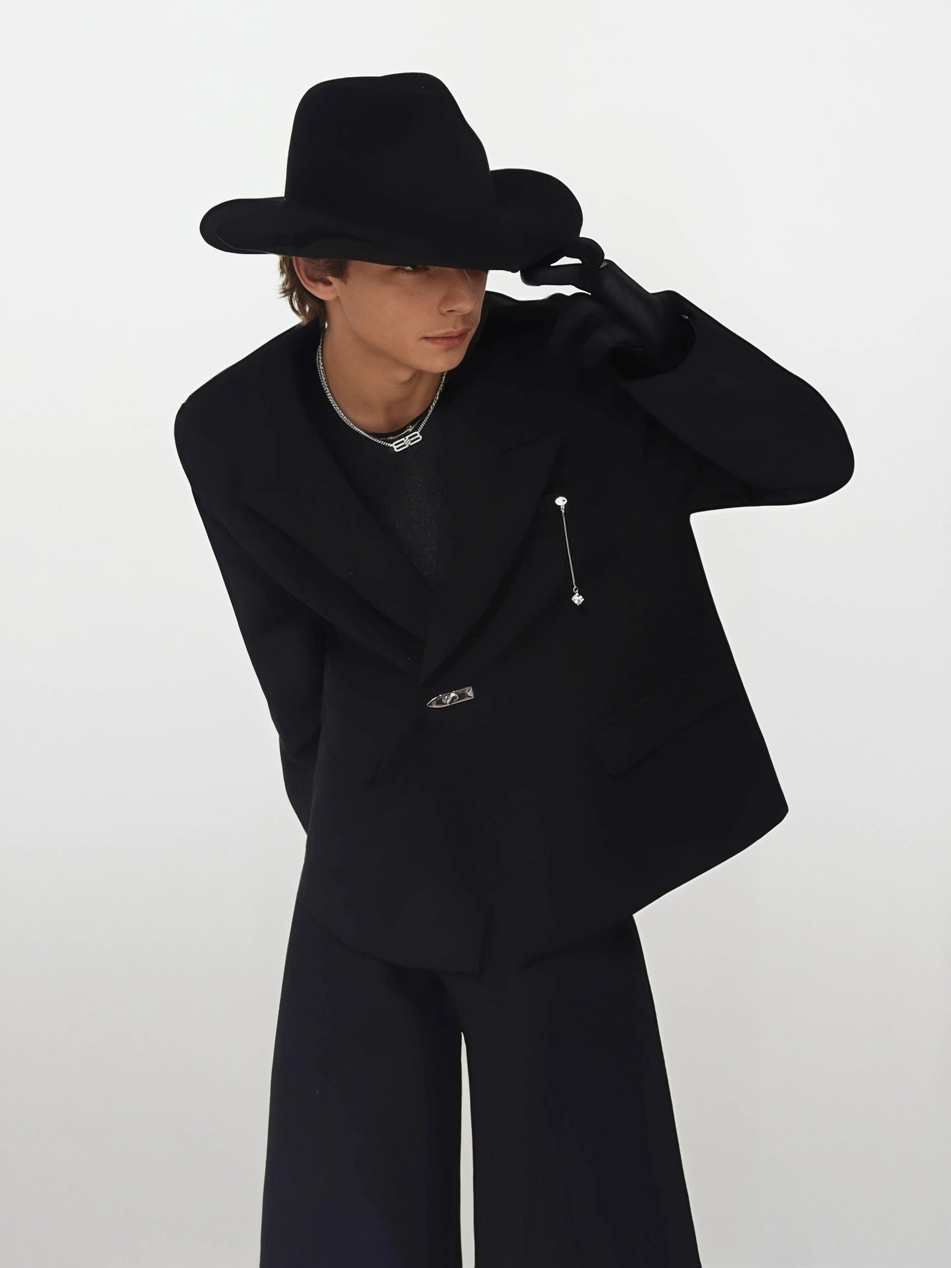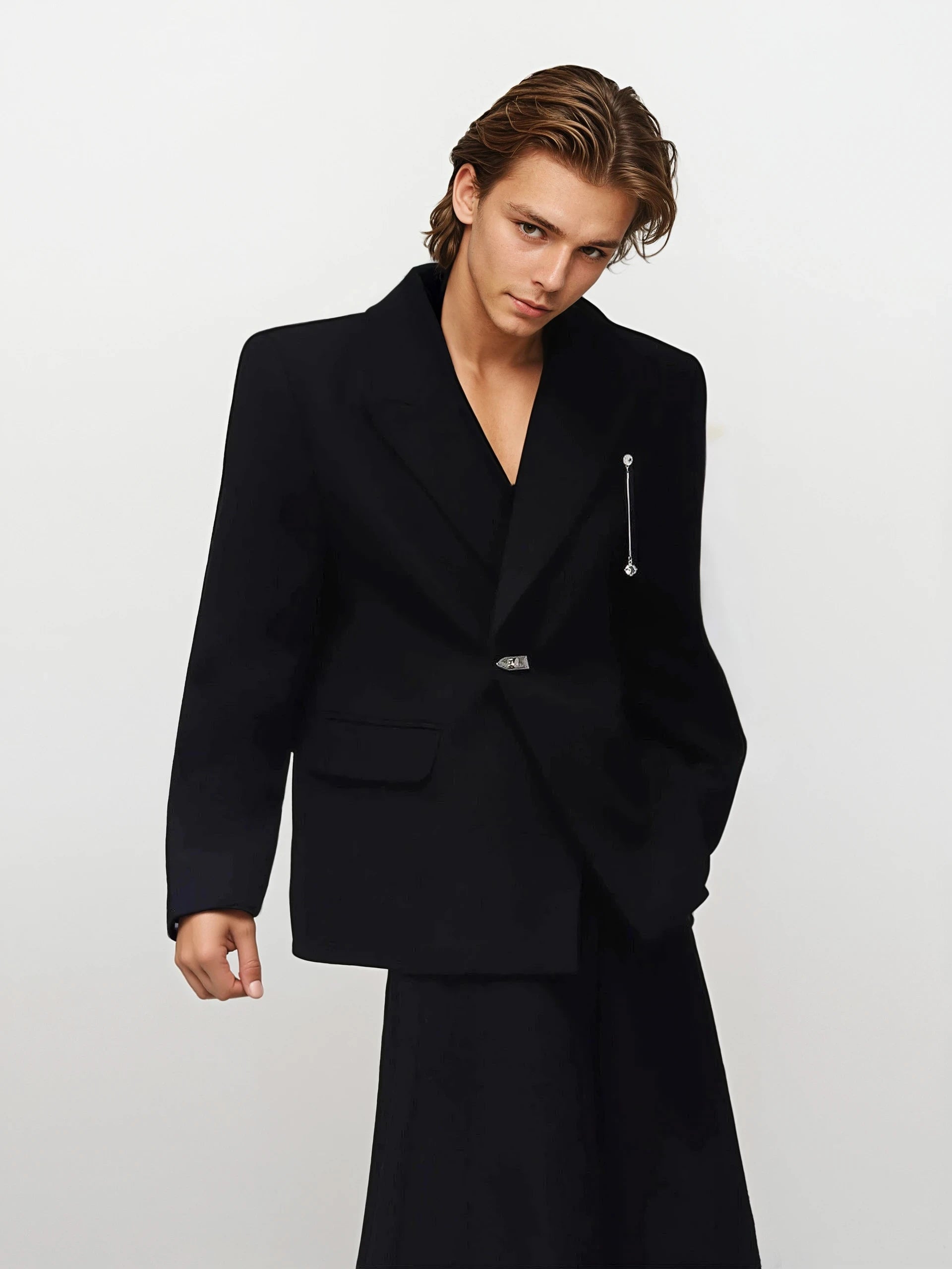 Oversized Peak Lapel Blazer with Metal Clasp Closure and Drop Pendant
