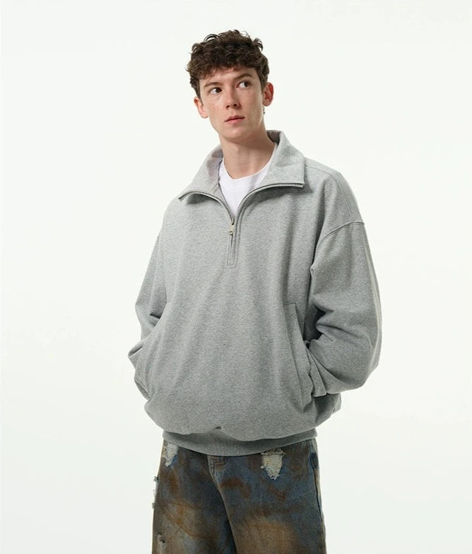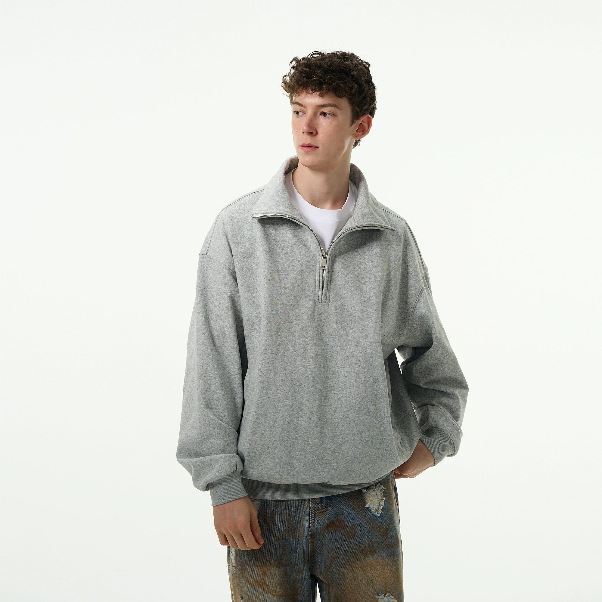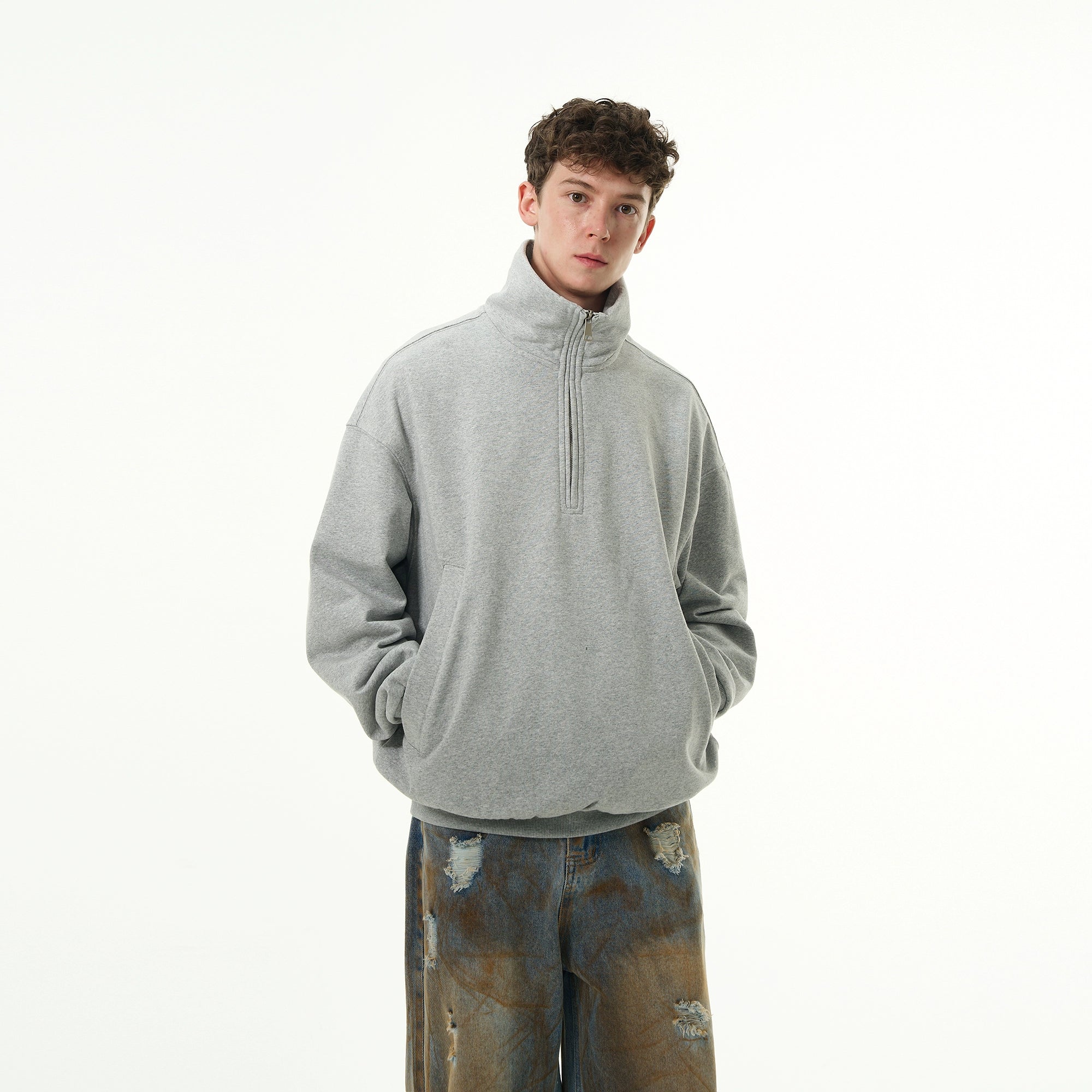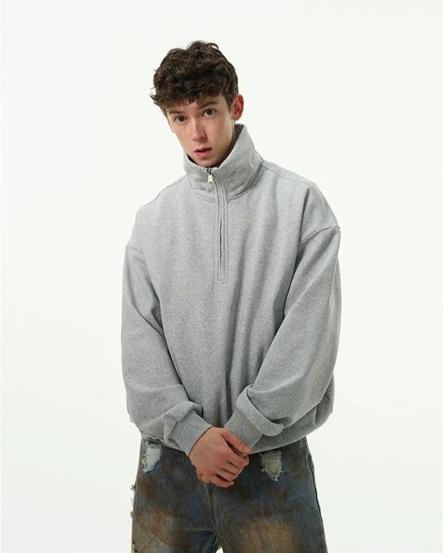 This sweatshirt features a comfortable oversized fit and is crafted from a premium fabric blend, noticeable in its soft texture and durable quality. The solid color and minimalistic design speak to the timeless American style, while the semi-high zipper collar adds a touch of sophistication to the casual silhouette.