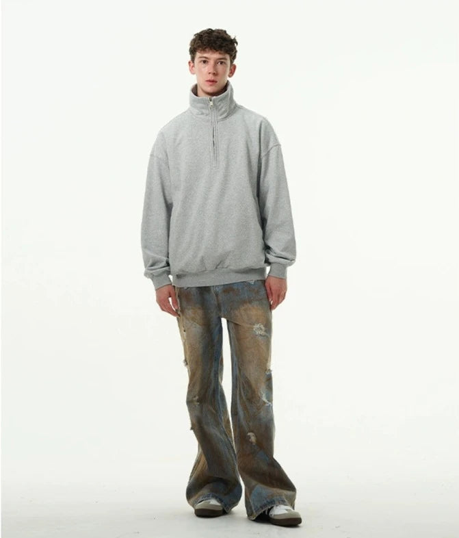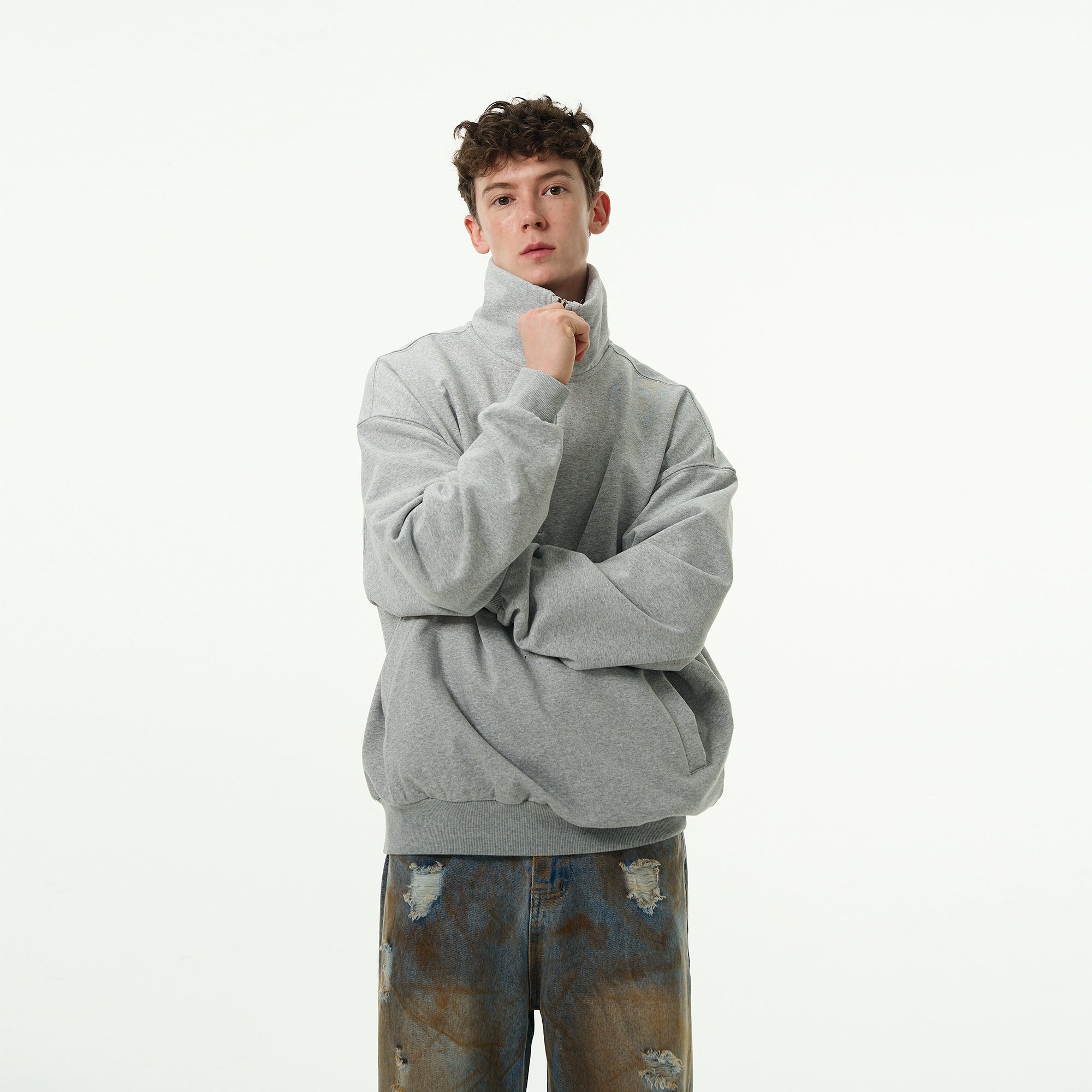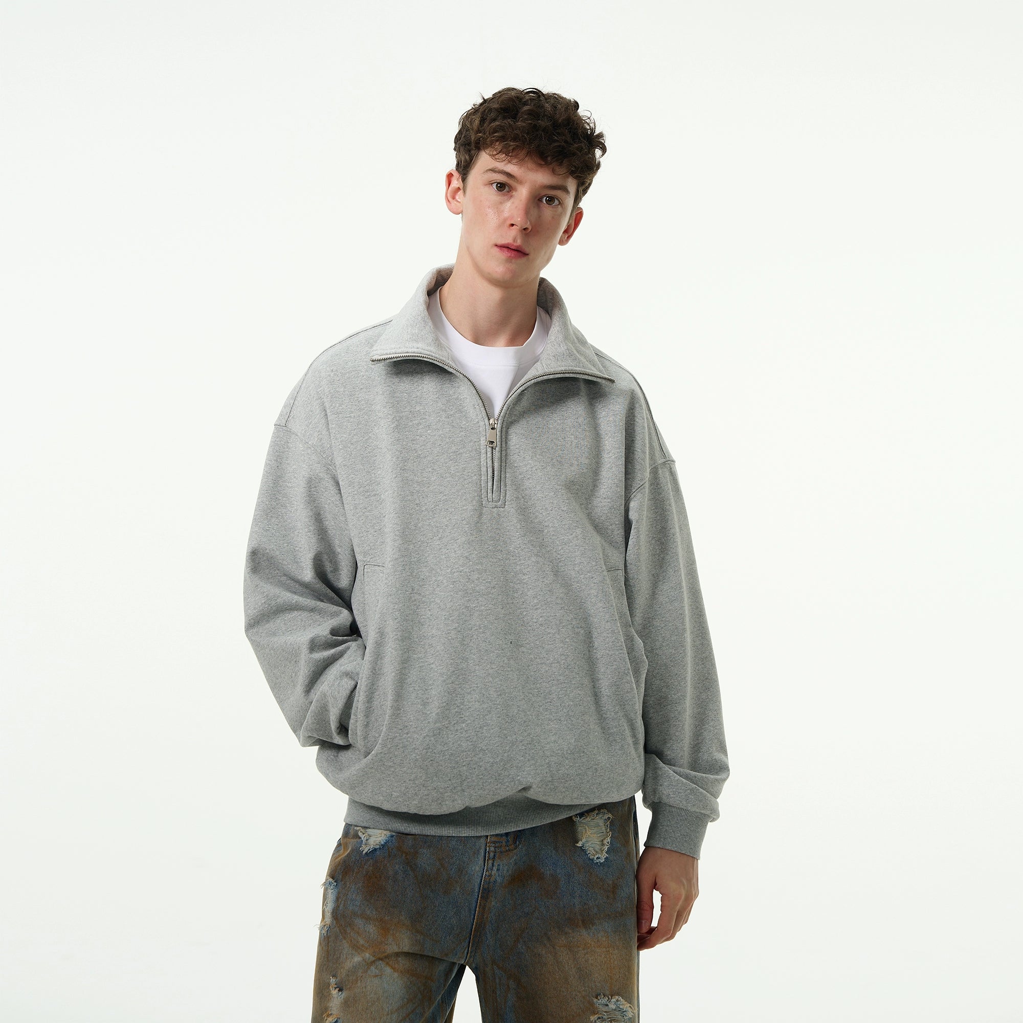 This sweatshirt features a comfortable oversized fit and is crafted from a premium fabric blend, noticeable in its soft texture and durable quality. The solid color and minimalistic design speak to the timeless American style, while the semi-high zipper collar adds a touch of sophistication to the casual silhouette.