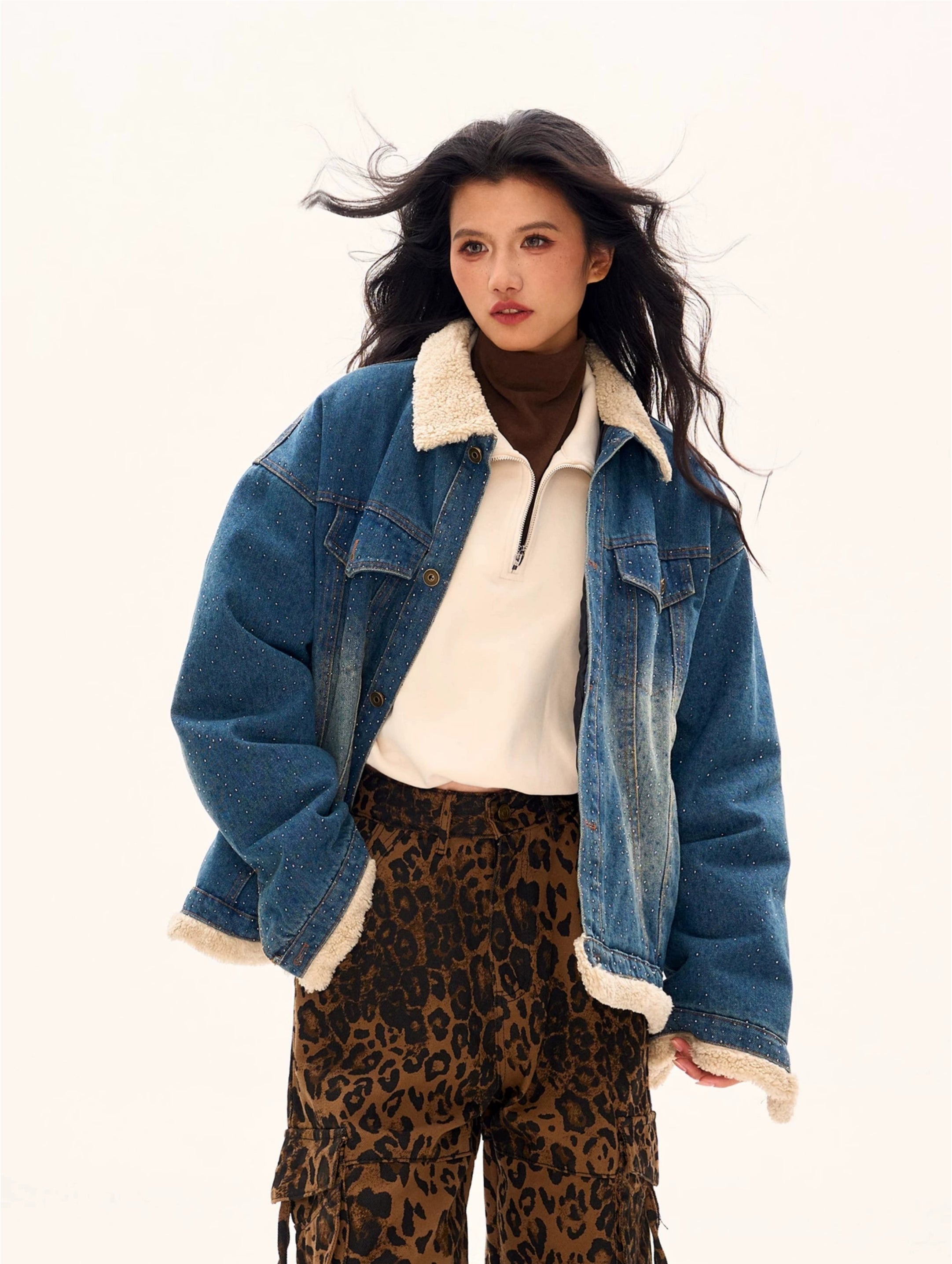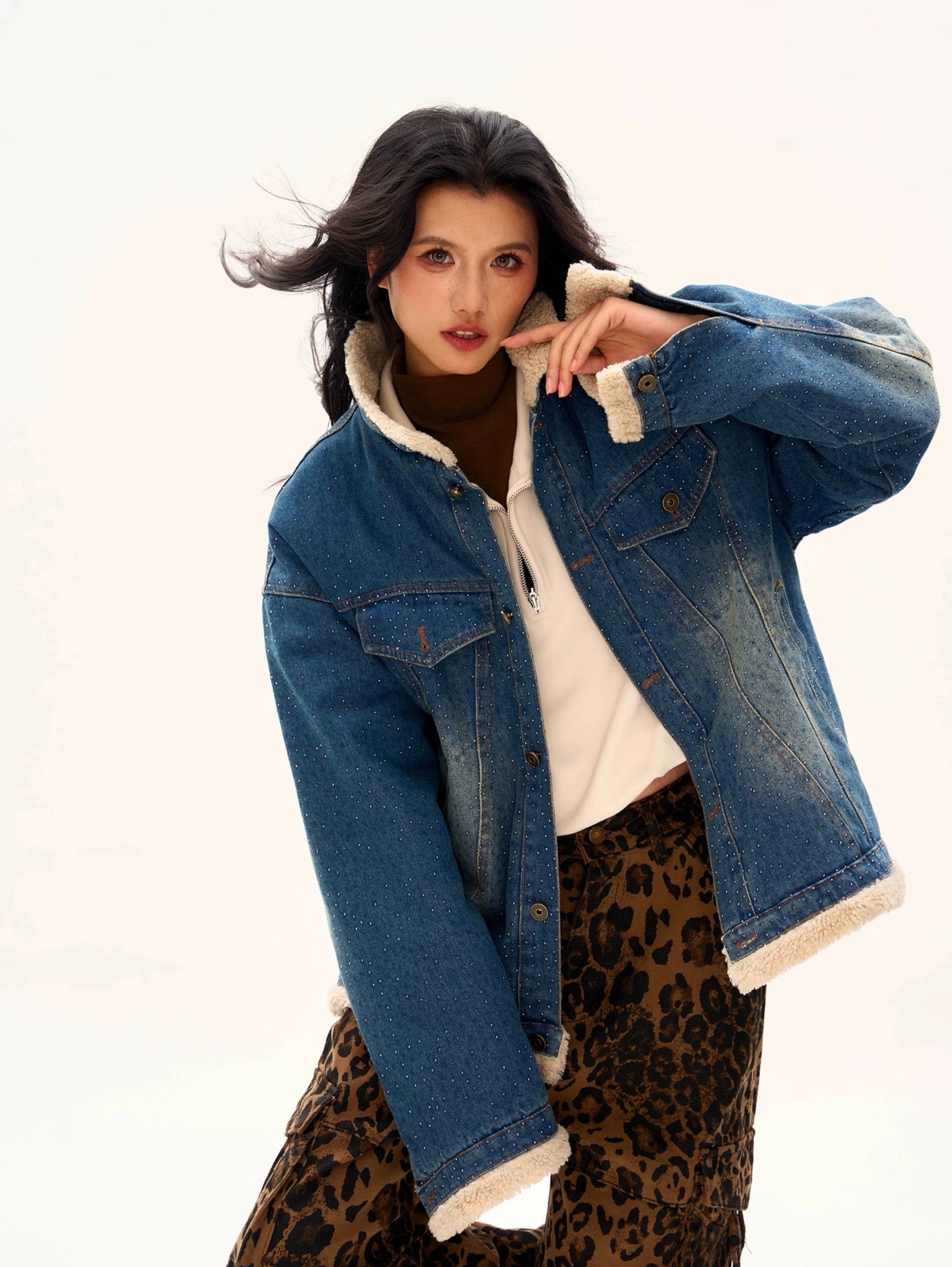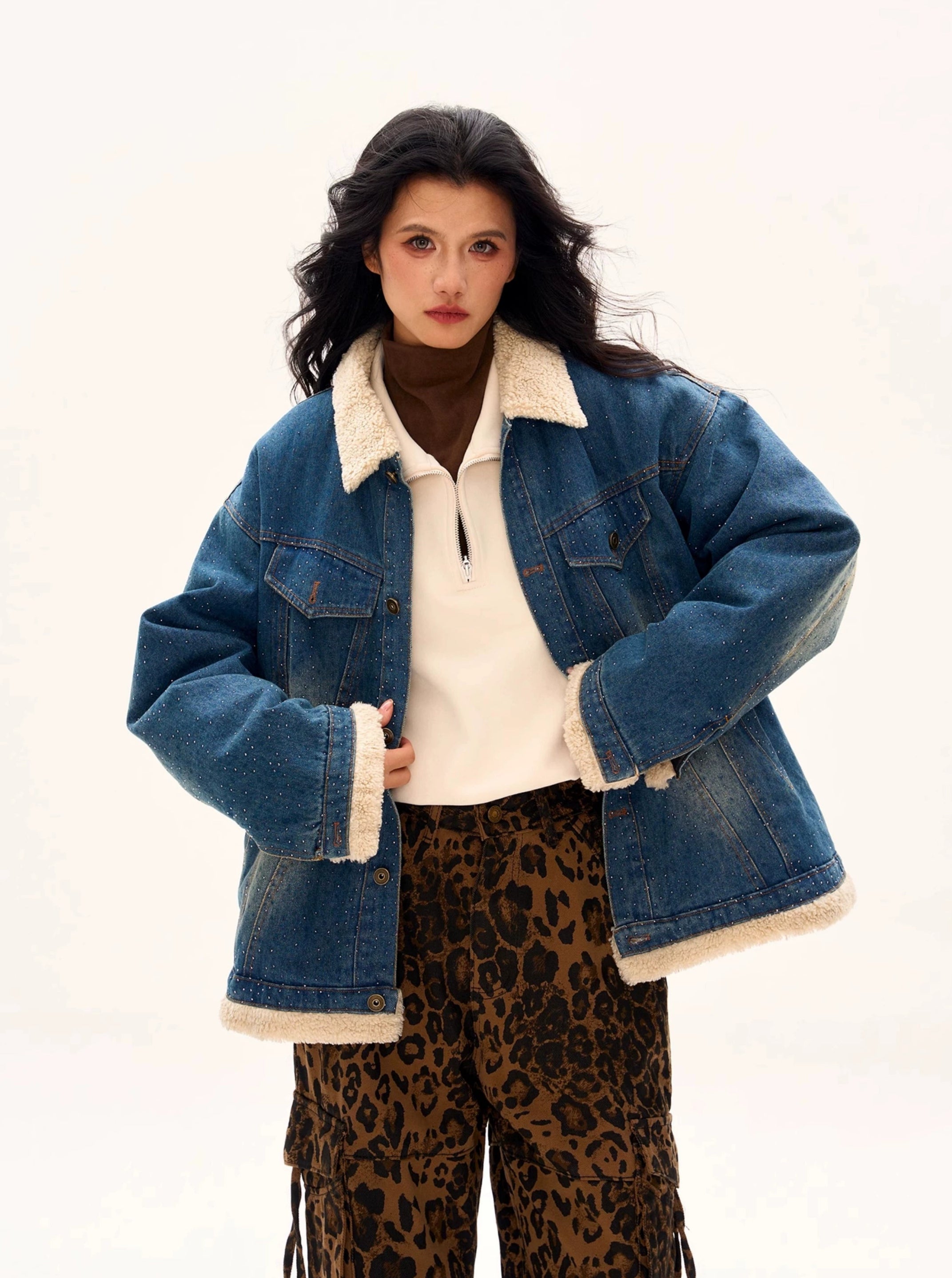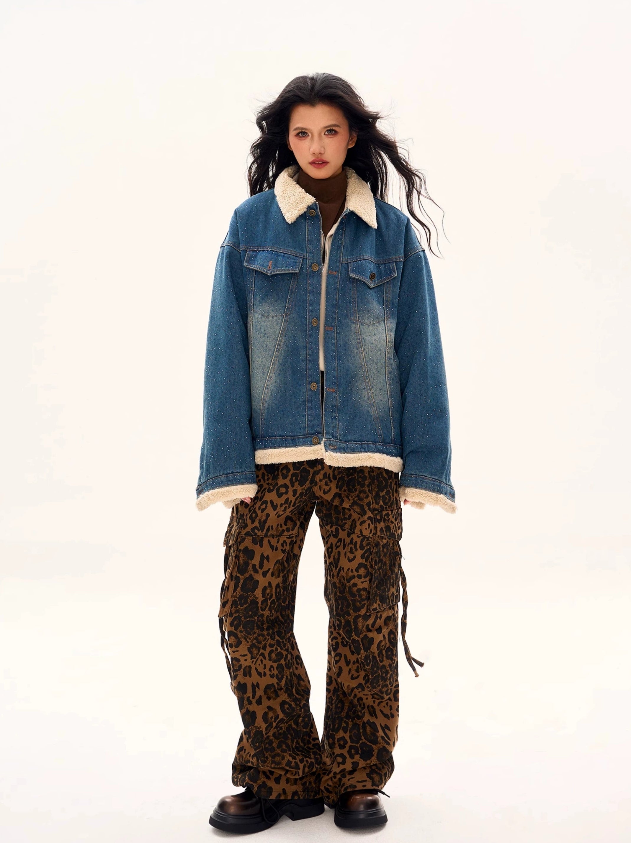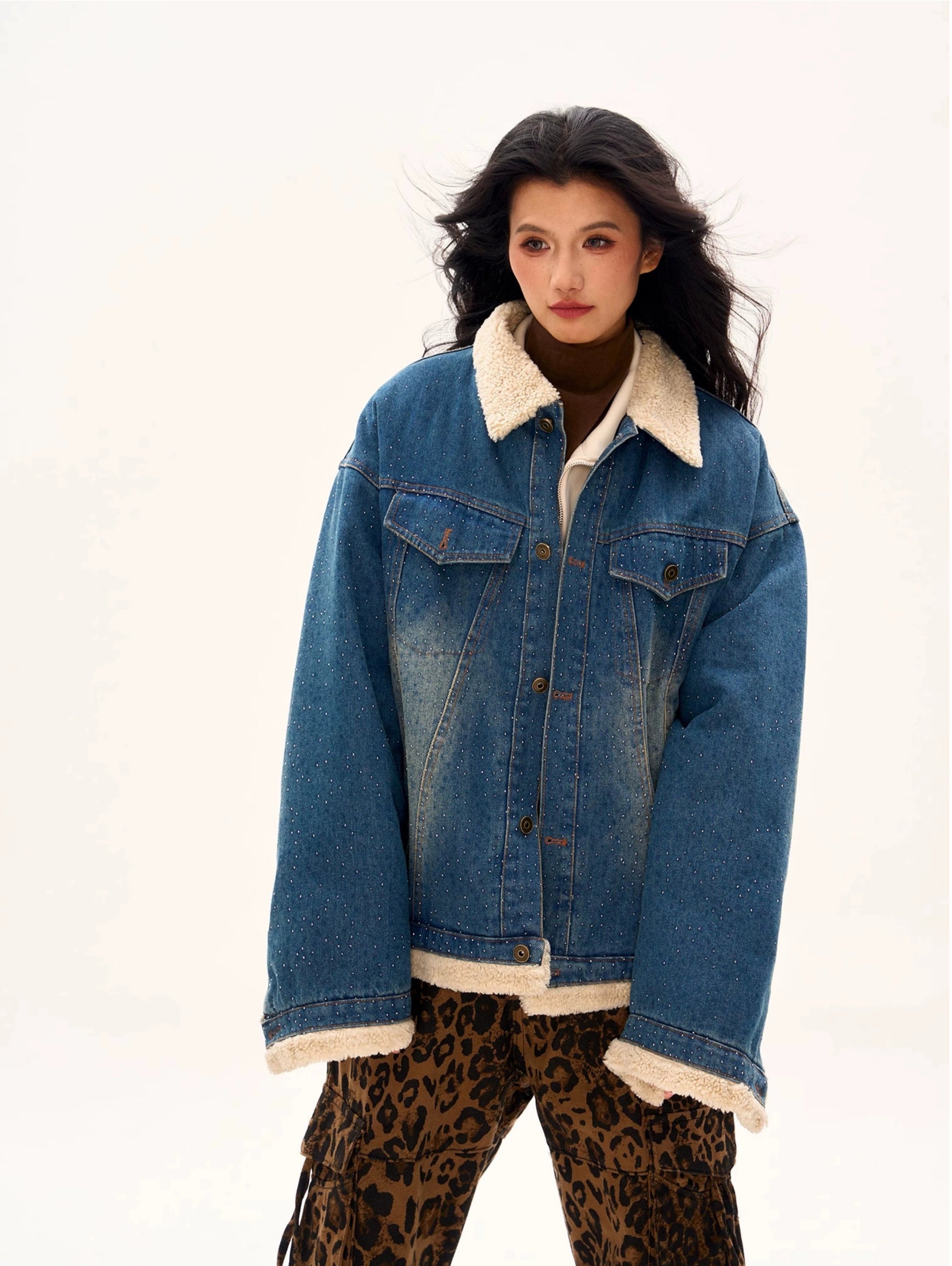 Read full Return PolicyThe Oversized Shearling Trim Faded Denim Jacket with Stud Details is the epitome of effortless cool, blending rugged denim with cozy shearling accents to create a bold statement piece.