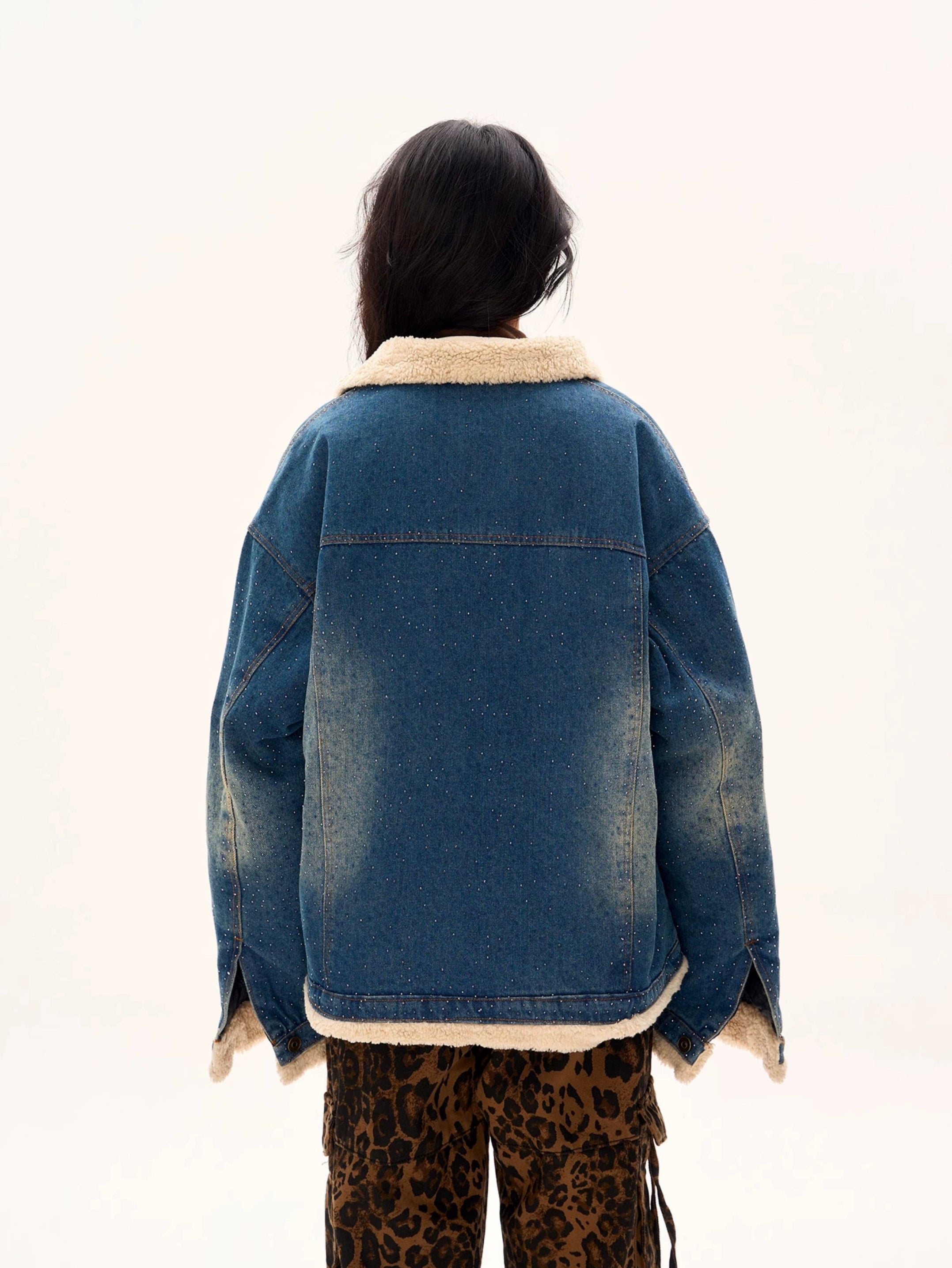 Oversized Shearling Trim Faded Denim Jacket with Stud Details