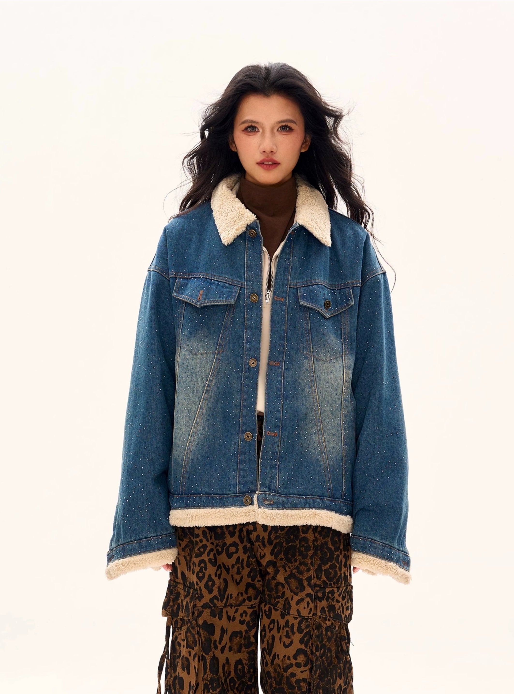 Stud embellishments add a touch of edgy sophistication, making this jacket a staple for those who embrace individuality in their style. Crafted from premium heavyweight denim, this jacket is designed for a relaxed, loose fit, offering both comfort and warmth. The faded wash creates a lived-in feel, while the shearling trim along the collar and cuffs provides texture and a snug finish. Functional, single-breasted button closure ensures easy layering, making it versatile enough to pair with anything from dresses to sweatpants.