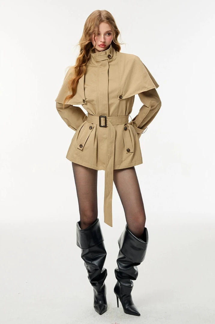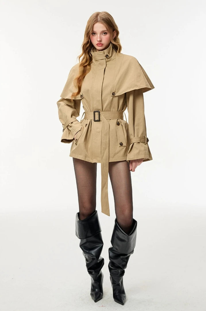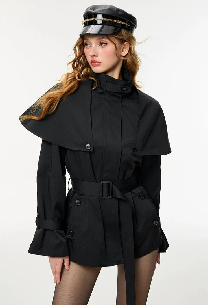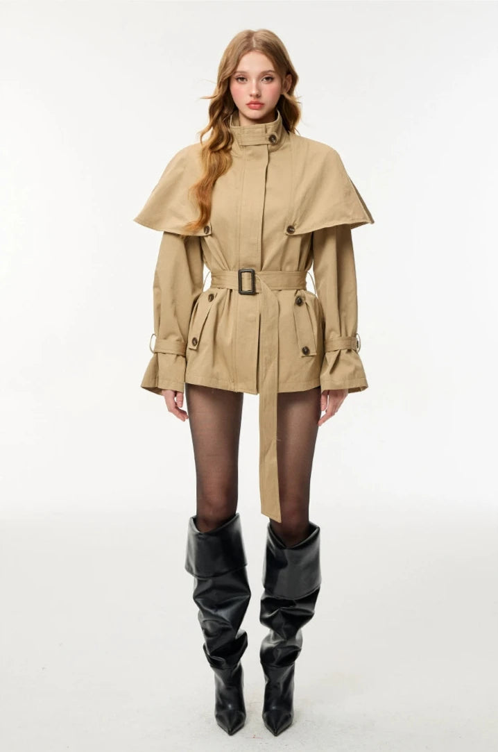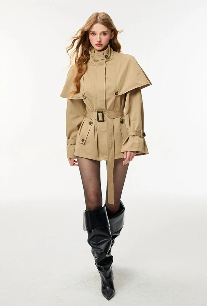 Oversized Stand Collar Trench Coat with Cape and Belt