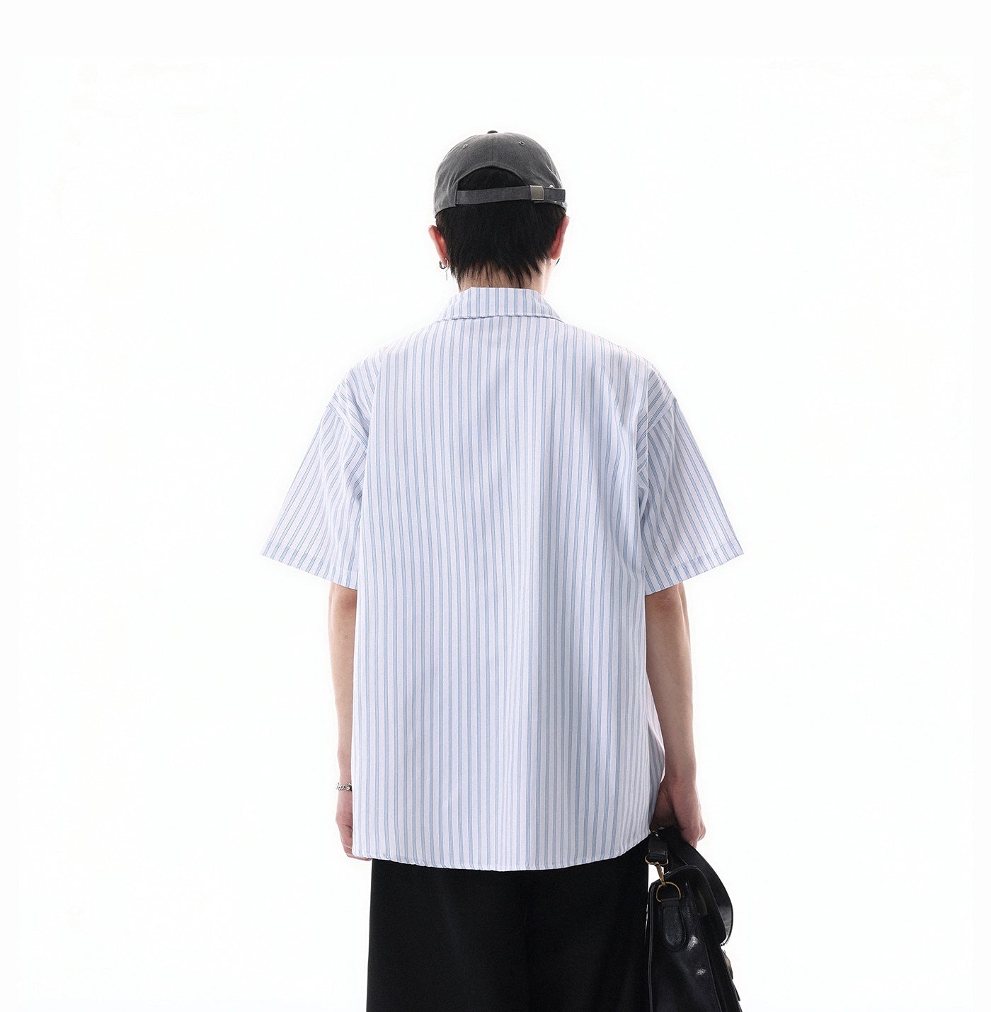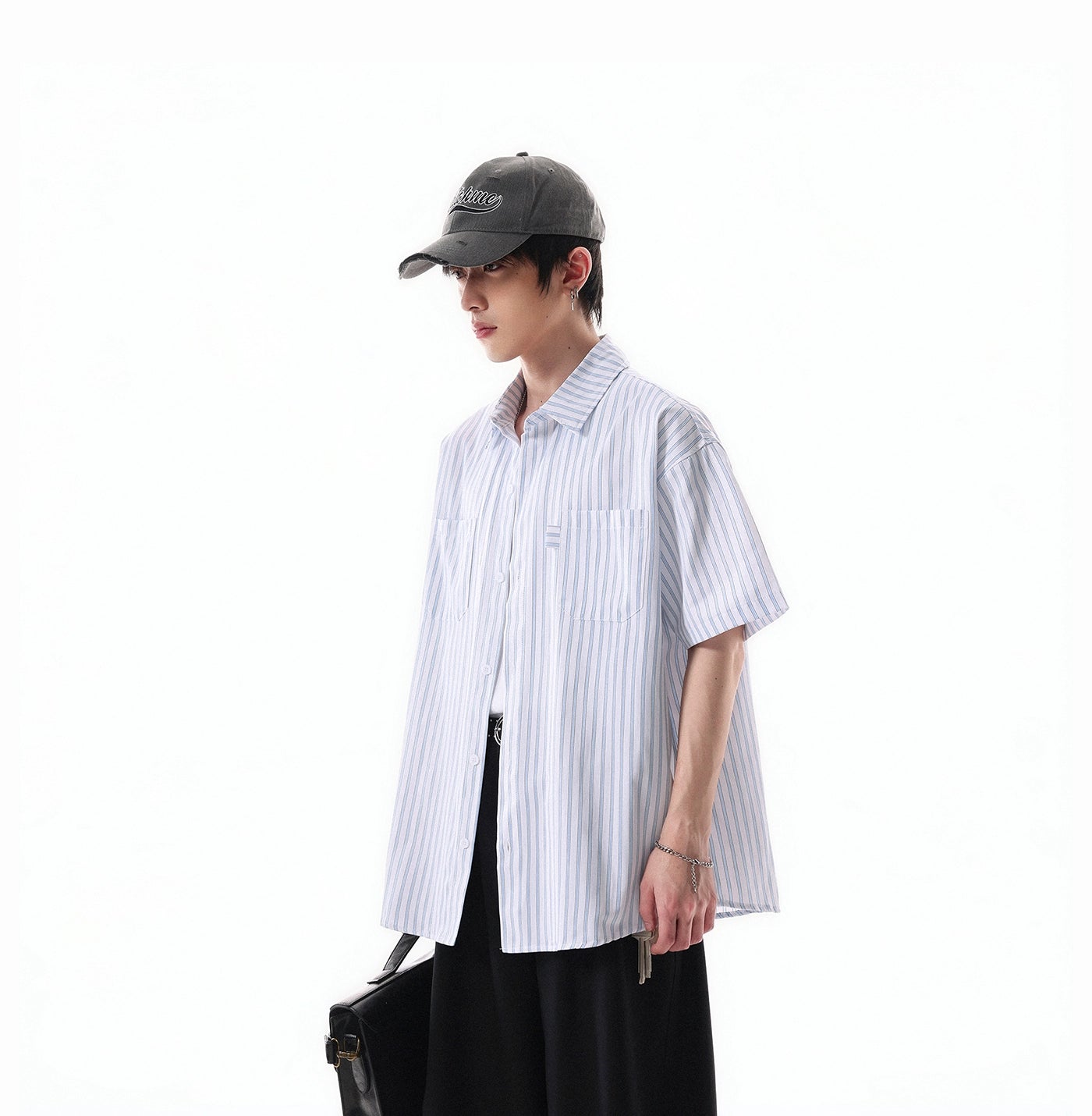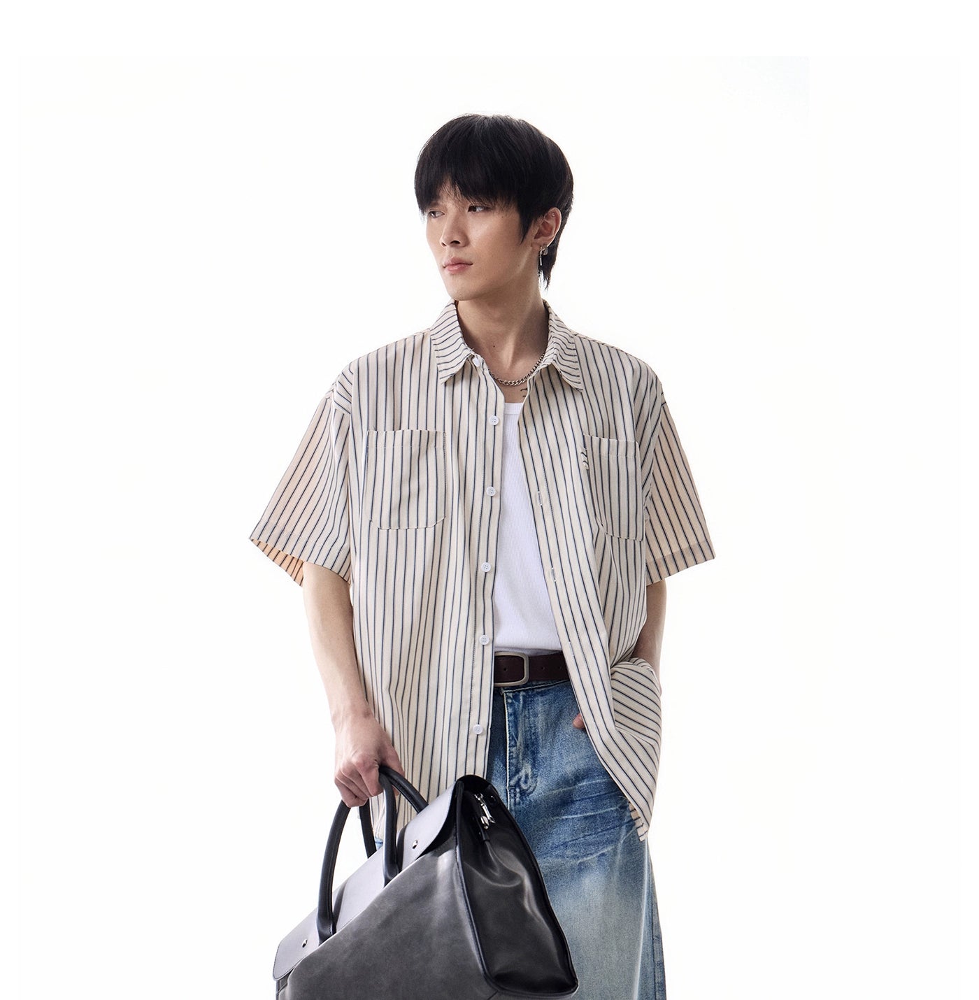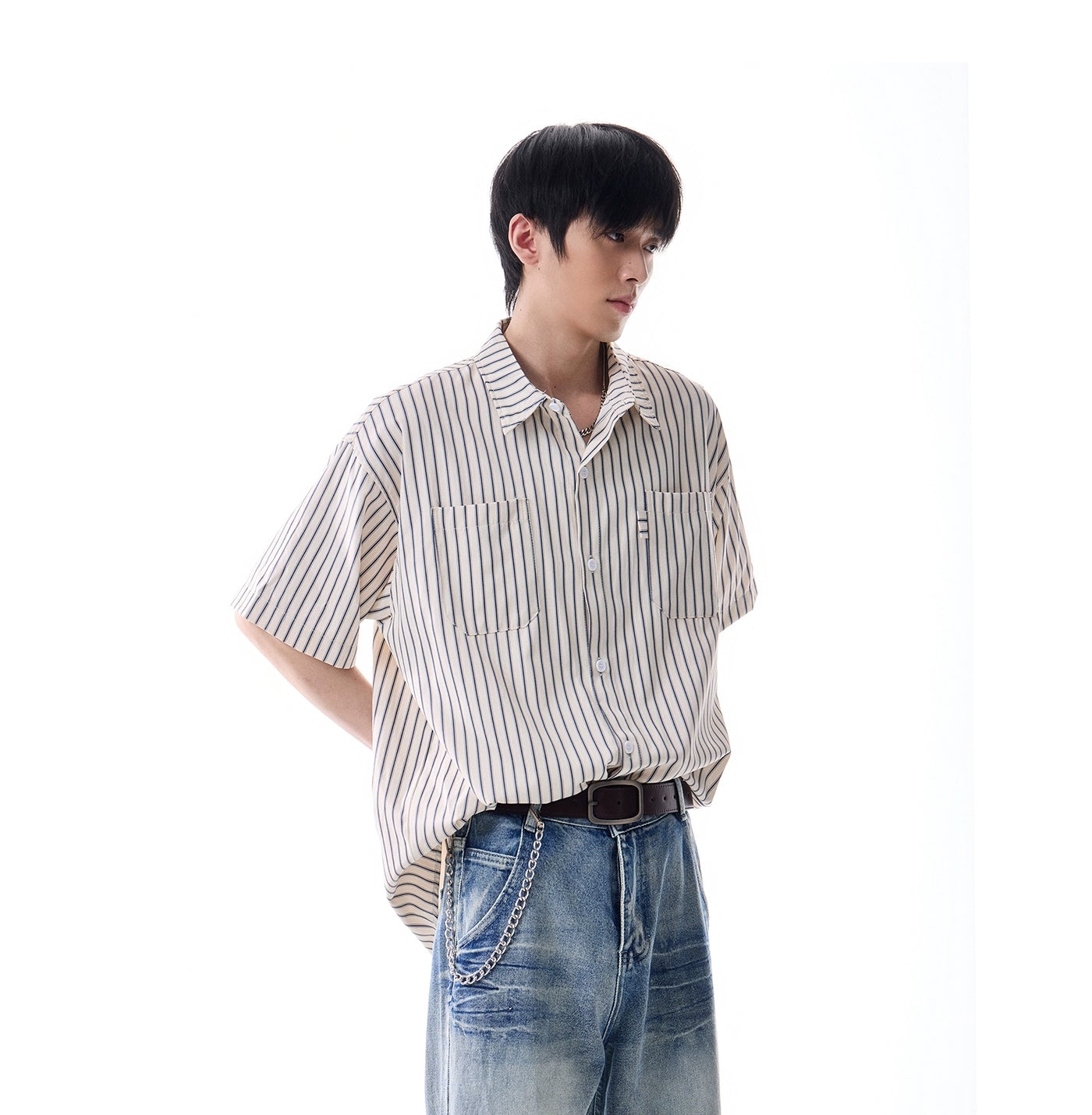 Made from a breathable cotton blend, this shirt features vertical stripes and dual chest pockets for a subtle nod to classic workwear. Its loose fit and dropped shoulders create a relaxed silhouette that doesn’t feel try-hard, while the lapel collar and button-down front add structure and polish.