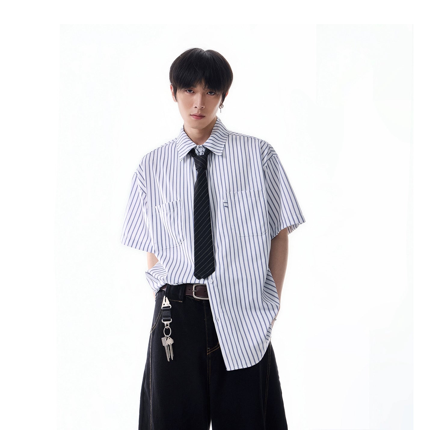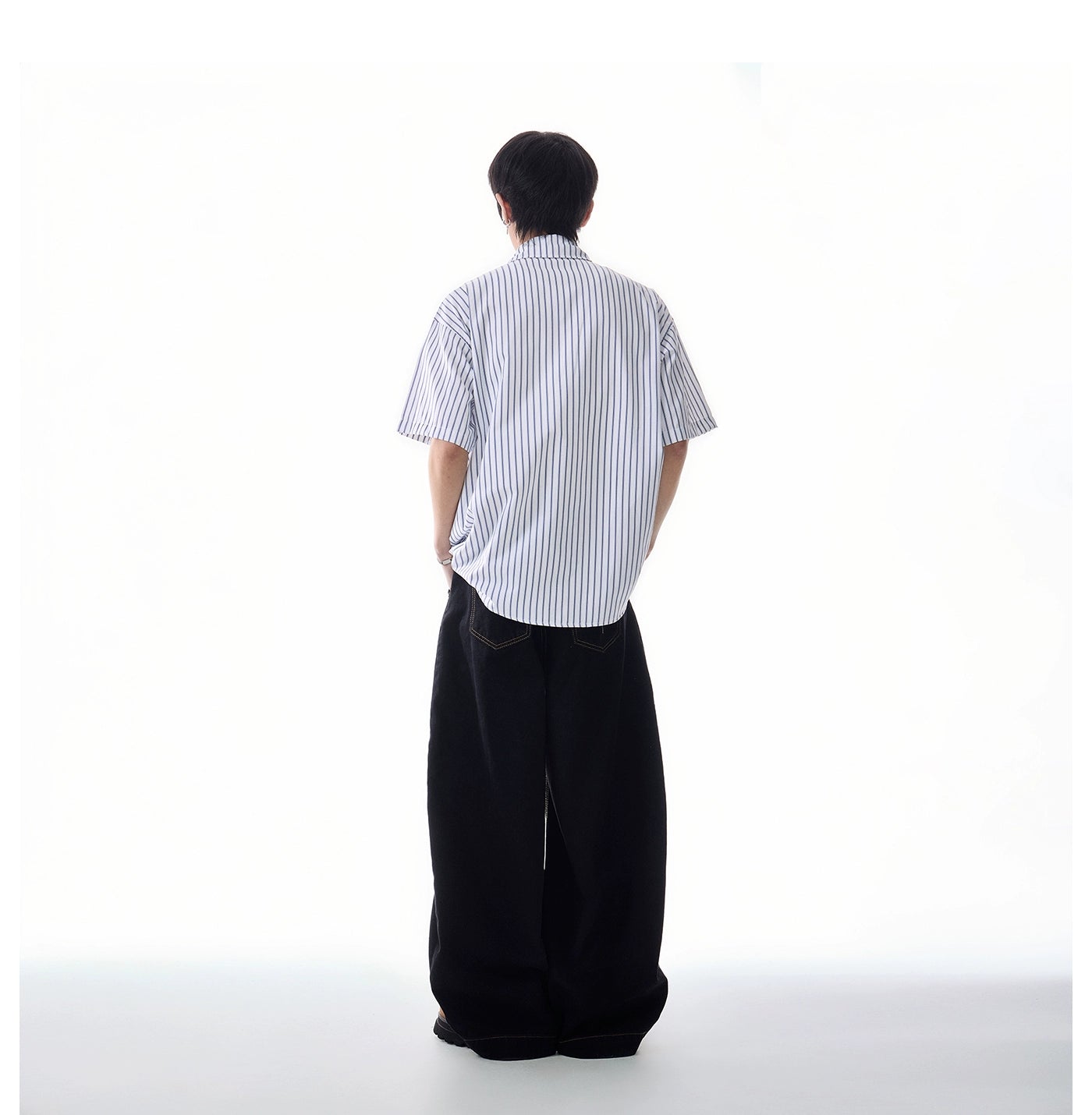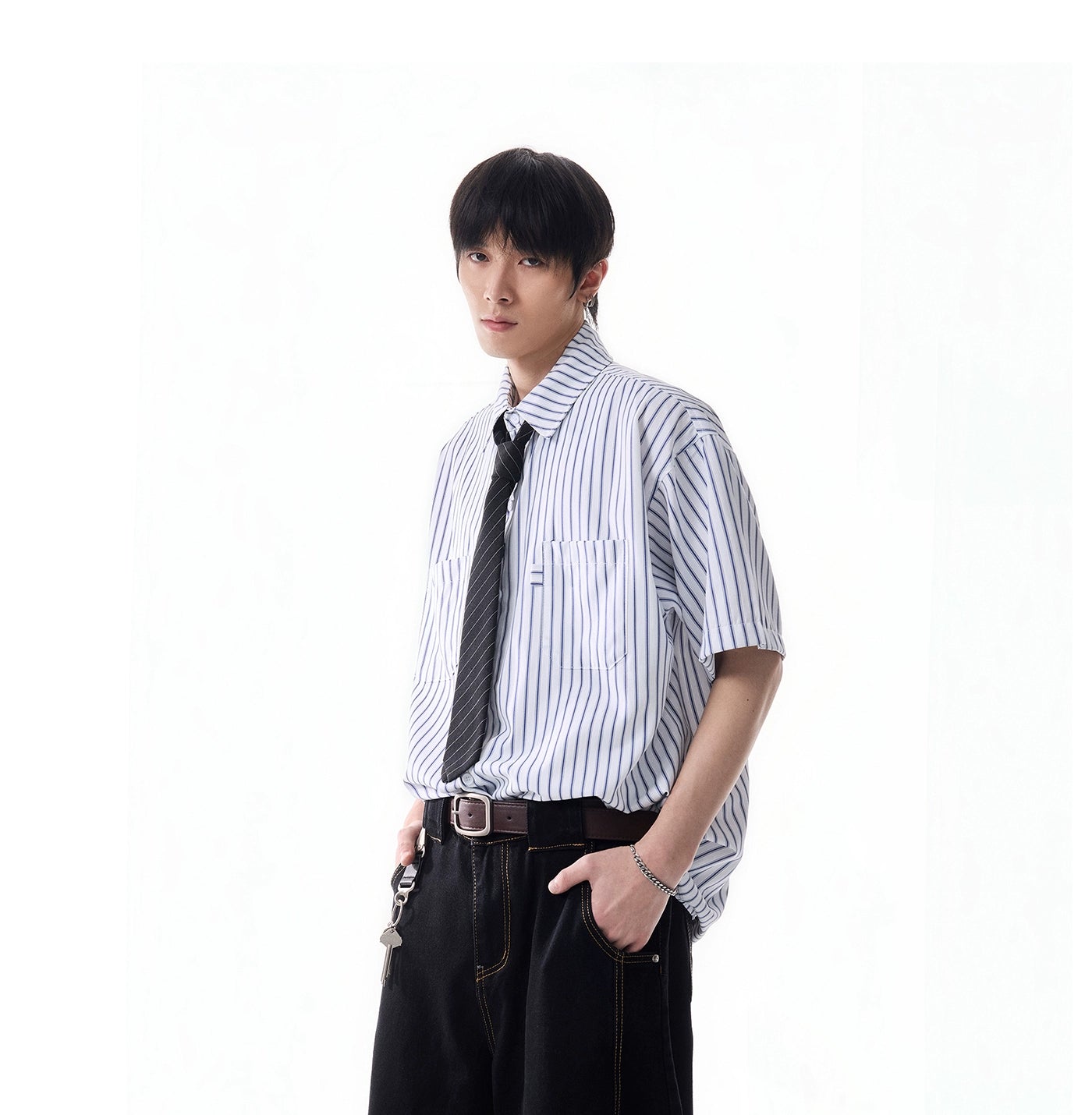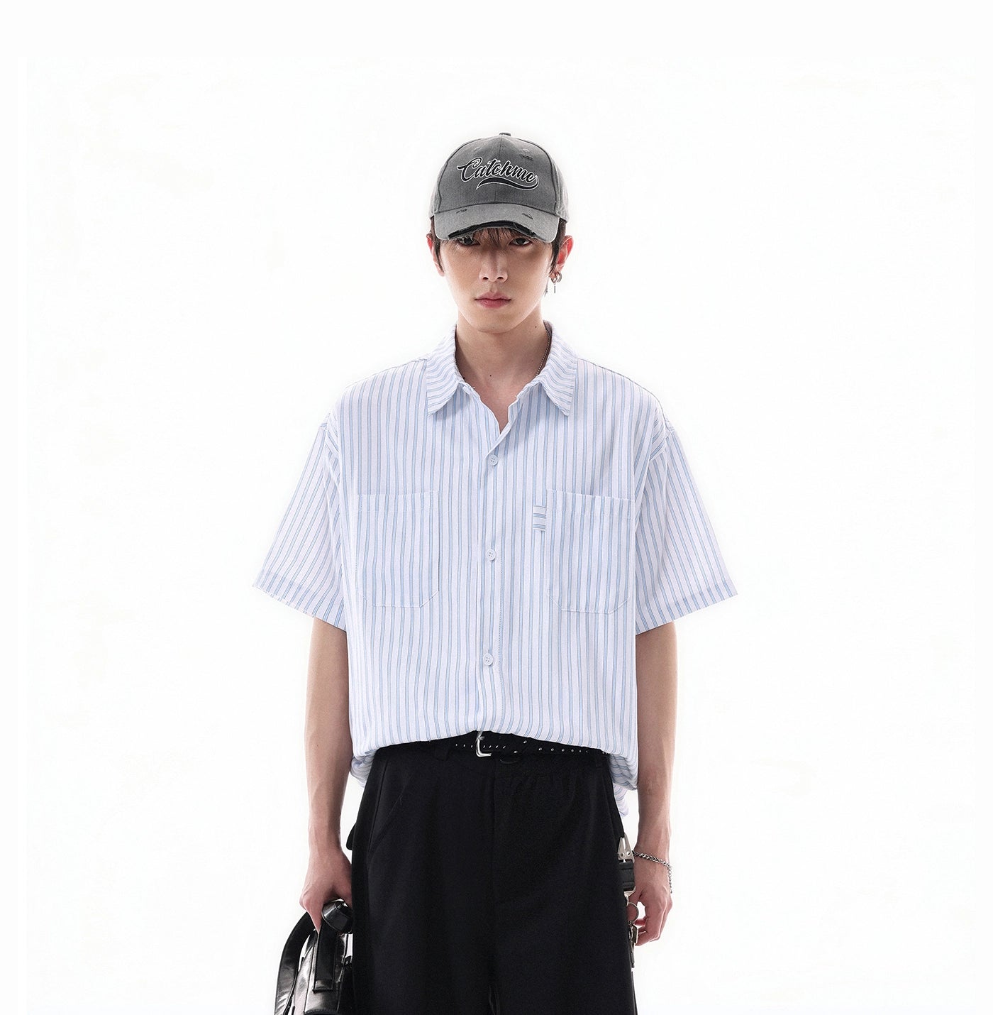 Made from a breathable cotton blend, this shirt features vertical stripes and dual chest pockets for a subtle nod to classic workwear. Its loose fit and dropped shoulders create a relaxed silhouette that doesn’t feel try-hard, while the lapel collar and button-down front add structure and polish.