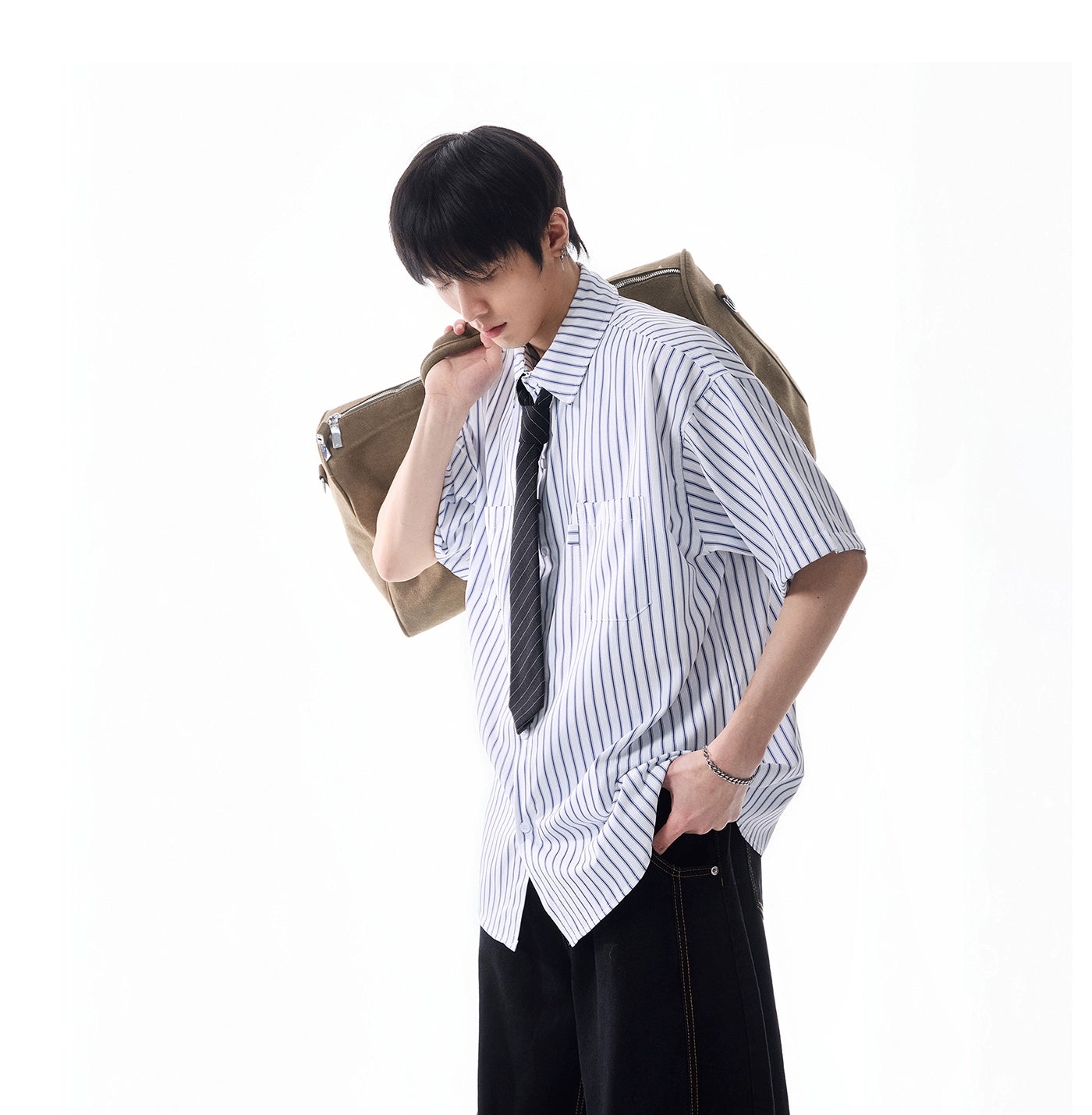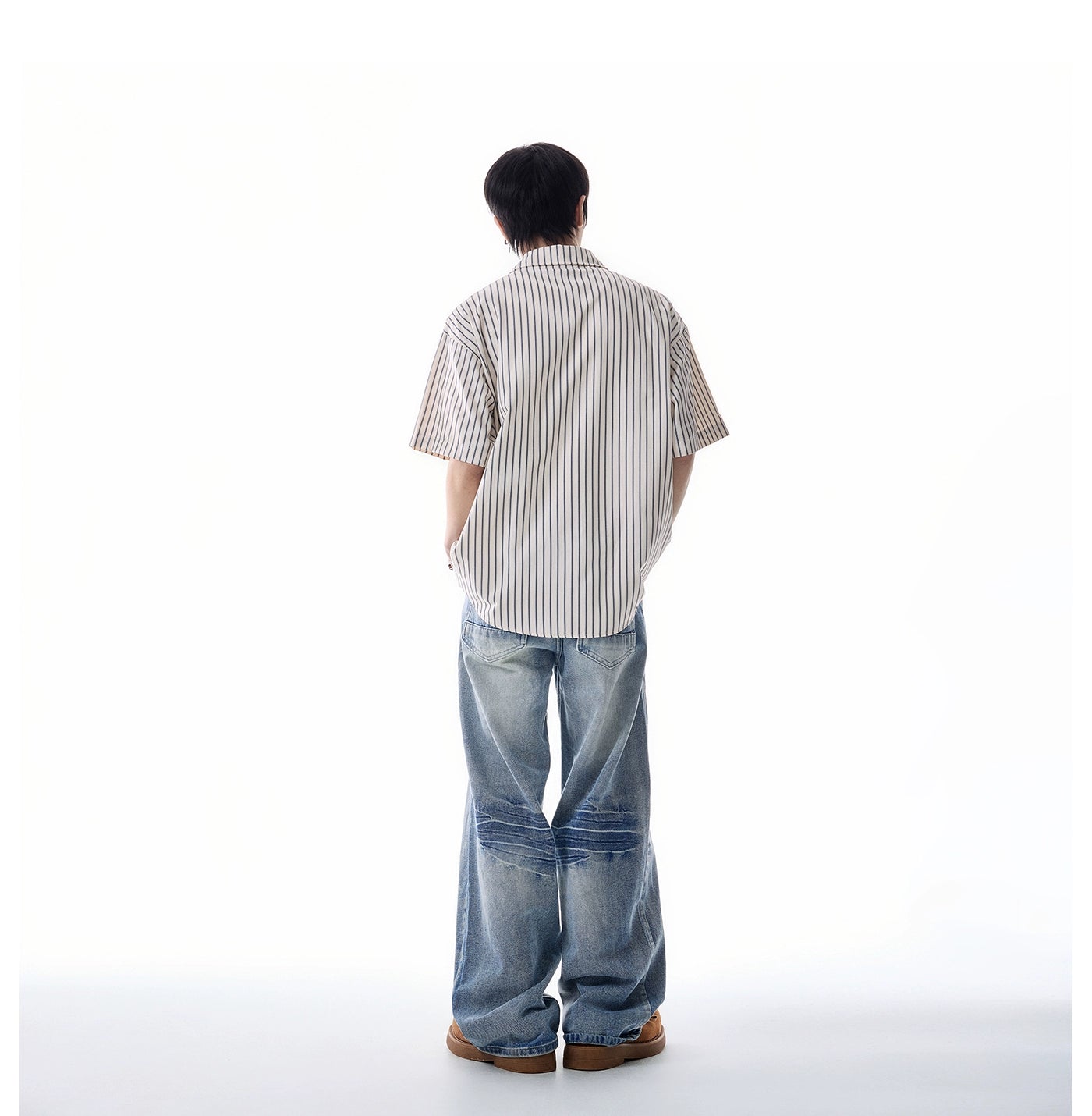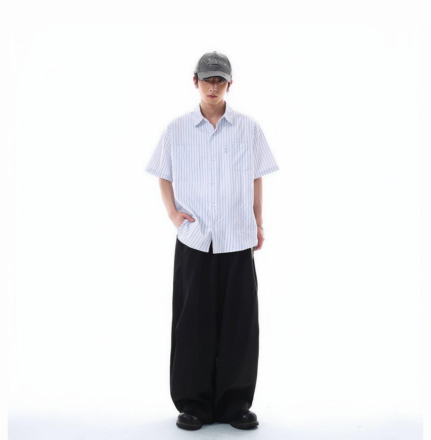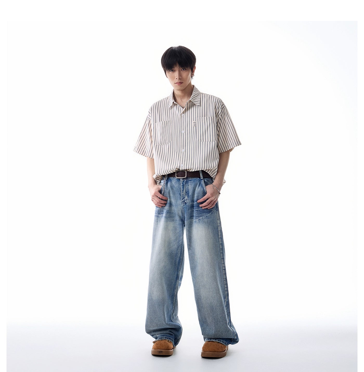 Made from a breathable cotton blend, this shirt features vertical stripes and dual chest pockets for a subtle nod to classic workwear. Its loose fit and dropped shoulders create a relaxed silhouette that doesn’t feel try-hard, while the lapel collar and button-down front add structure and polish.