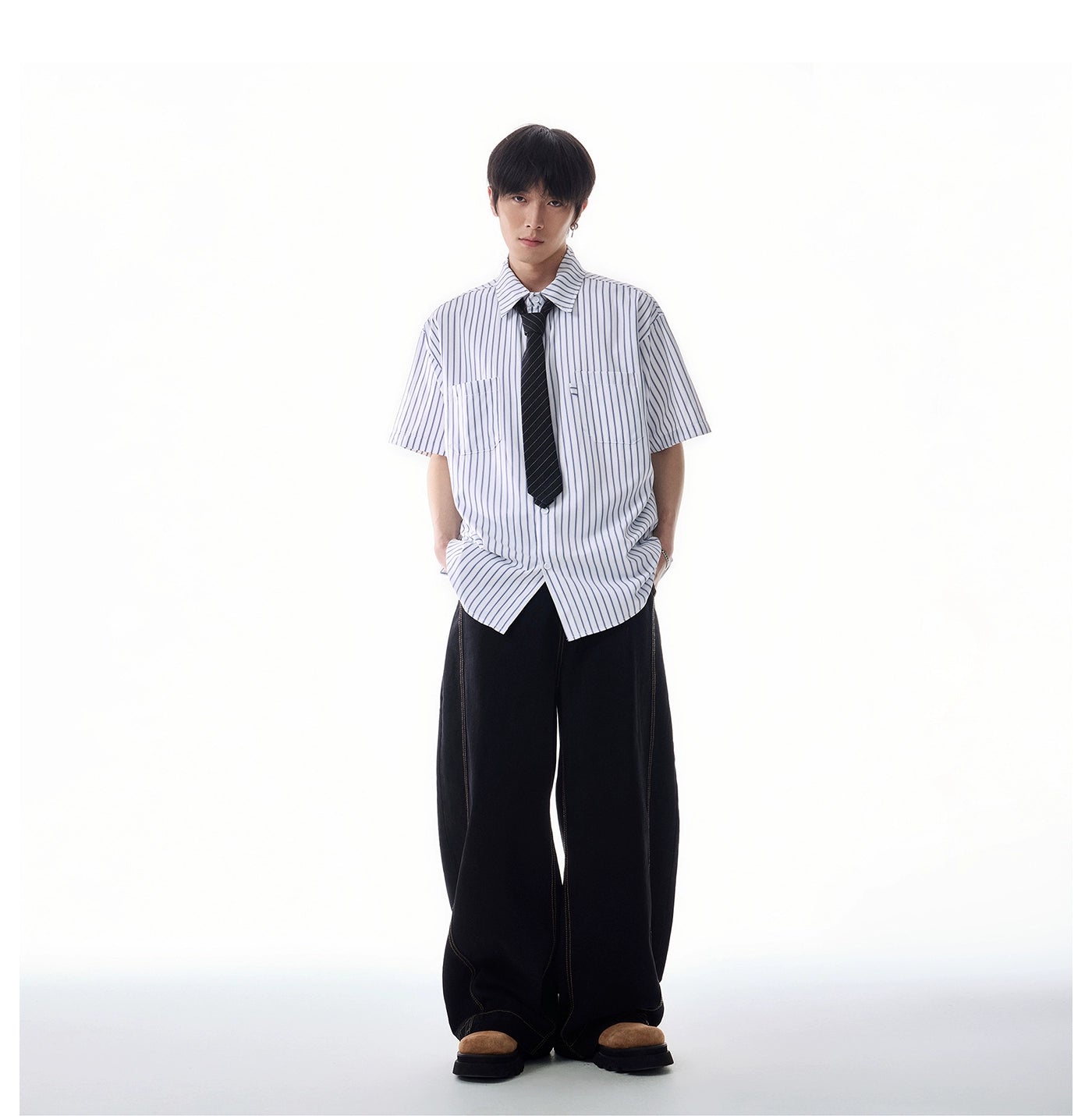 Oversized Stripe Short Sleeve Button Shirt with Chest Pockets