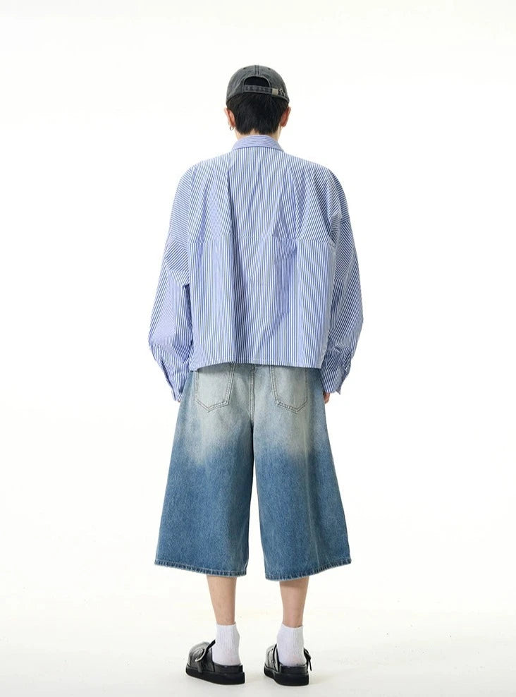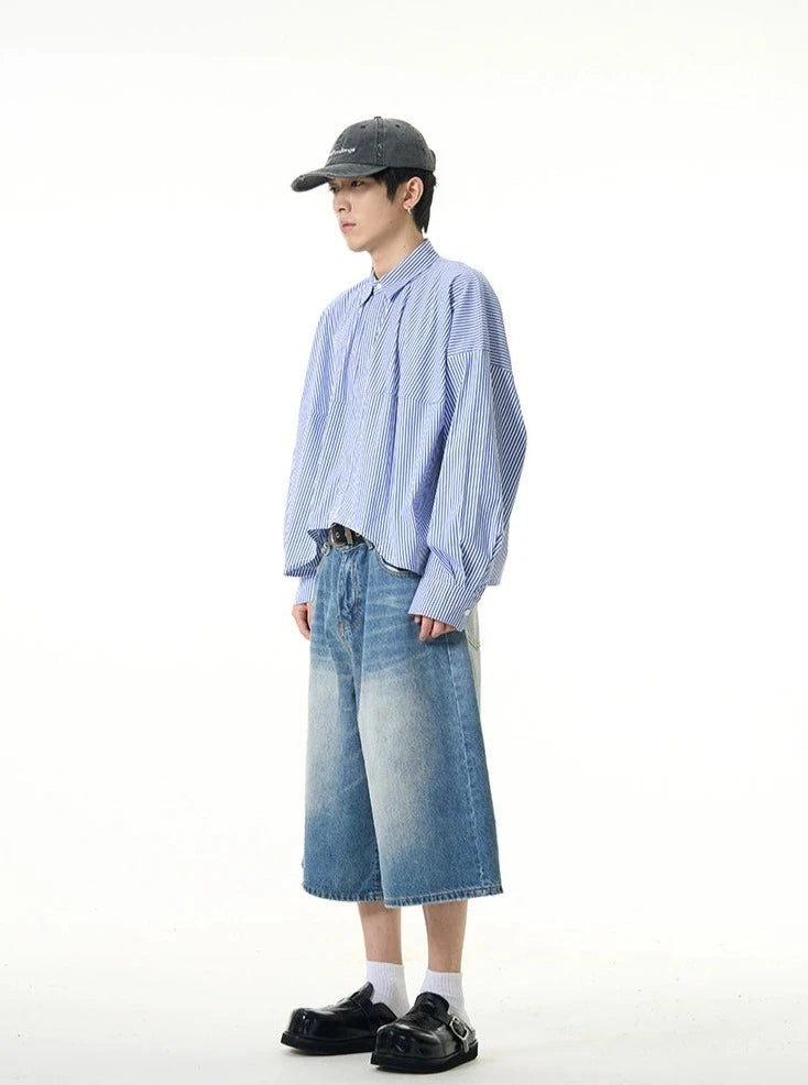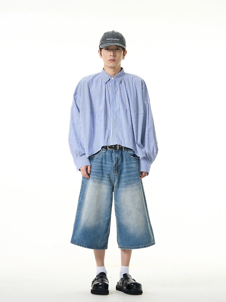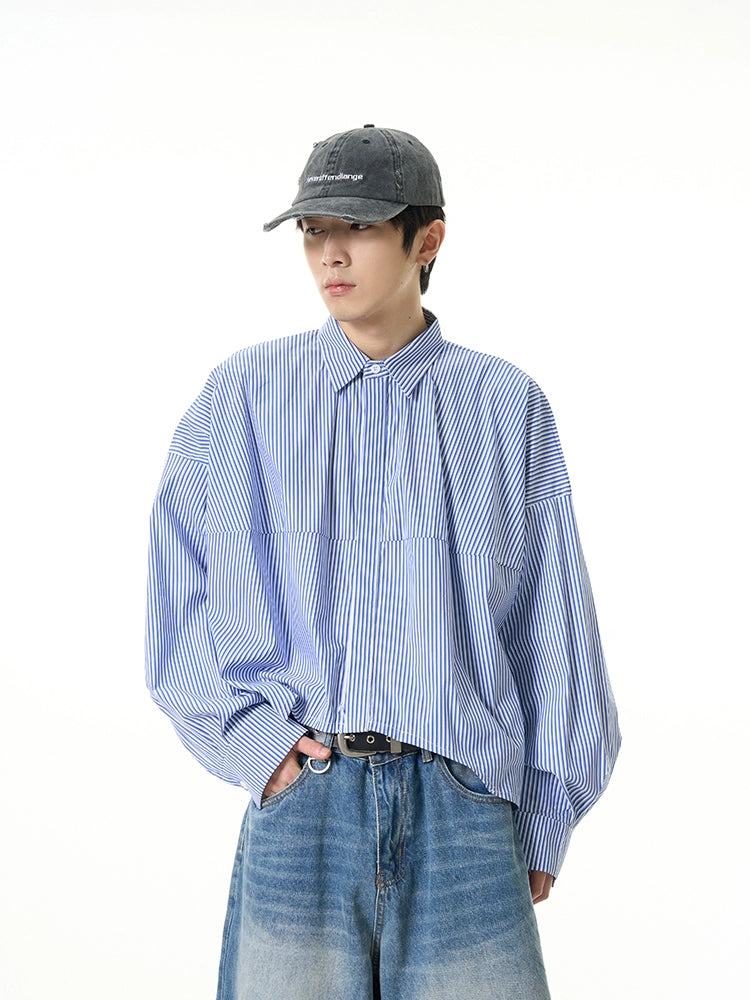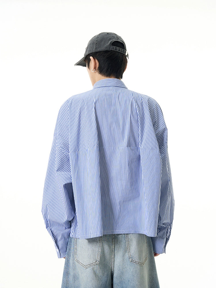 Oversized Striped Drop-Shoulder Cropped Button-Up Shirt