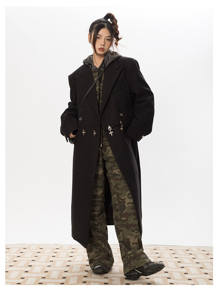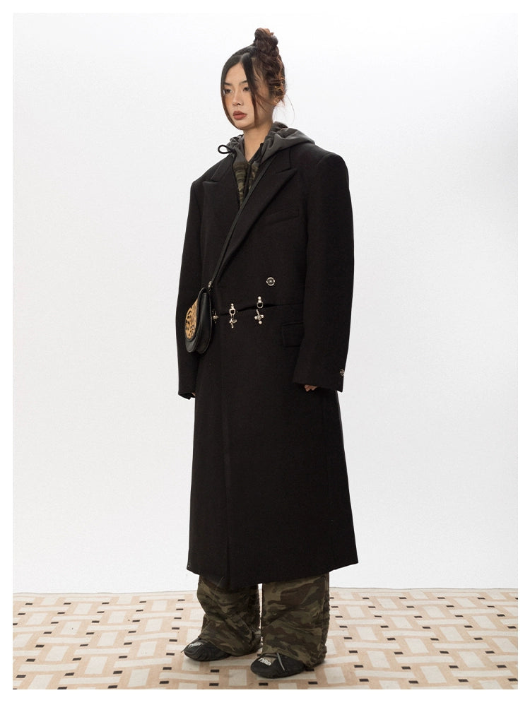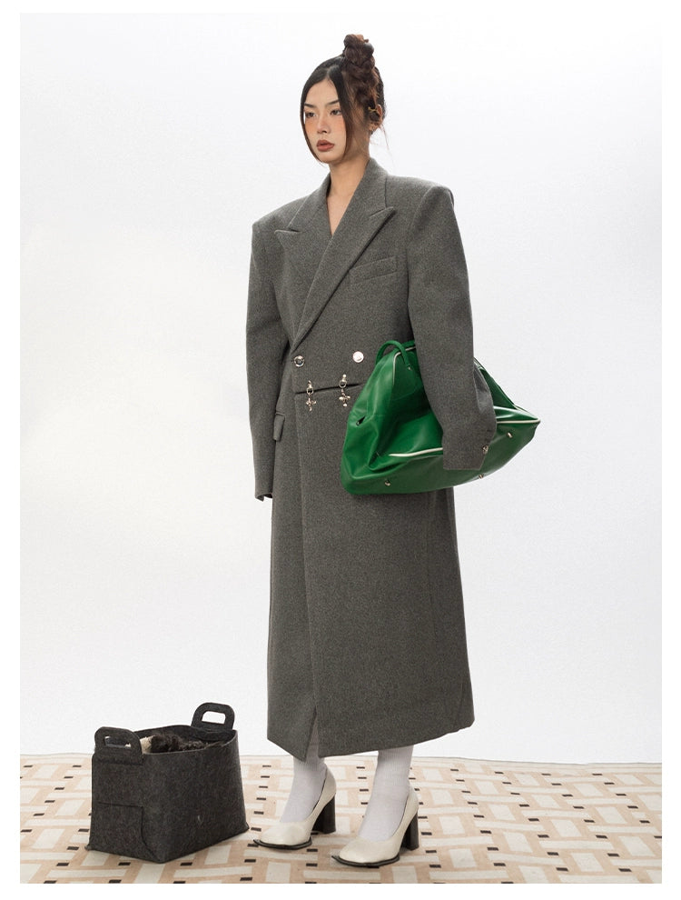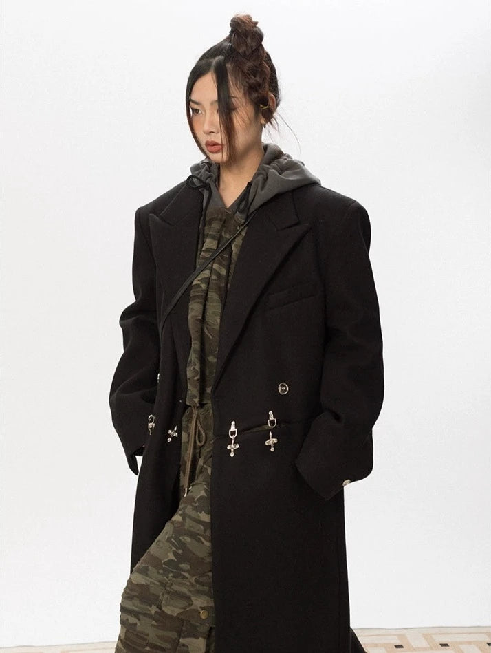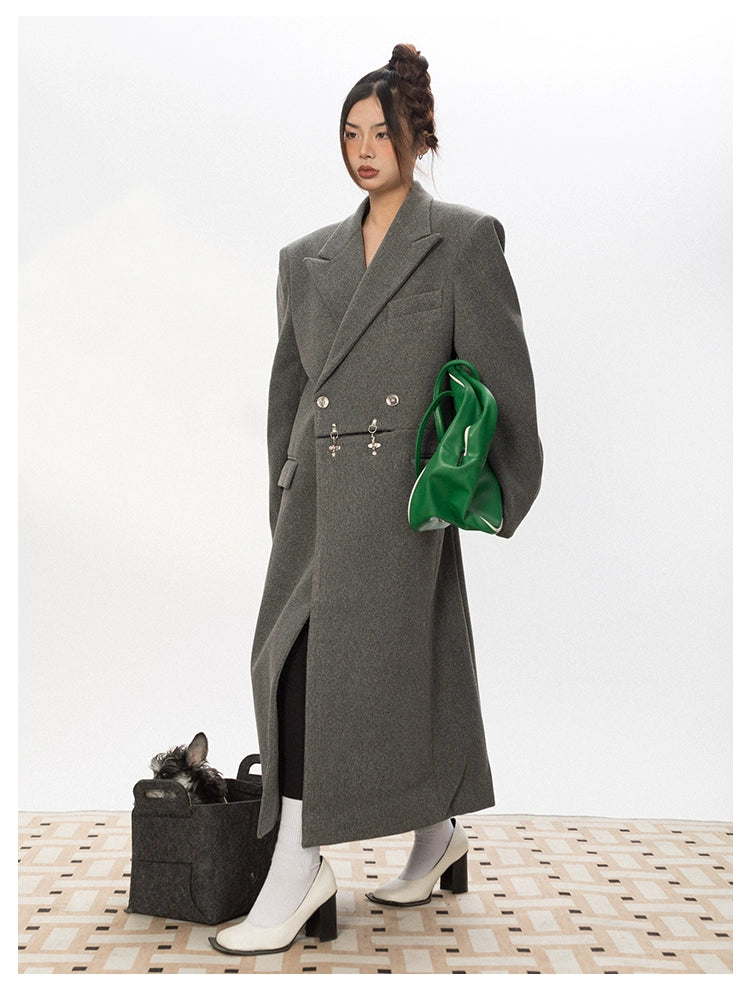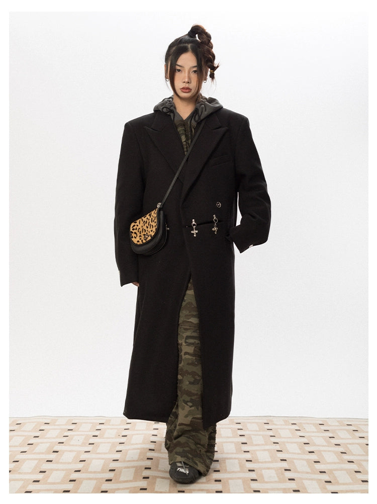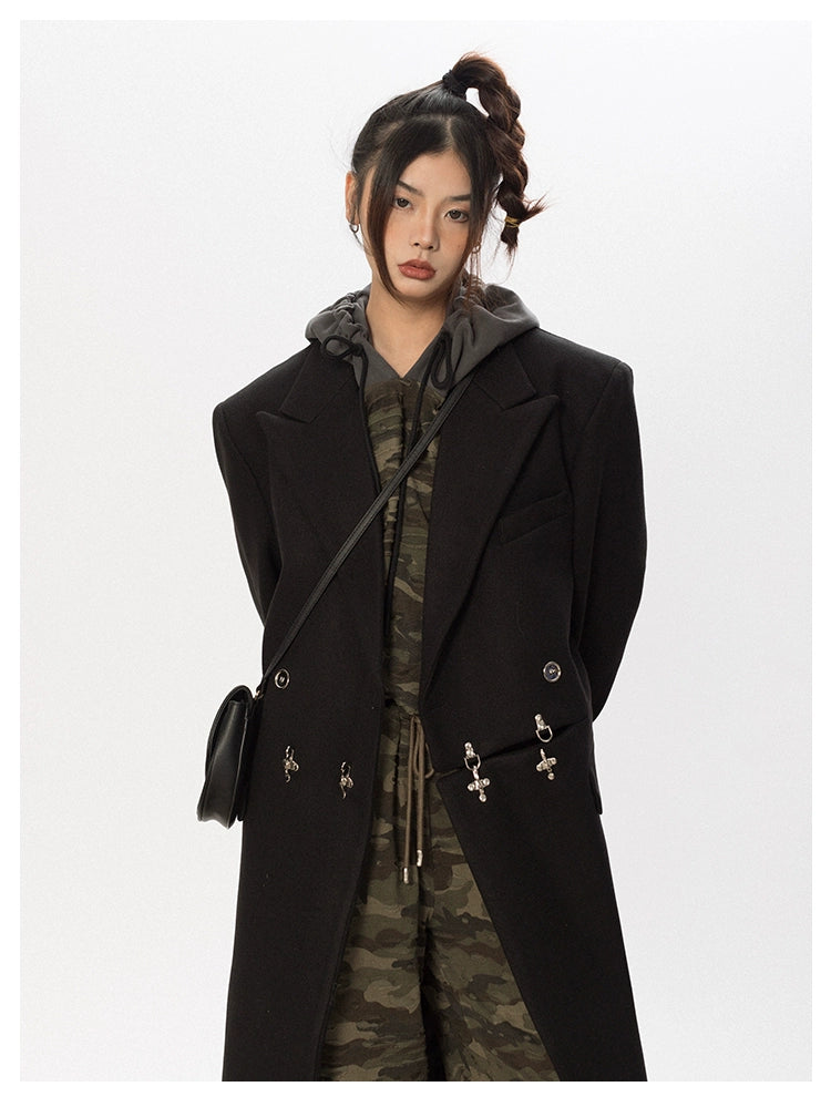 Oversized Wool Long Coat with Charm Details
