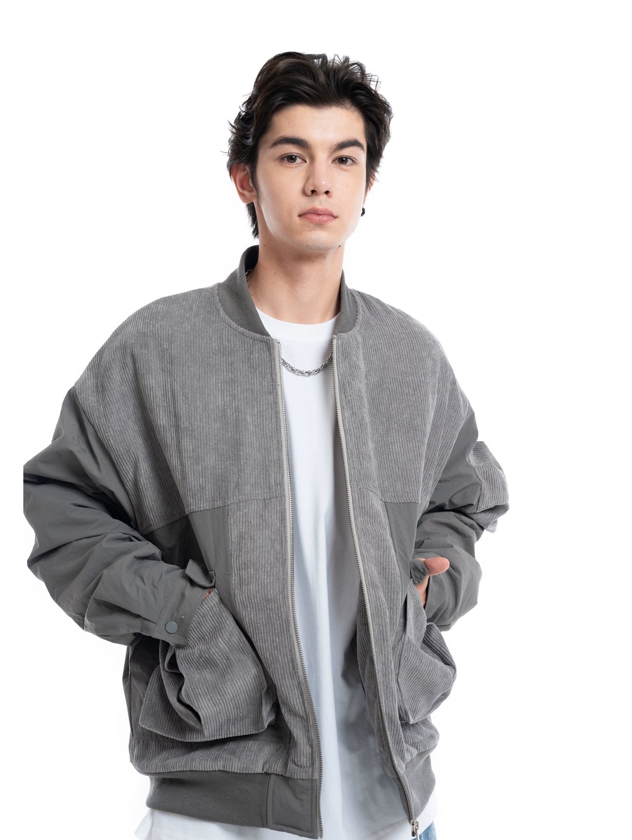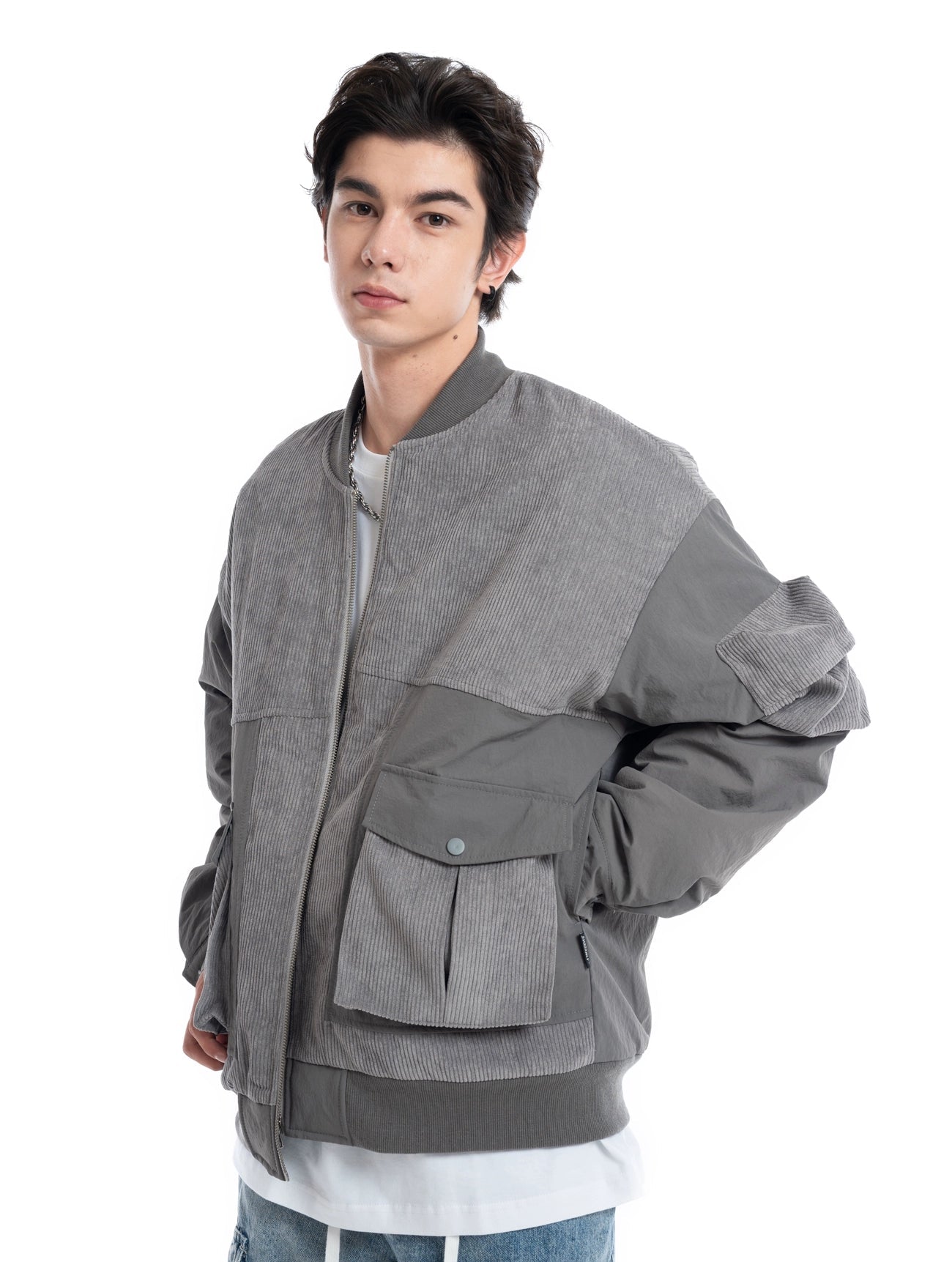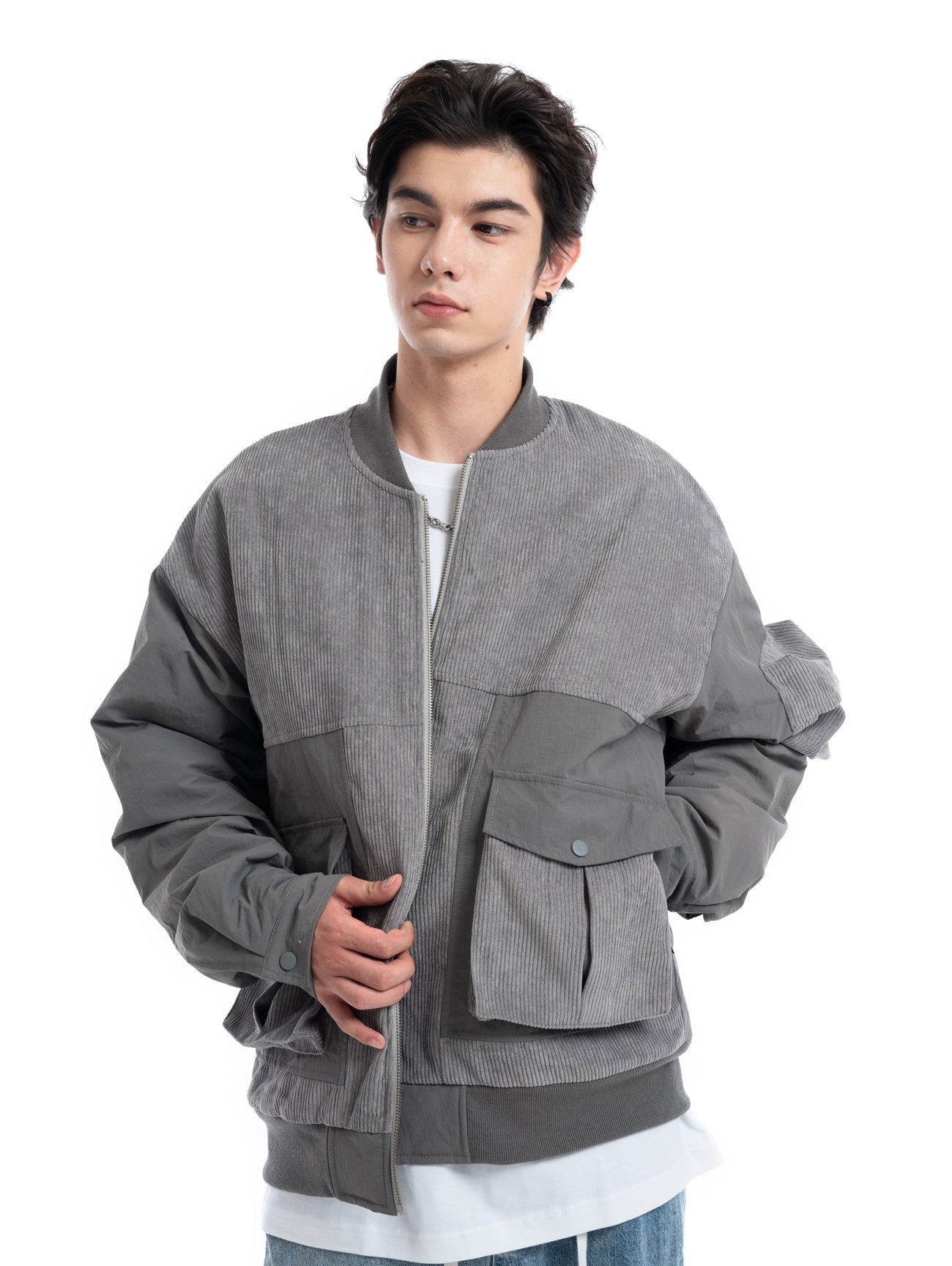 Patchwork Corduroy Bomber Jacket with Snap Pockets