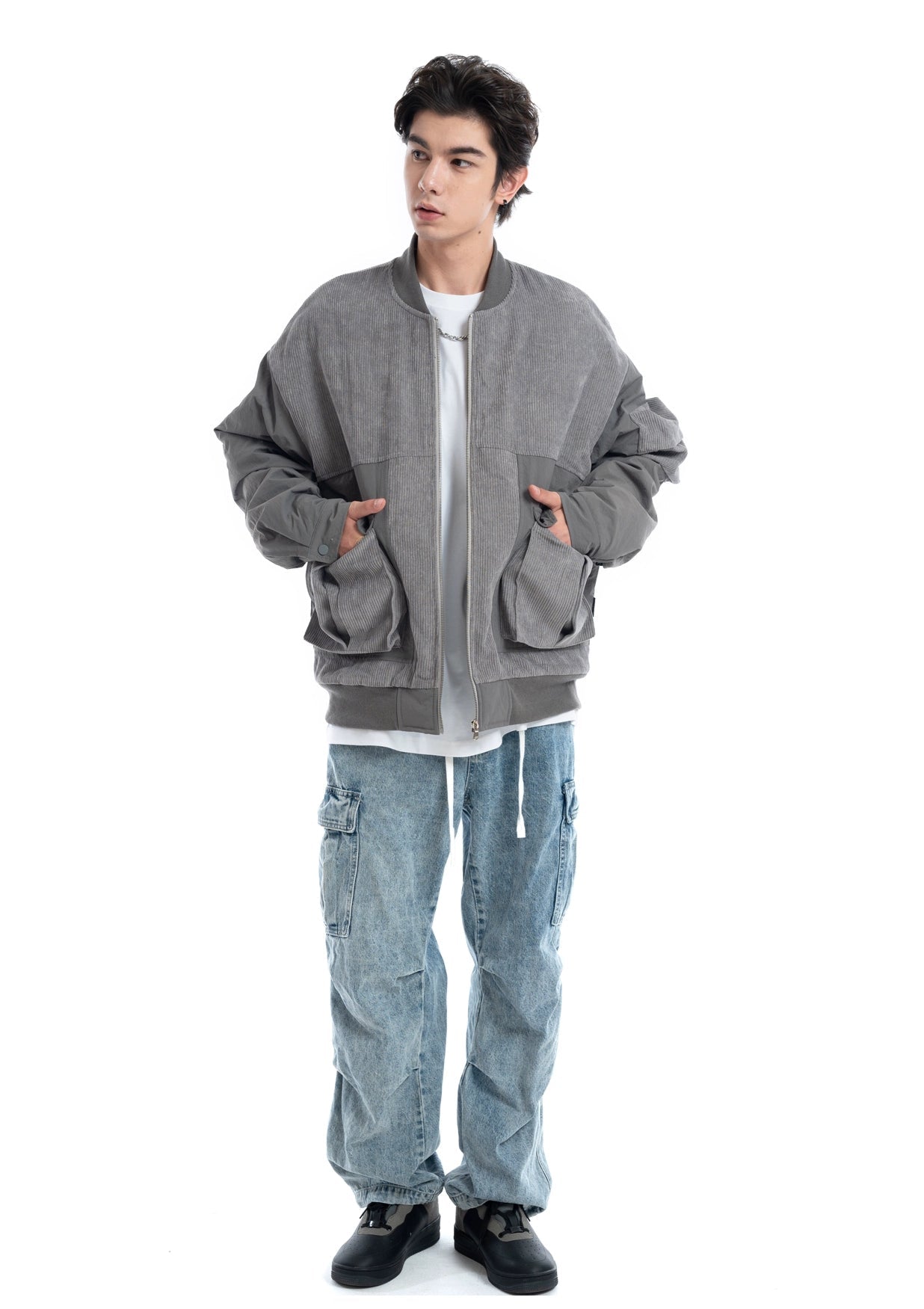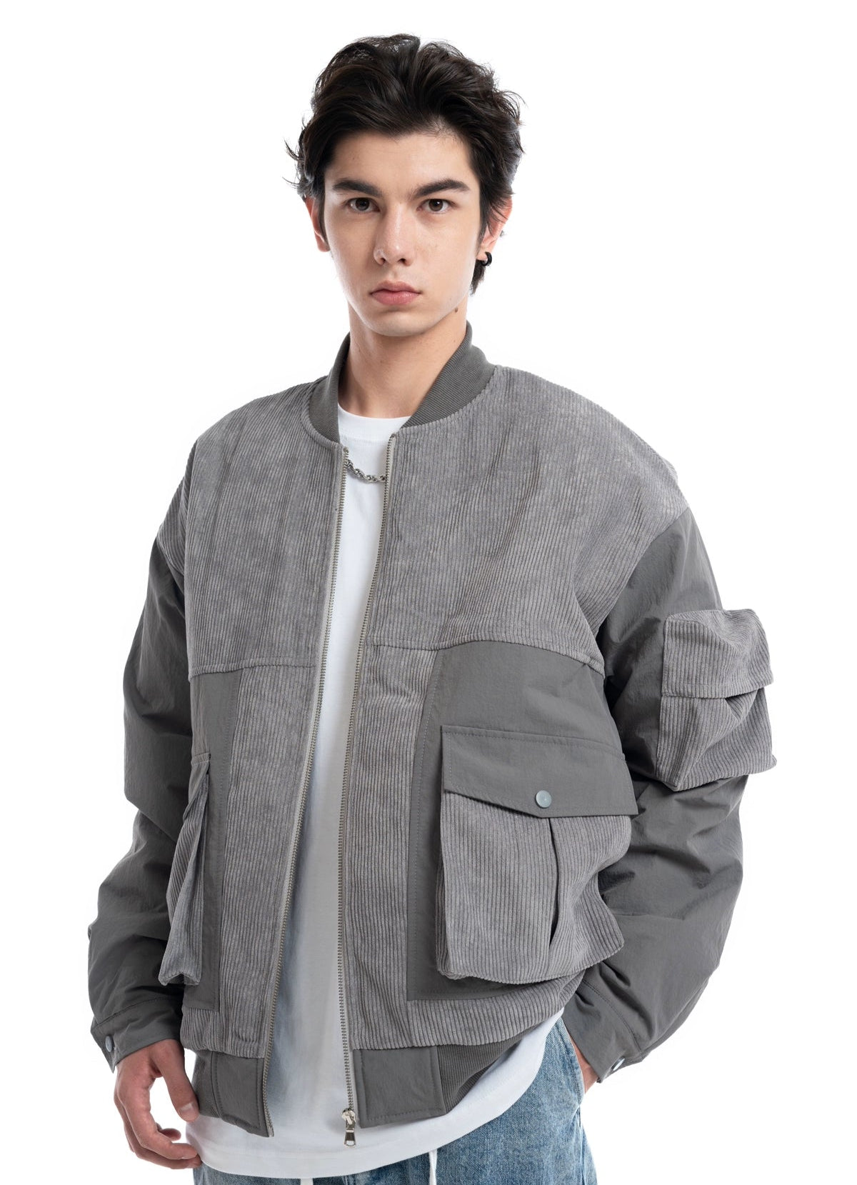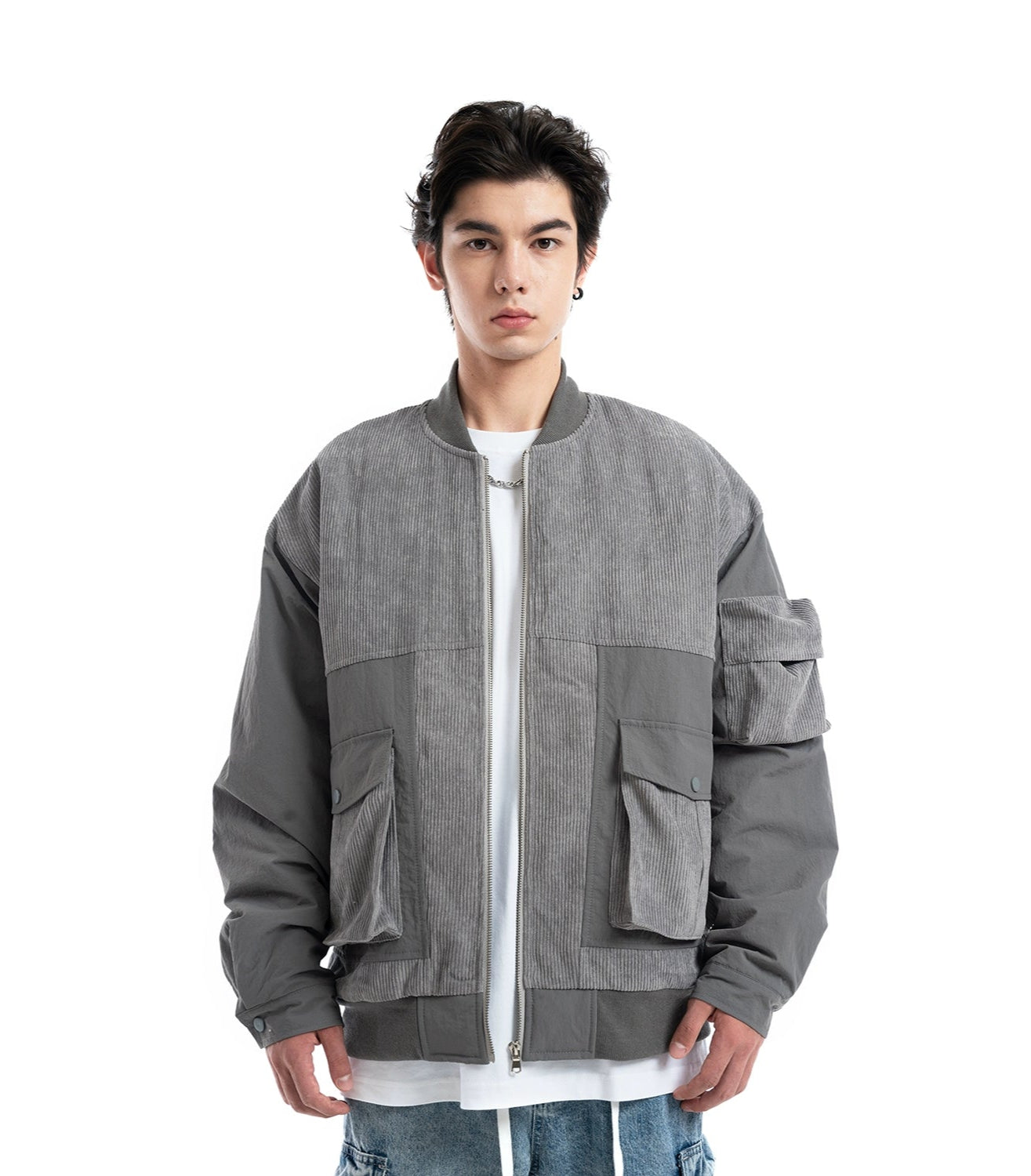 Patchwork Corduroy Bomber Jacket with Snap Pockets